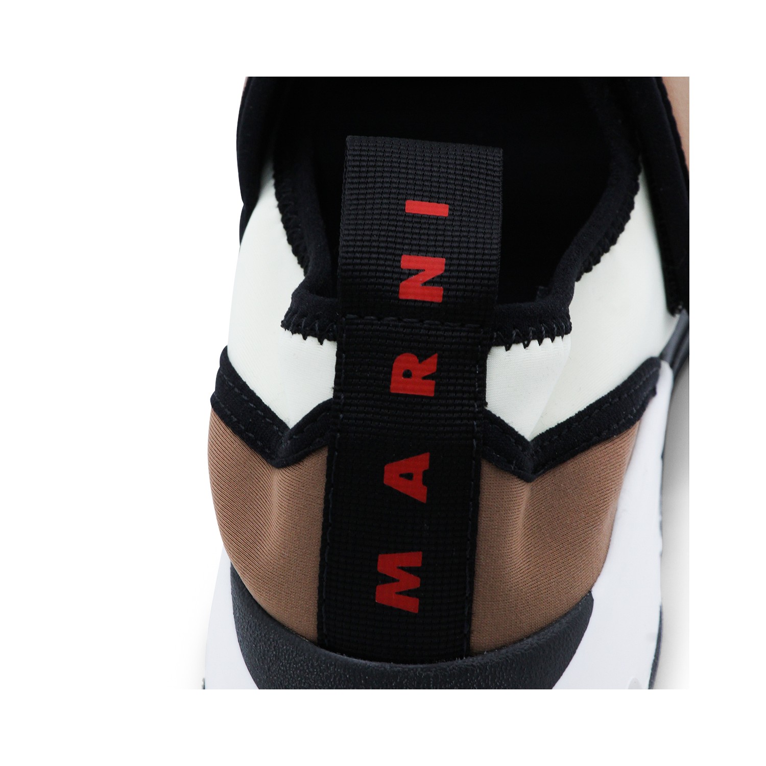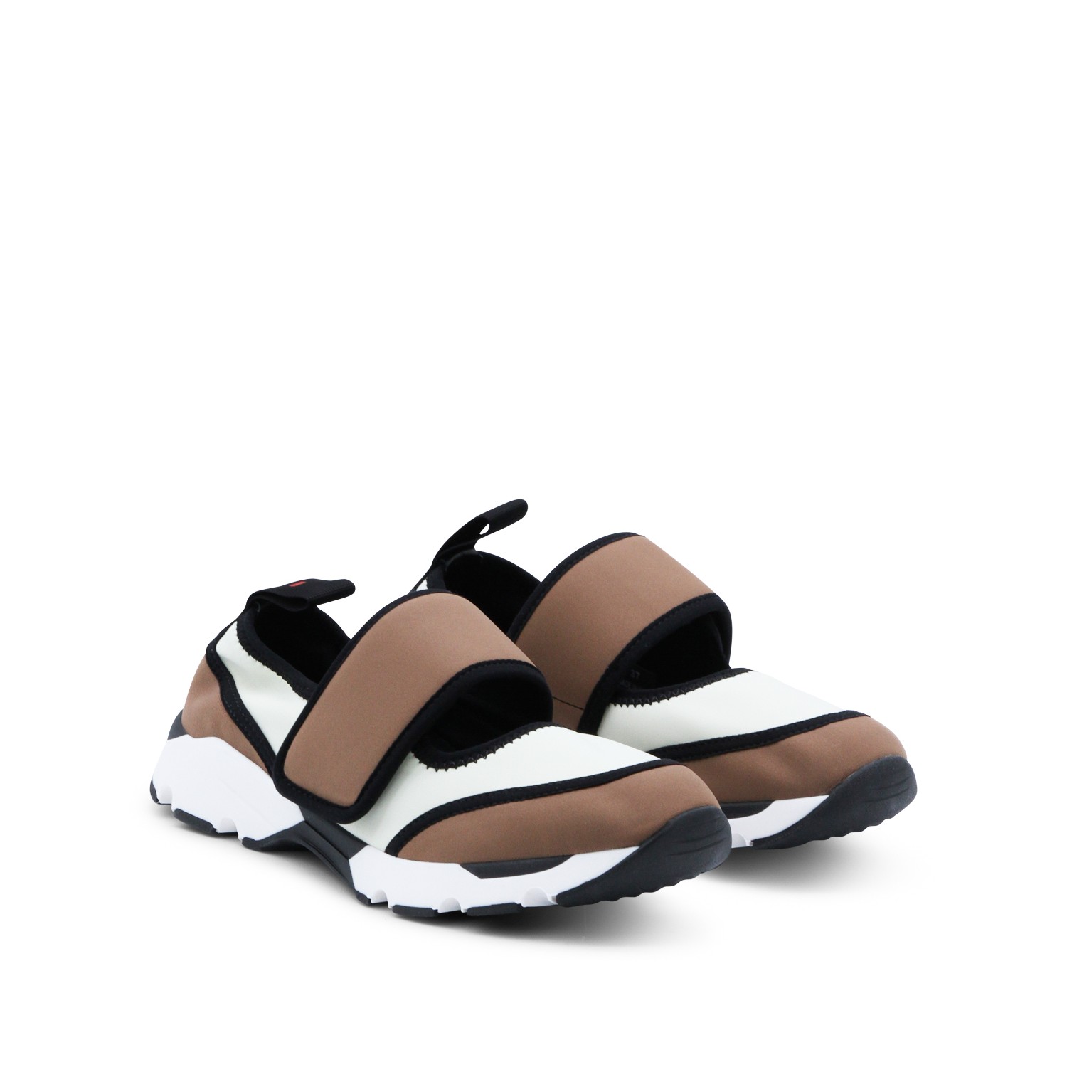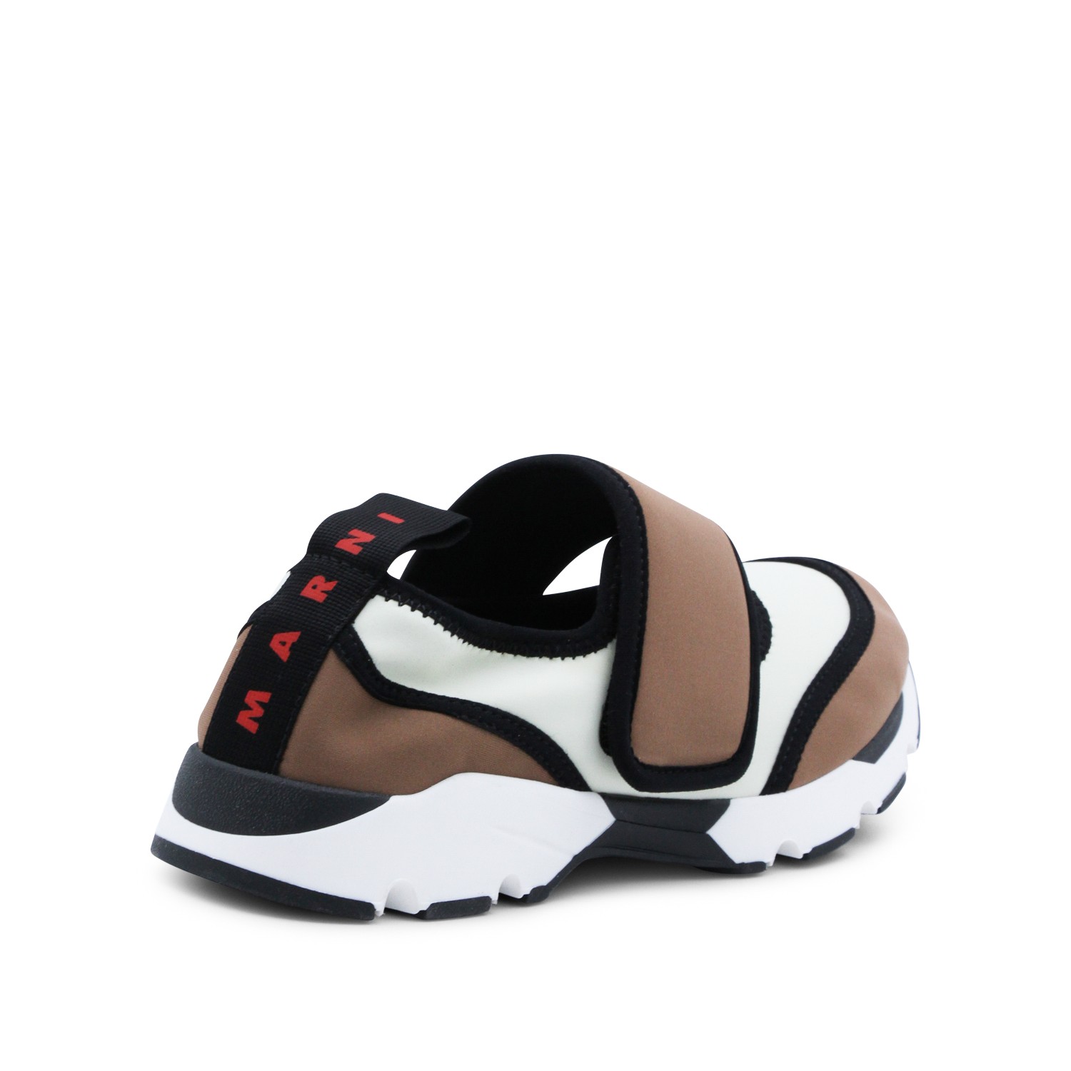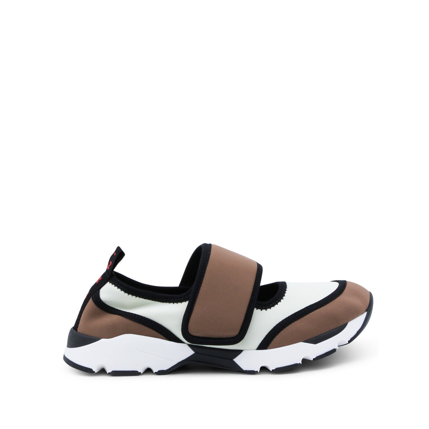 White and brown leather Mary Jane sneakers from Marni featuring round toe, slip-on style, velcro-closure band, contrasting trims, logo puller and rubber sole.