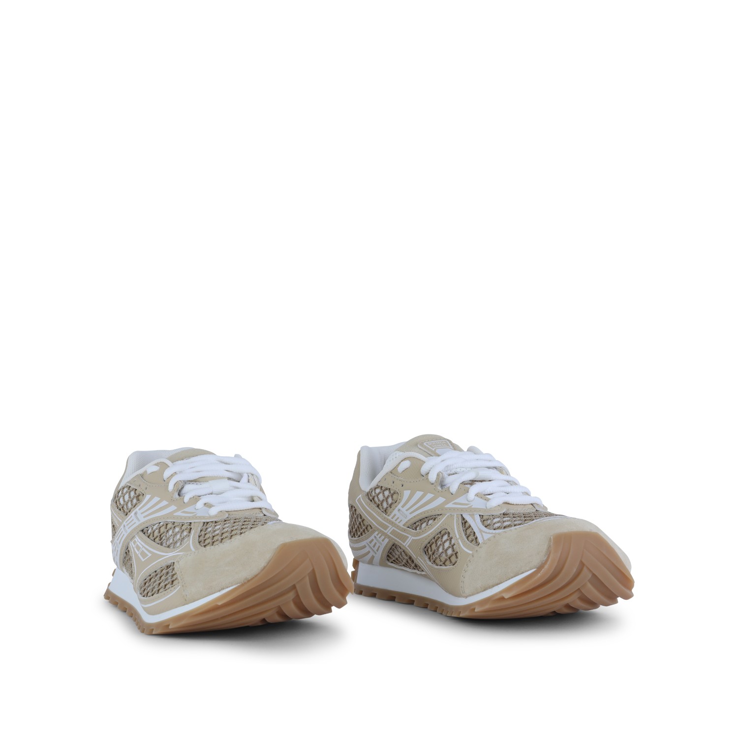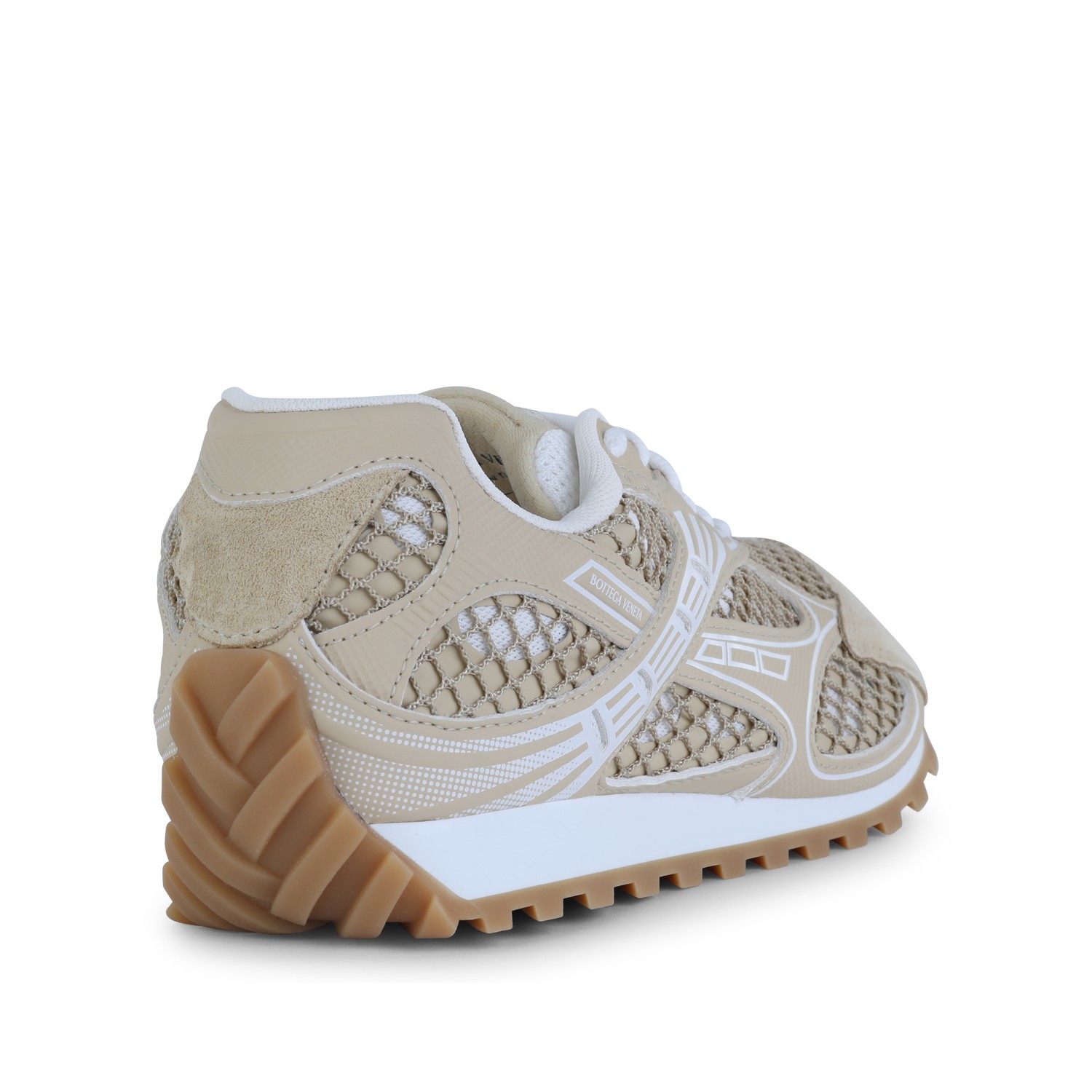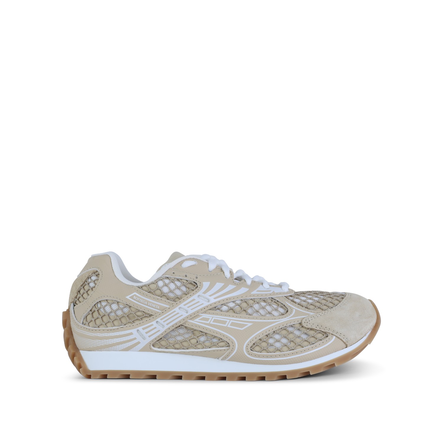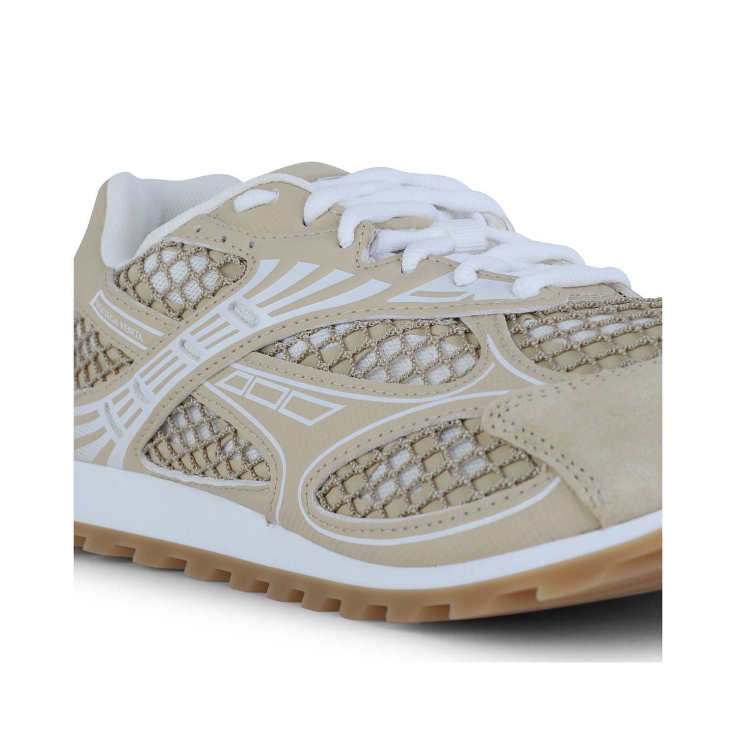 Beige leather Orbit sneakers from Bottega Veneta featuring round toe, cotton lace-up fastening, logo lable on the tongue, suede and mesh upper with fishnet inserts, rubber sole and contrasting outsole.