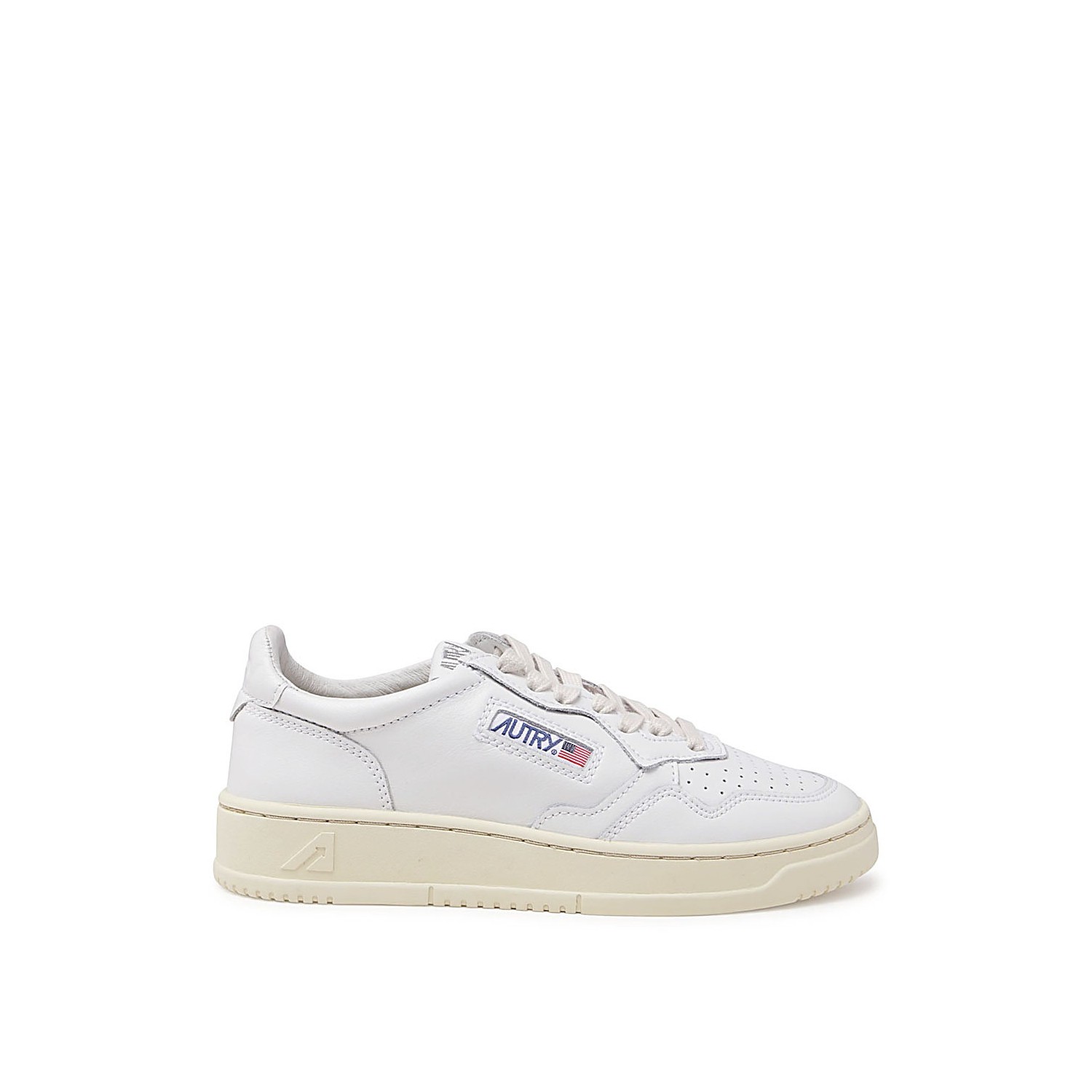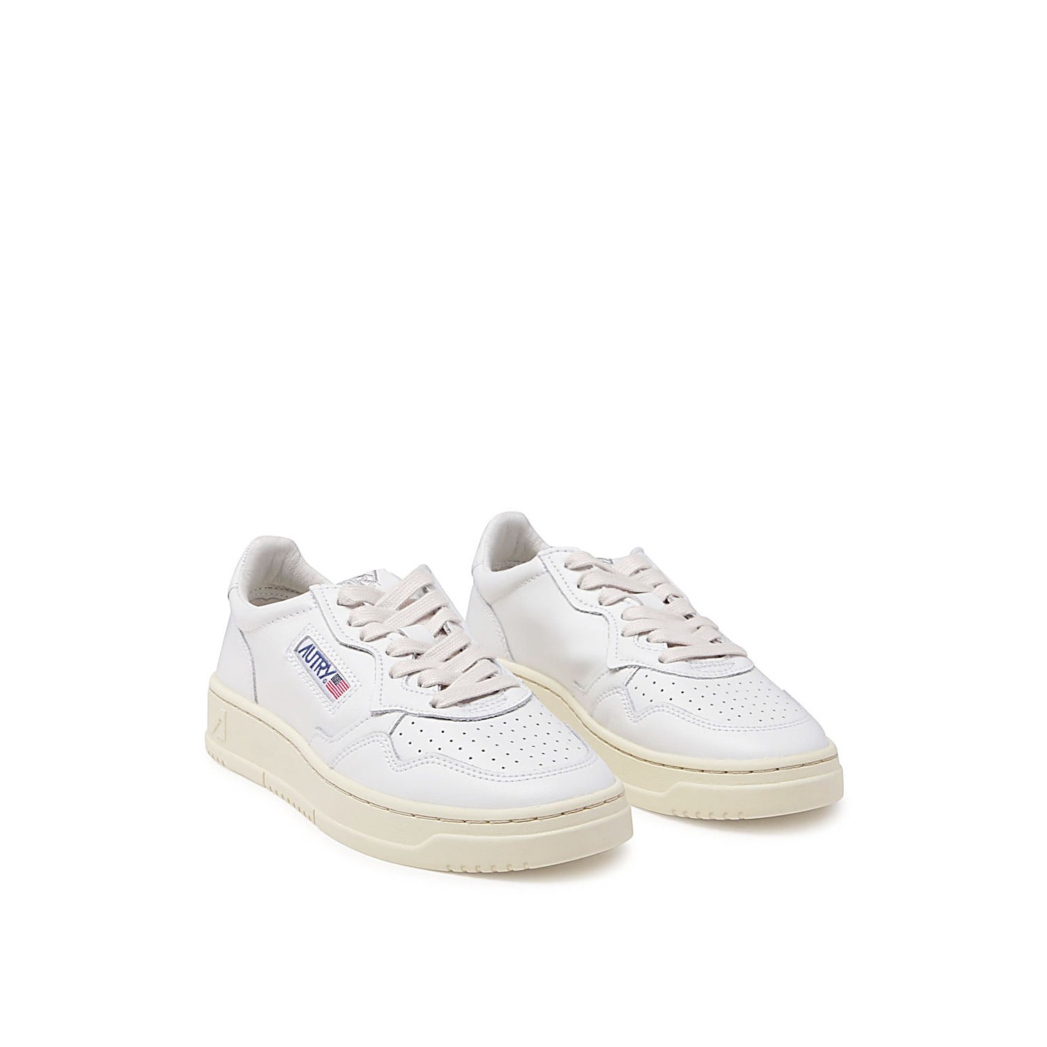 White leather Medalist Low sneakers from Autry featuring round toe, cotton lace-up fastening, embroidery label on the tongue, padded collar, laterla logo patch and rubber sole.