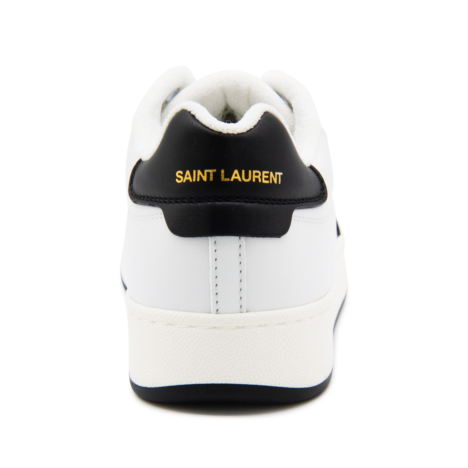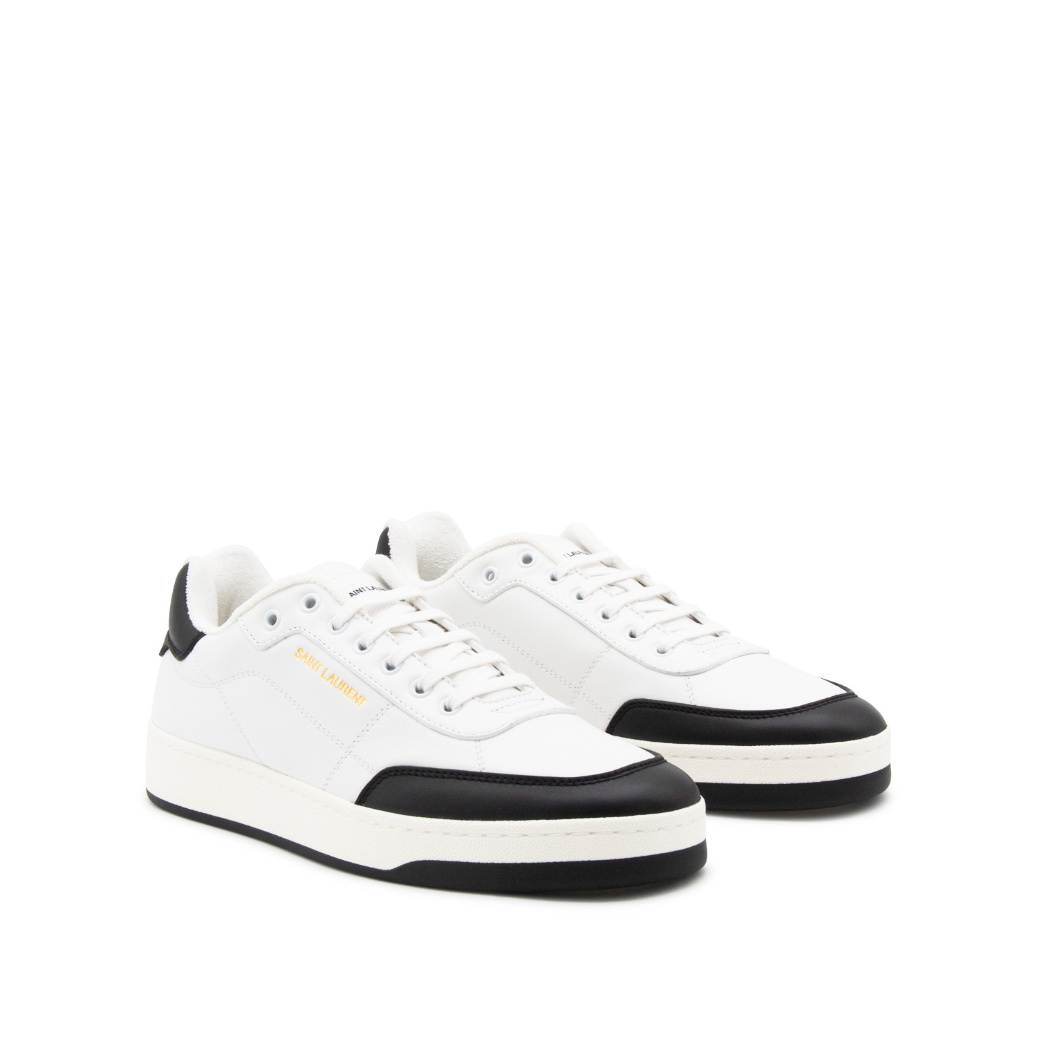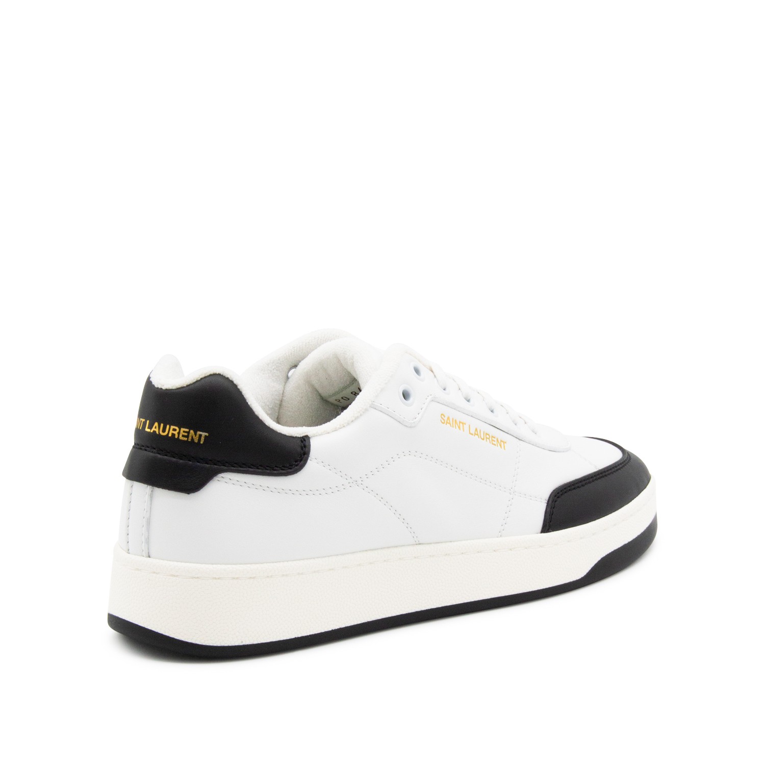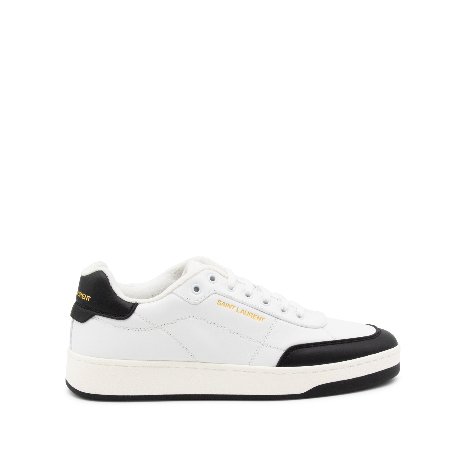 White and black leather sneakers from Saint Laurent featuring round toe, cotton laces fastening, lateral logo print, contrasting heel counter with logo, branded insole and rubber sole.