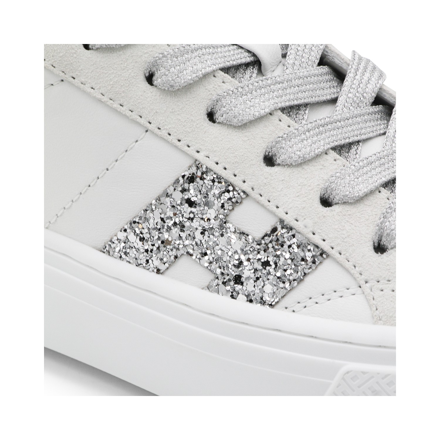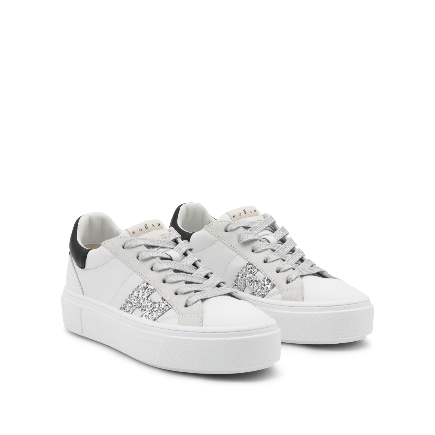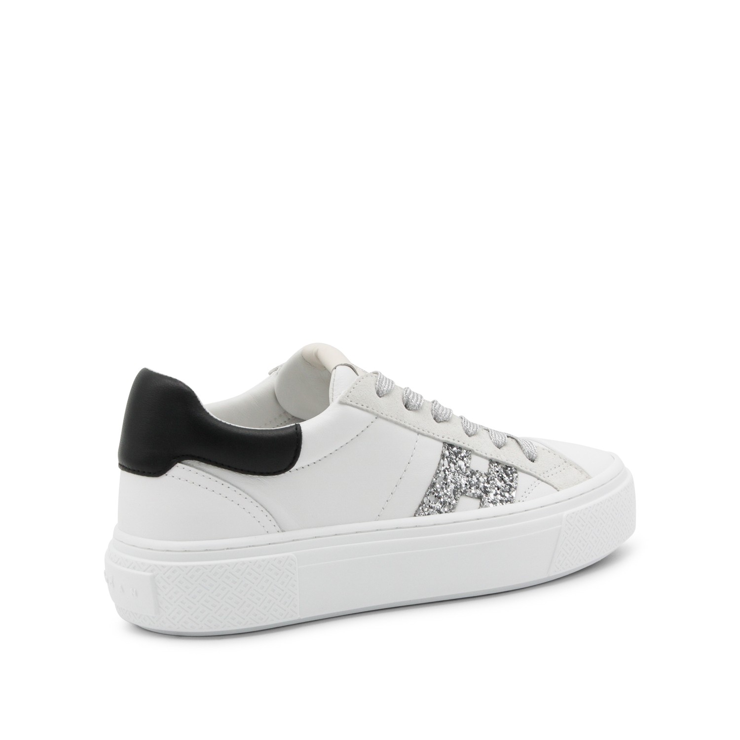 White and black leather sneakers from Hogan featuring round toe, lace up fastening, lateral logo and rubber sole.