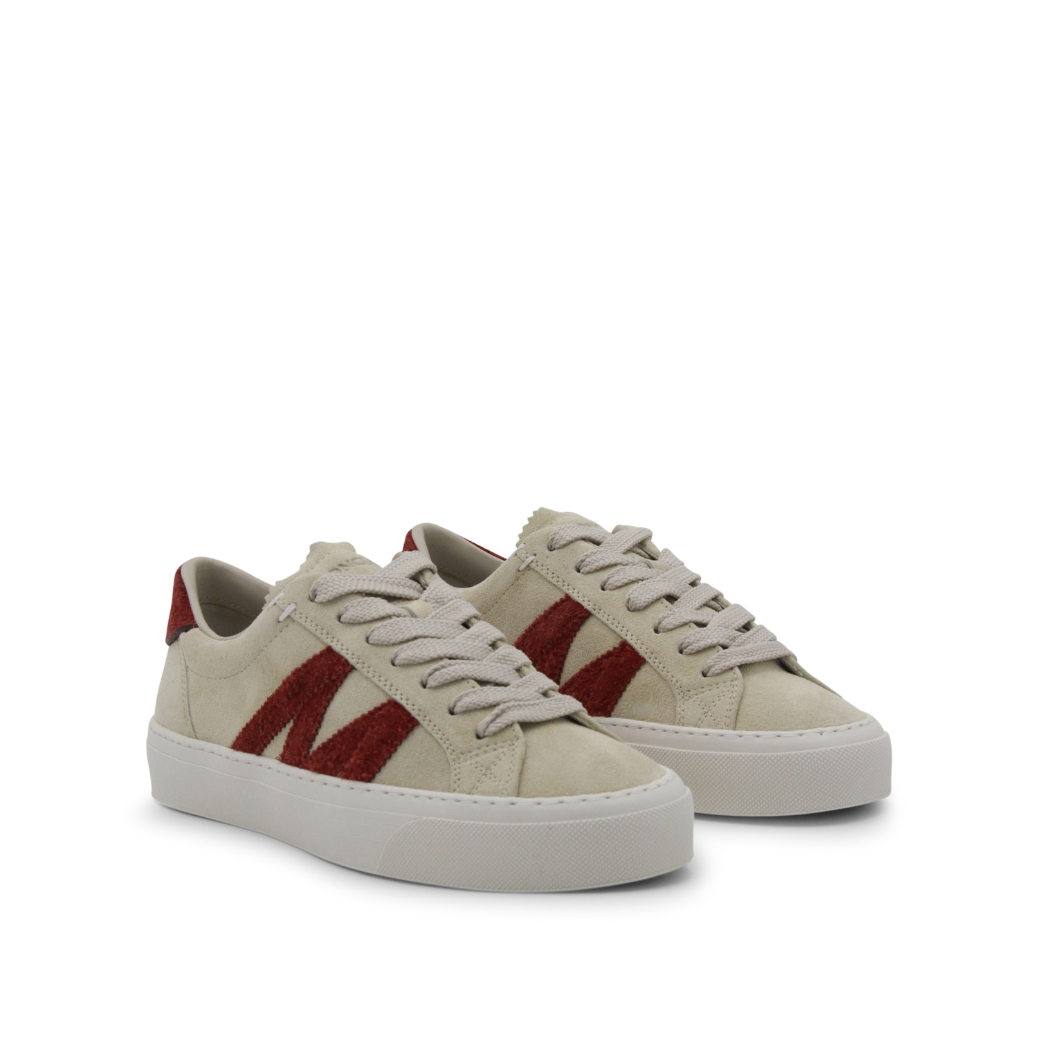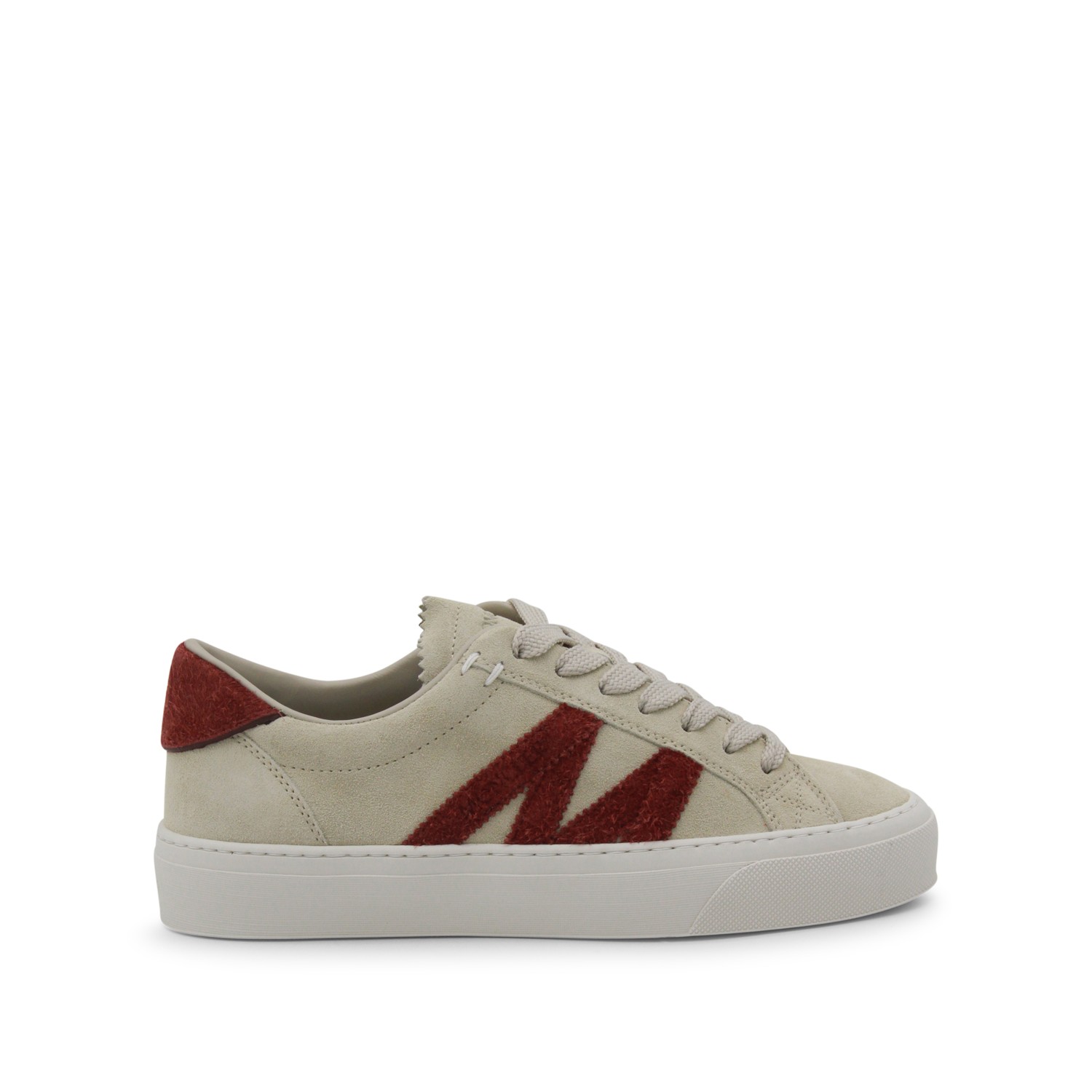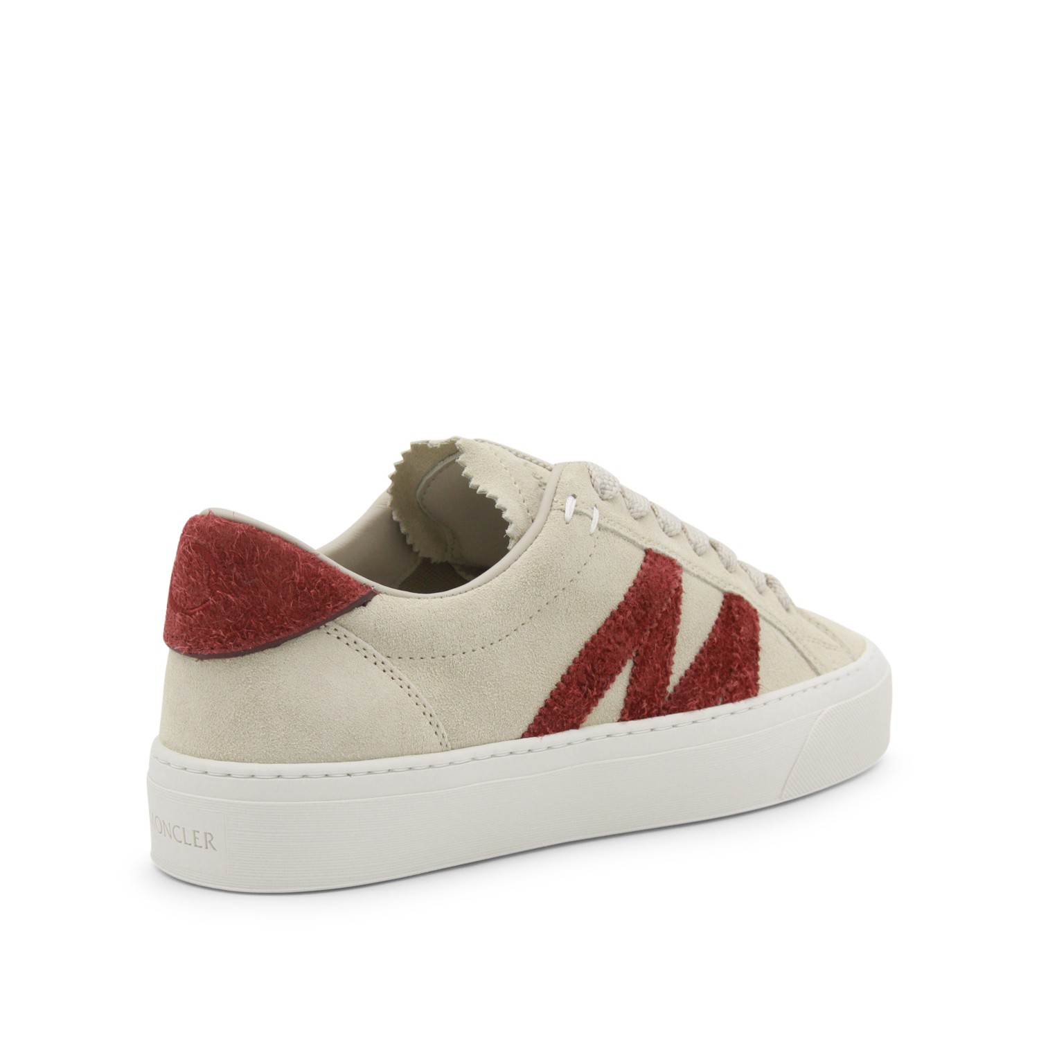 Beige and burgundy leather Monaco 2 sneakers from Moncler featuring round toe, cotton lace-up fastenin, fur monogram application, contrasting heel tab and rubber sole.