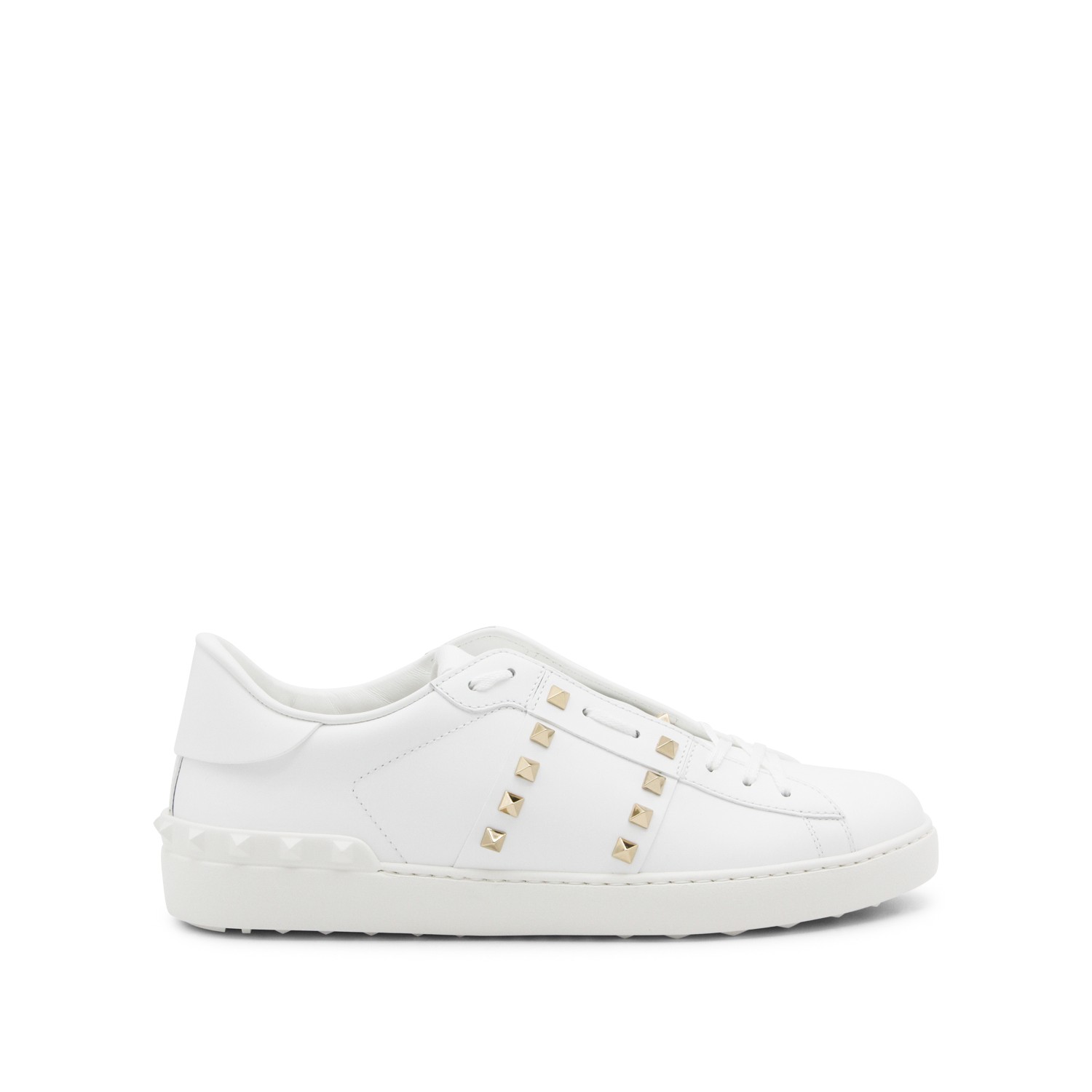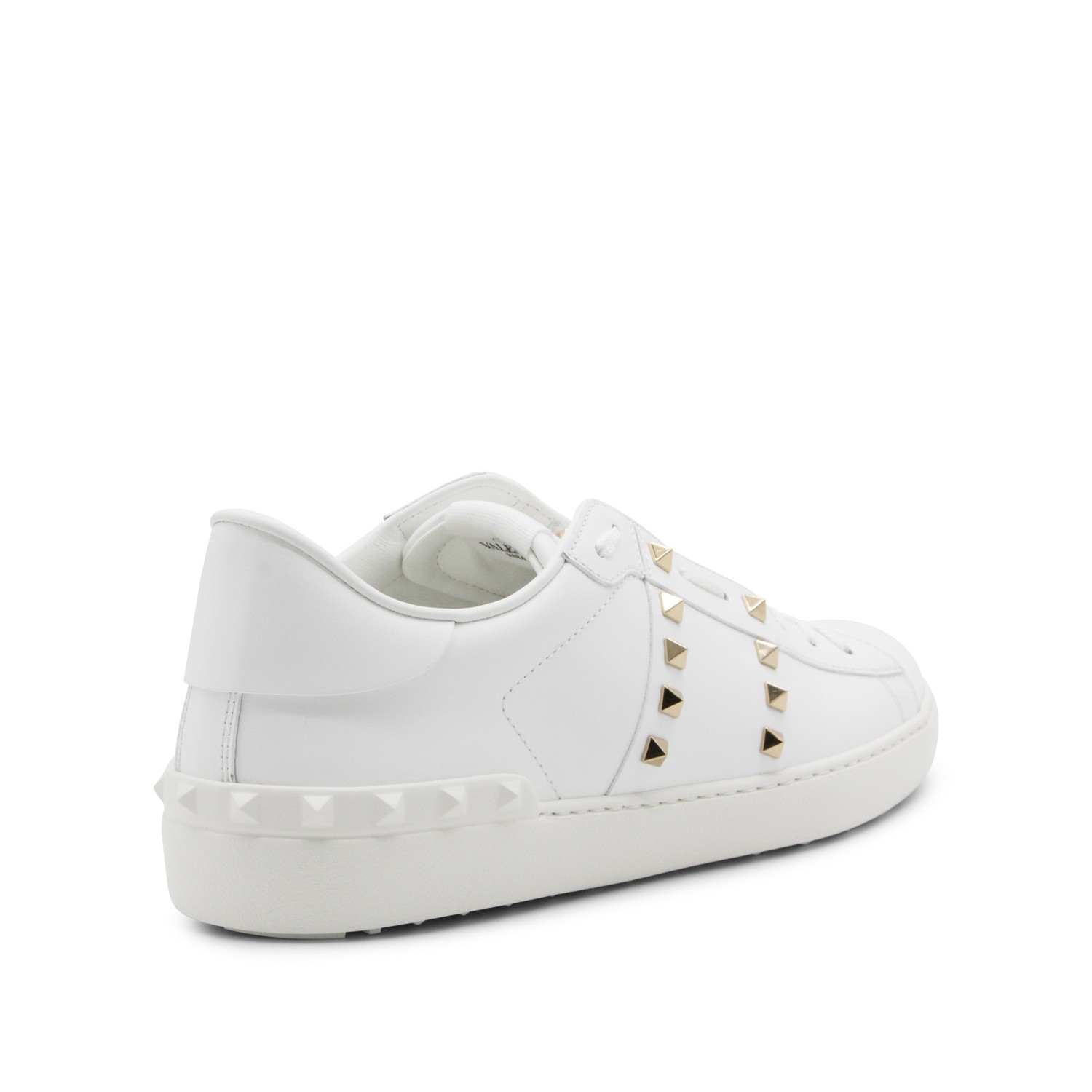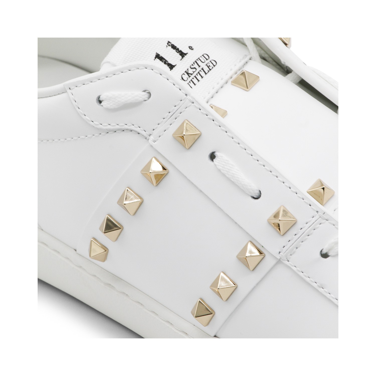 White leather open sneakers from Valentino Garavani featuring round toe, cotton lace up fastening, studs details and leather sole.