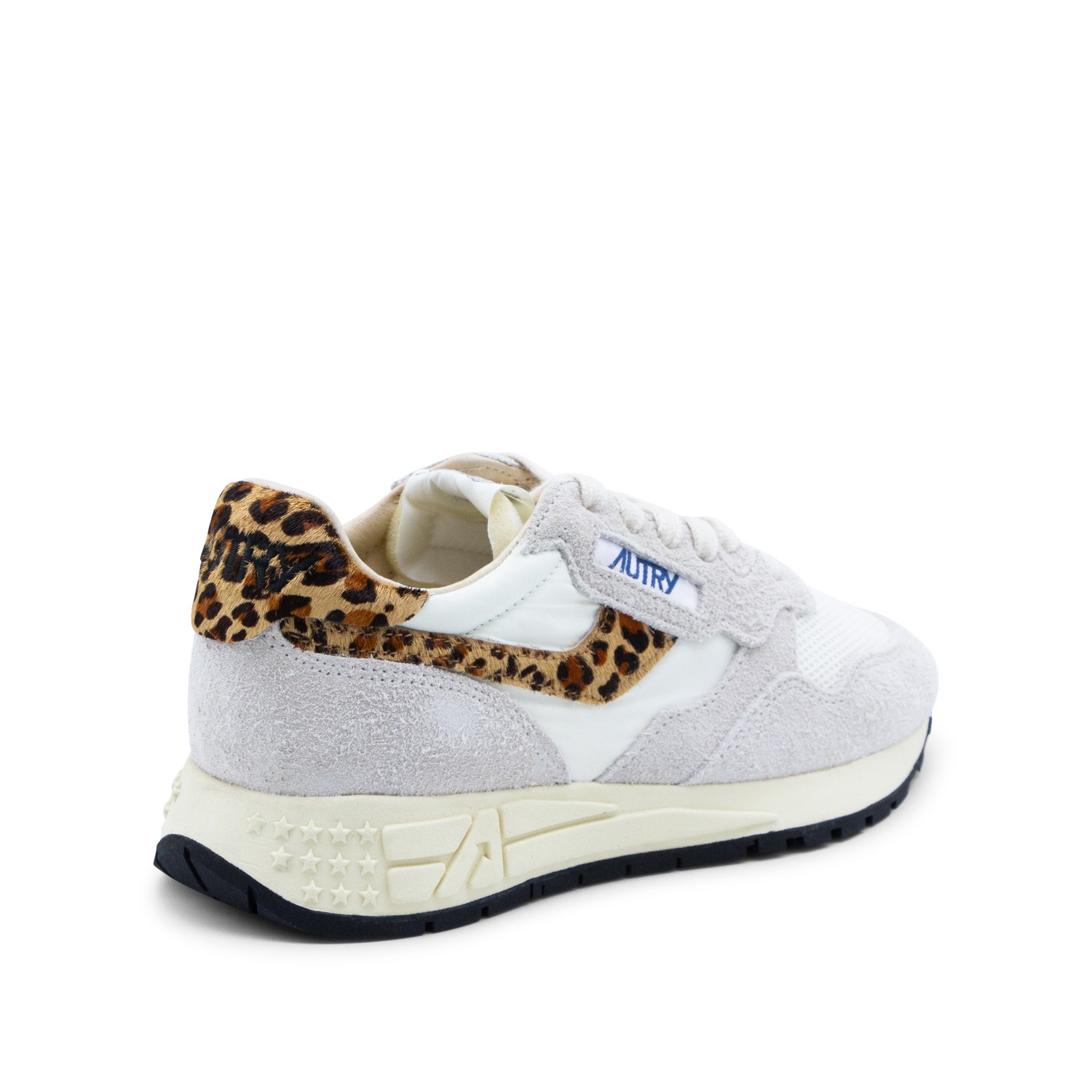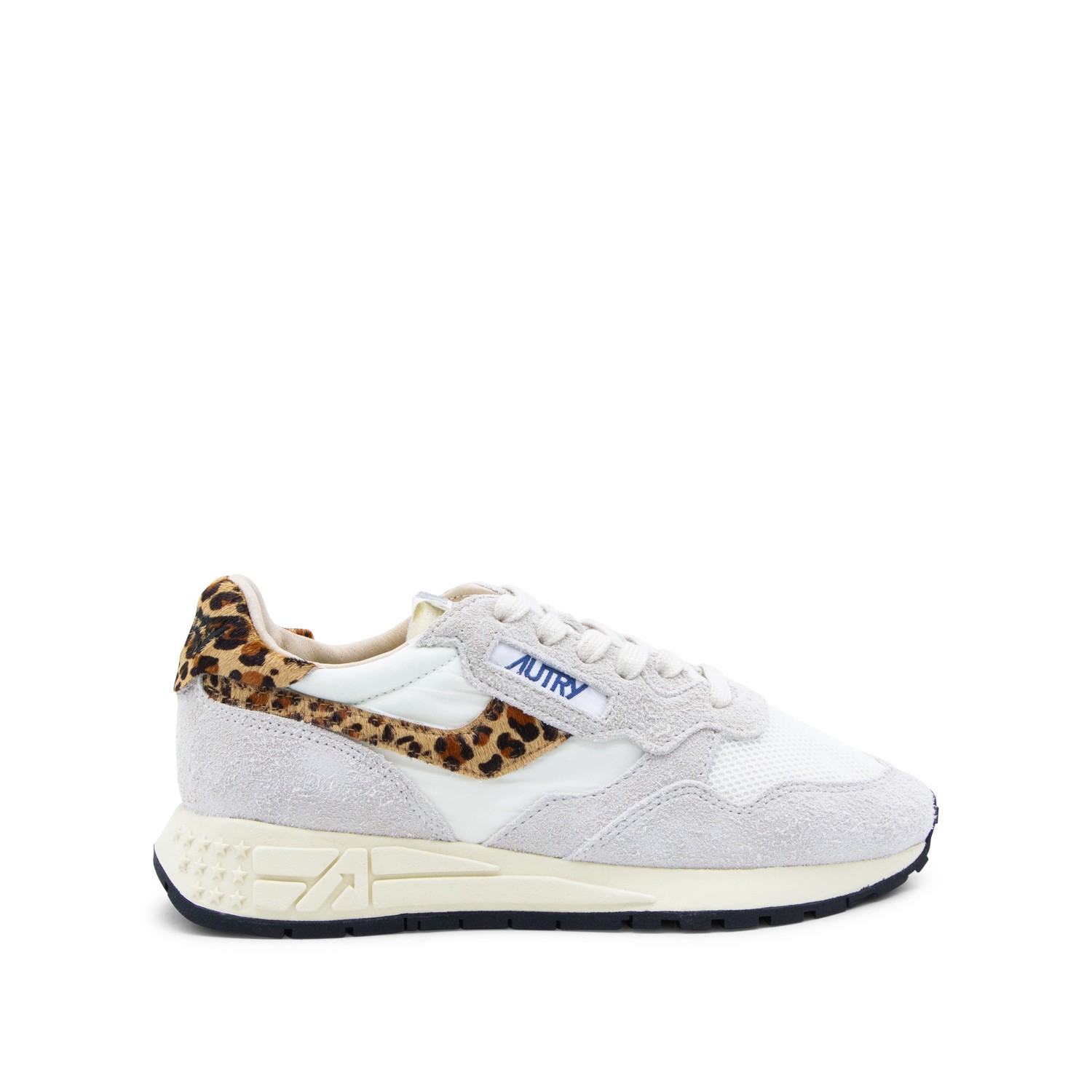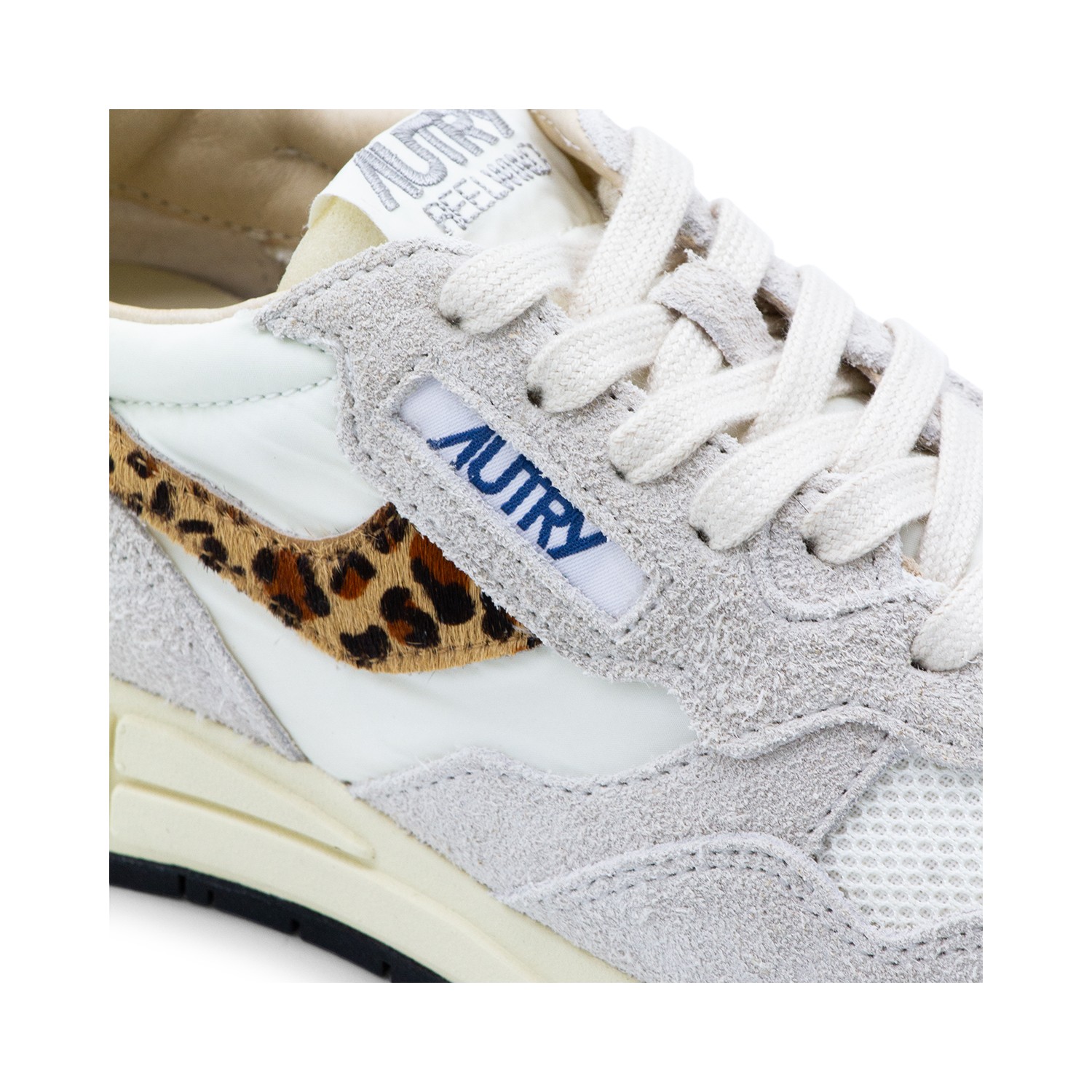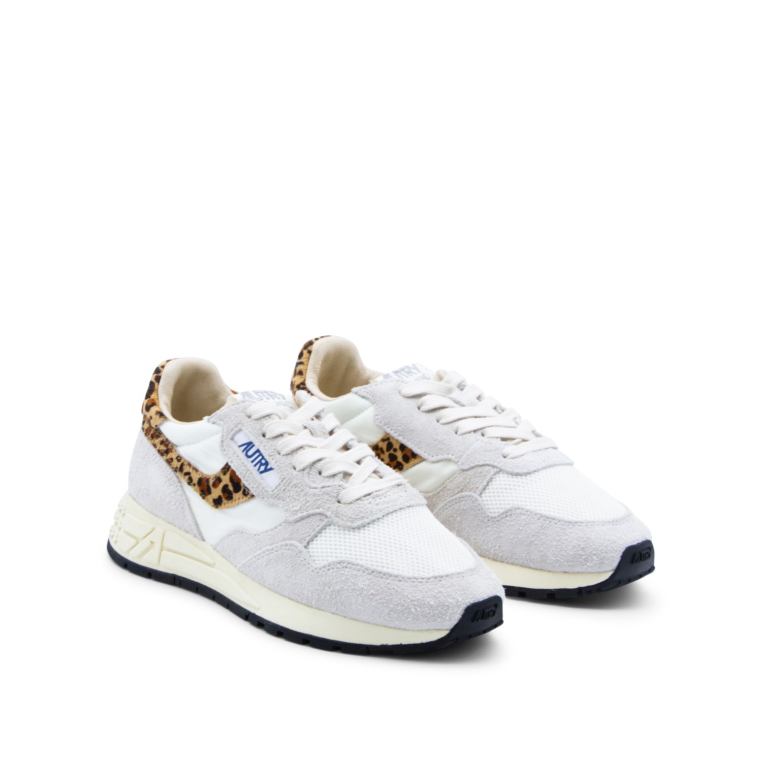 White and leopard leather Reelwind sneakers from Autry featuring round toe, cotton lace-up fastening, label on the tongue, leopard print details and rubber sole.