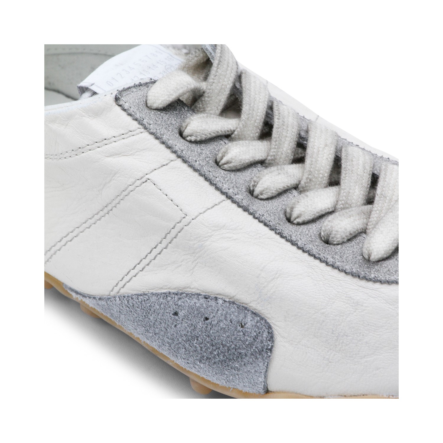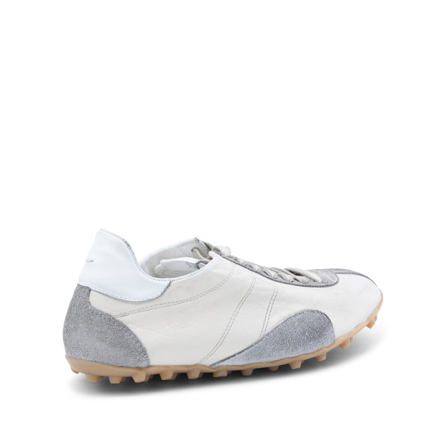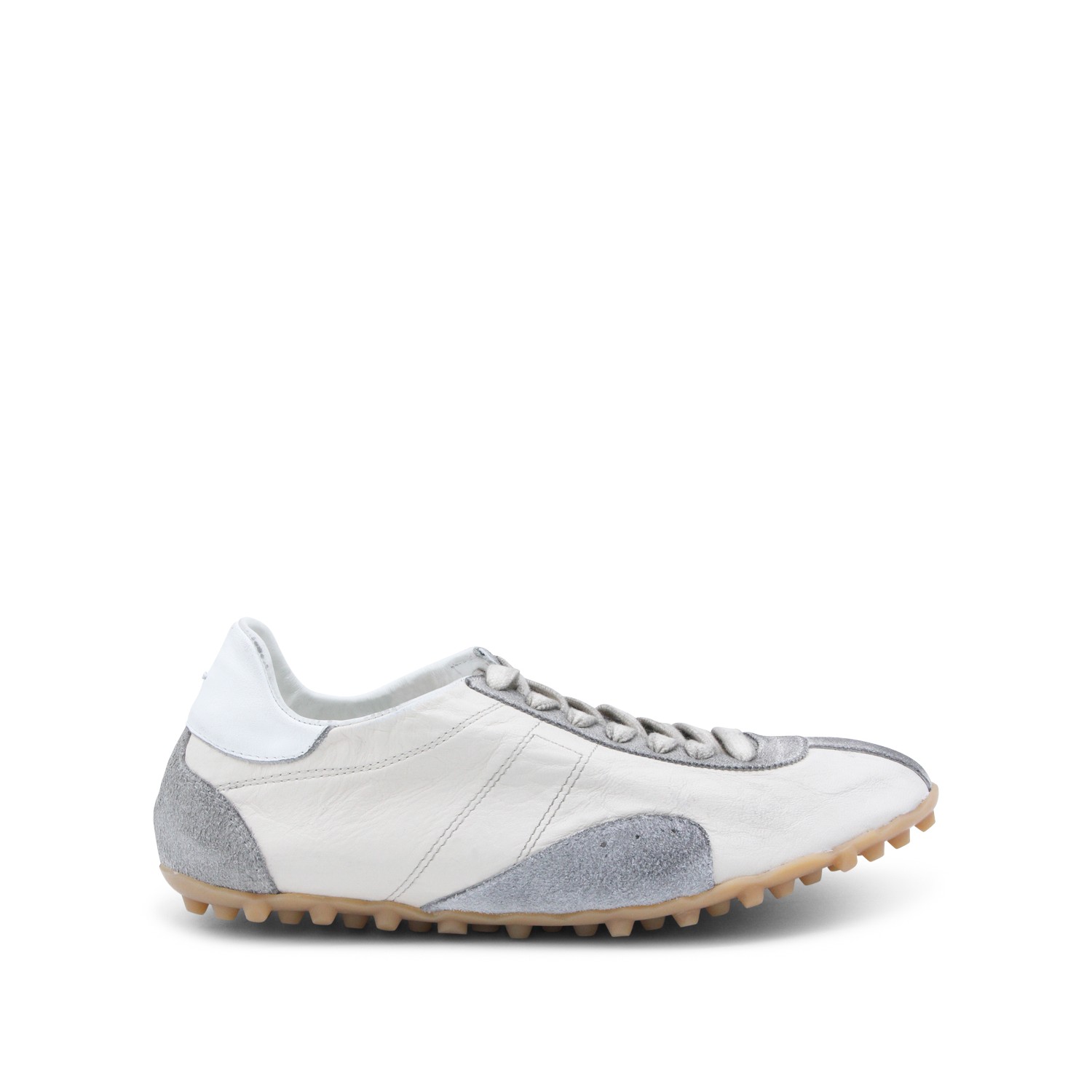 White and grey leather Sprinter Low sneakers from Maison Margiela featuring round toe, cotton lace-up fastening, central stripe, logo label on the tongue, white stitching on the back and studded rubber sole.