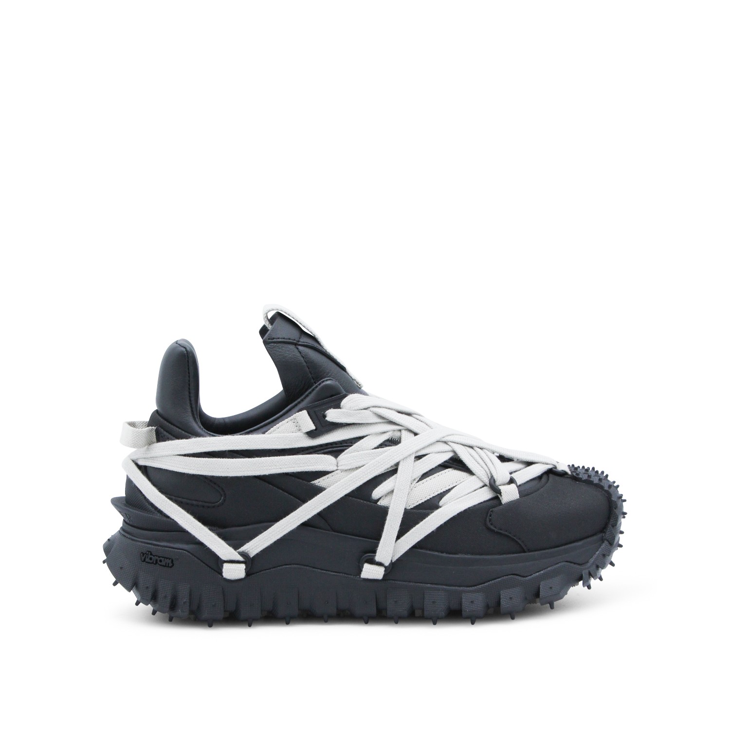 Black leather Trailgrip Megalace sneakers from Moncler + Rick Owens featuring pointed toe, Megalace clsoure, mesh lining and Vibram Megagrip rubber sole.