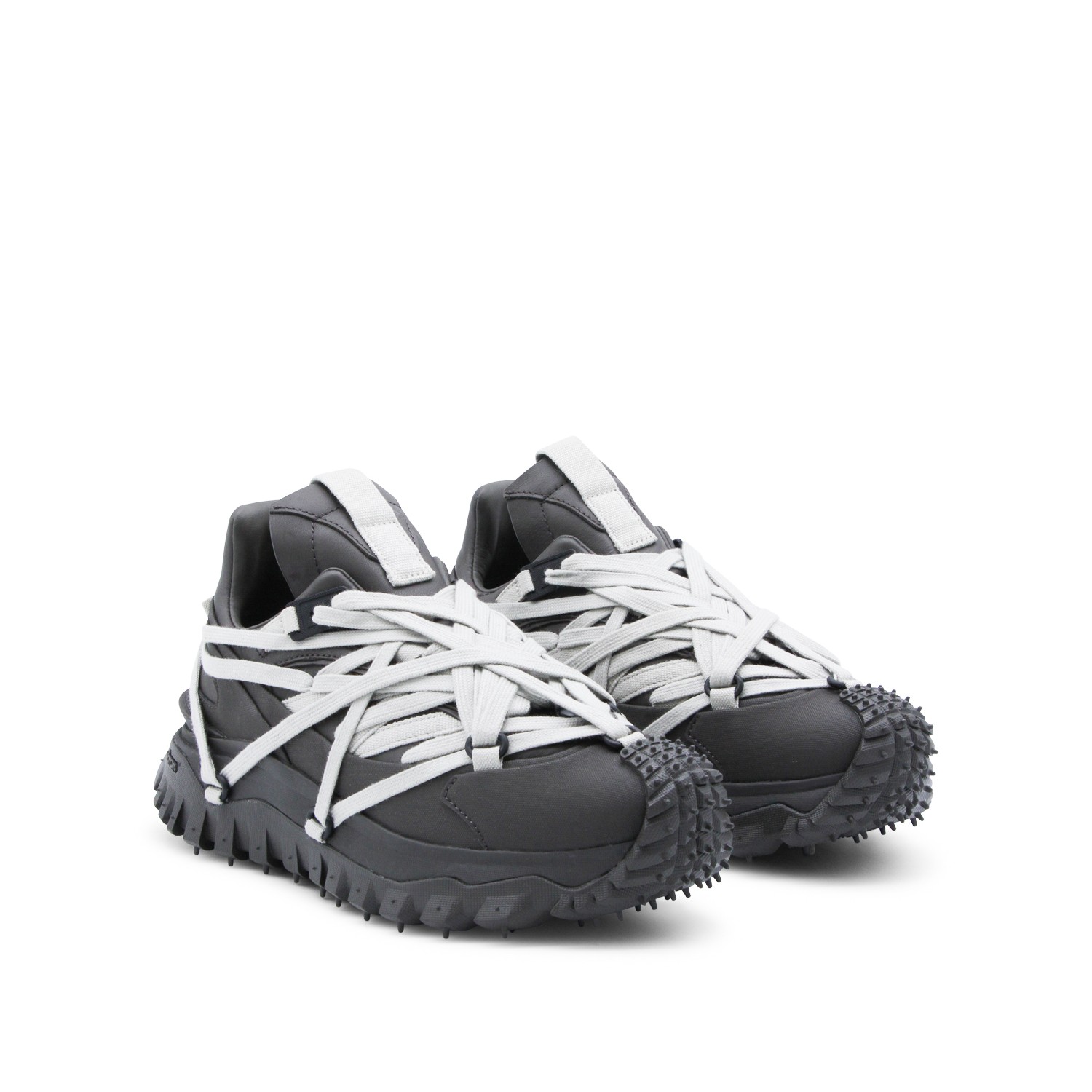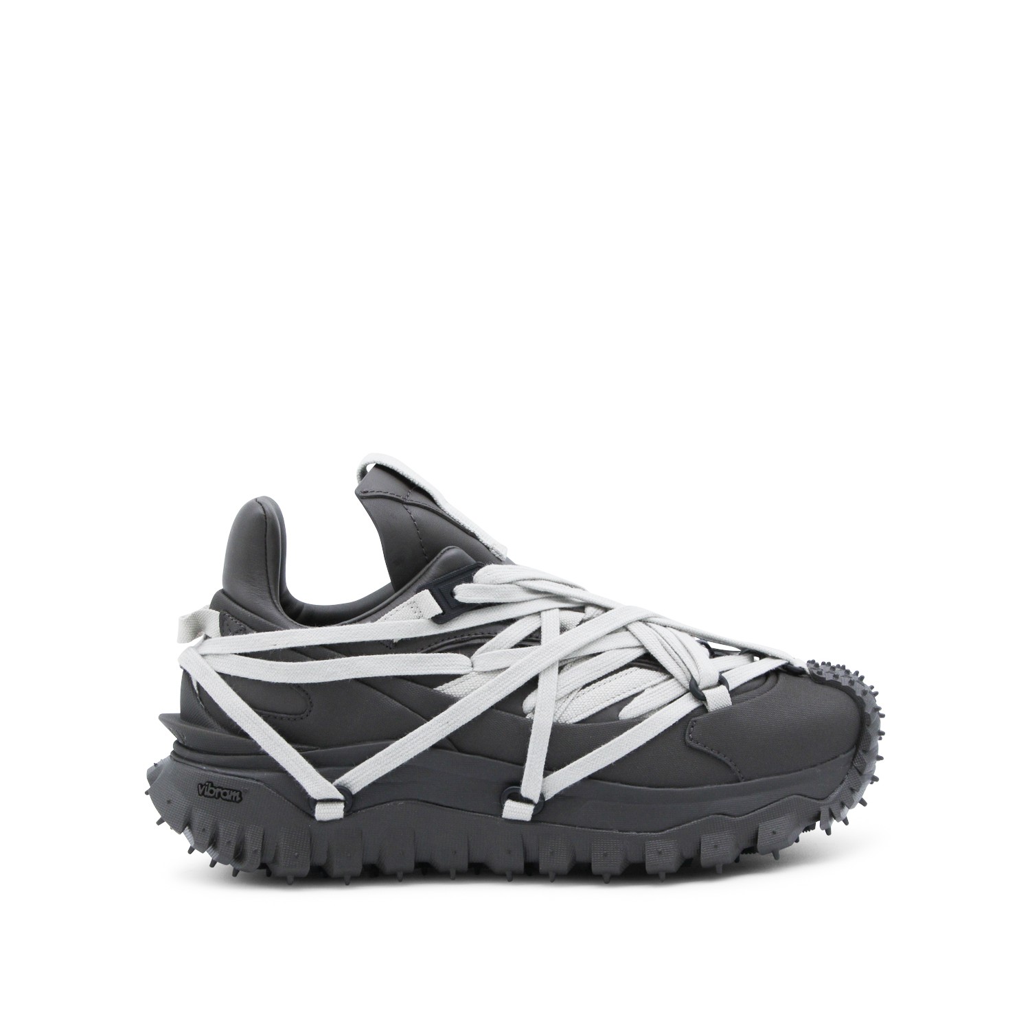 Dark grey leather Trailgrip Megalace sneakers from Moncler + Rick Owens featuring pointed toe, Megalace clsoure, mesh lining and Vibram Megagrip rubber sole.