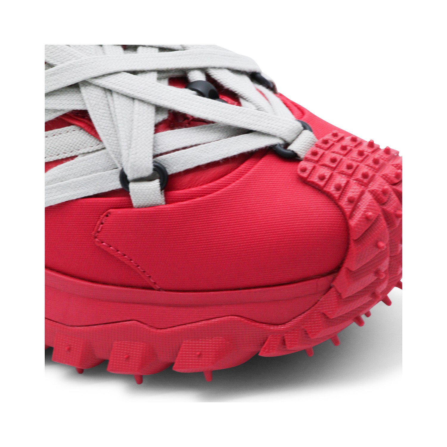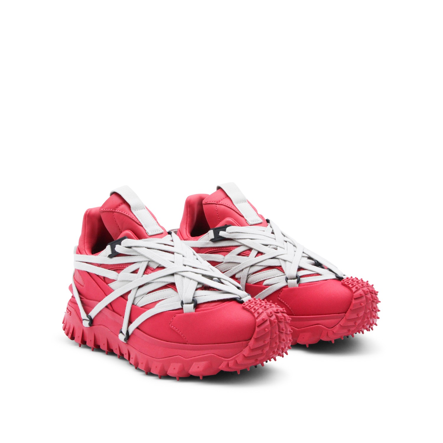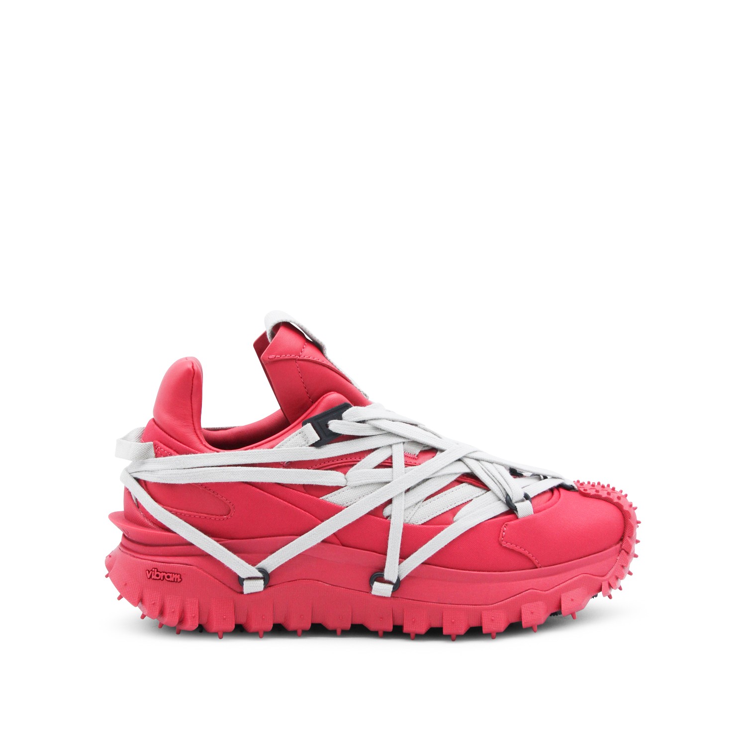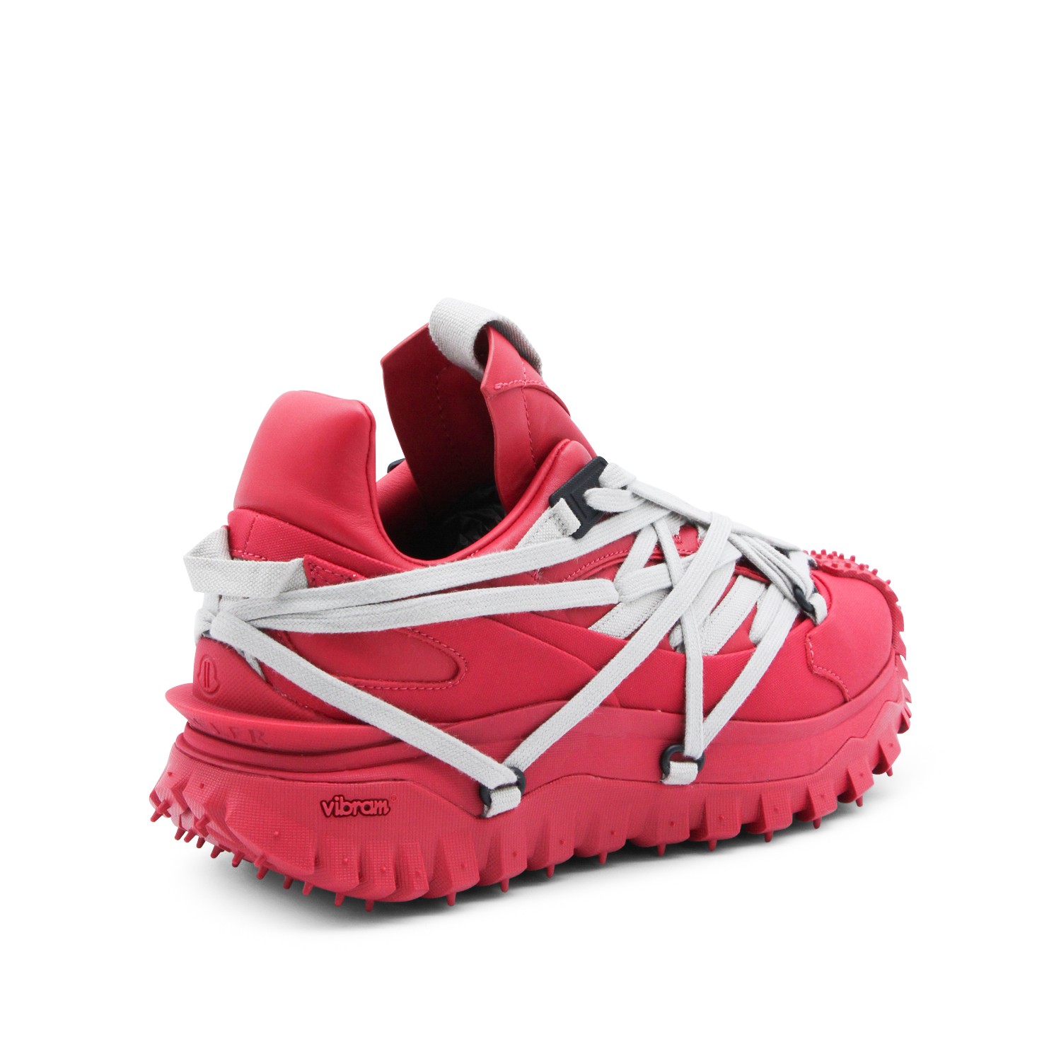 Red leather Trailgrip Megalace sneakers from Moncler + Rick Owens featuring pointed toe, Megalace clsoure, mesh lining and Vibram Megagrip rubber sole.