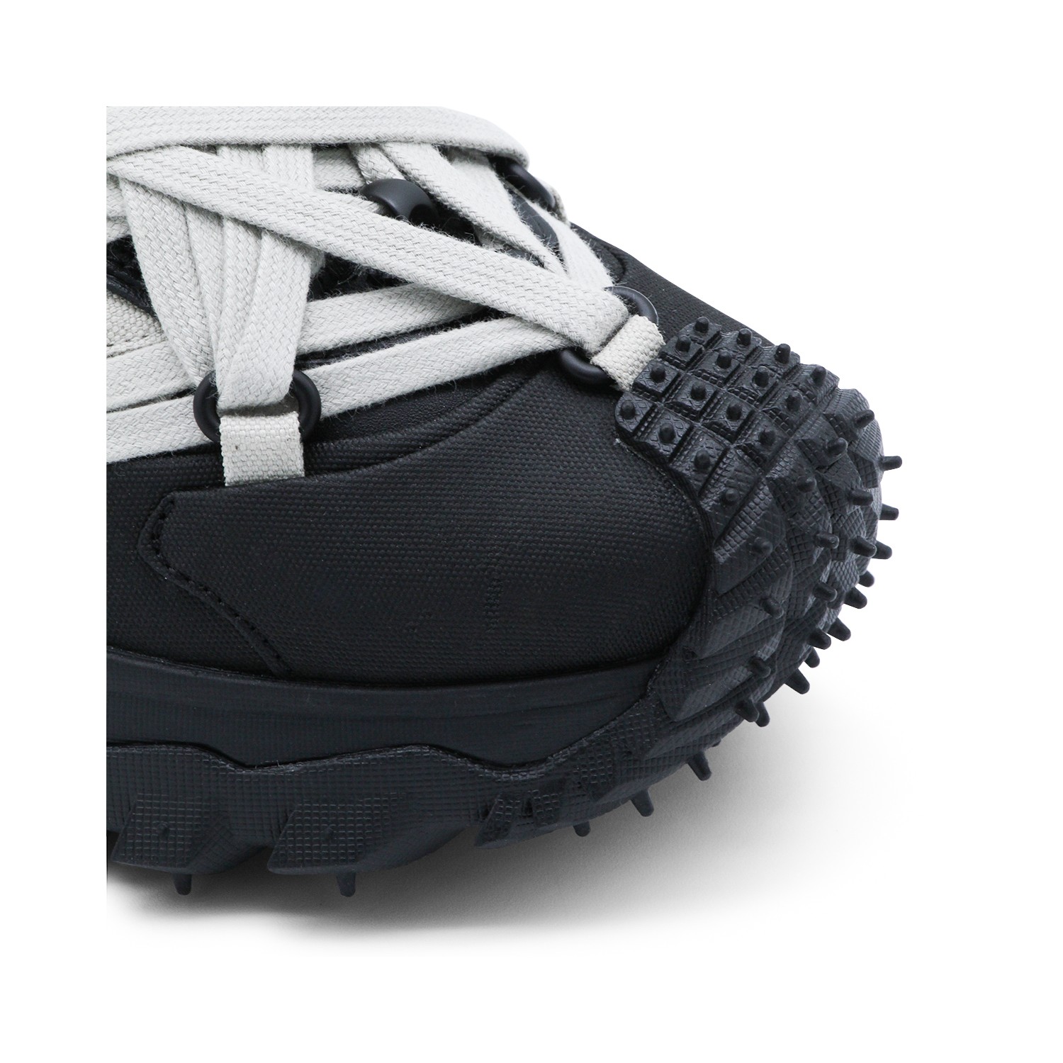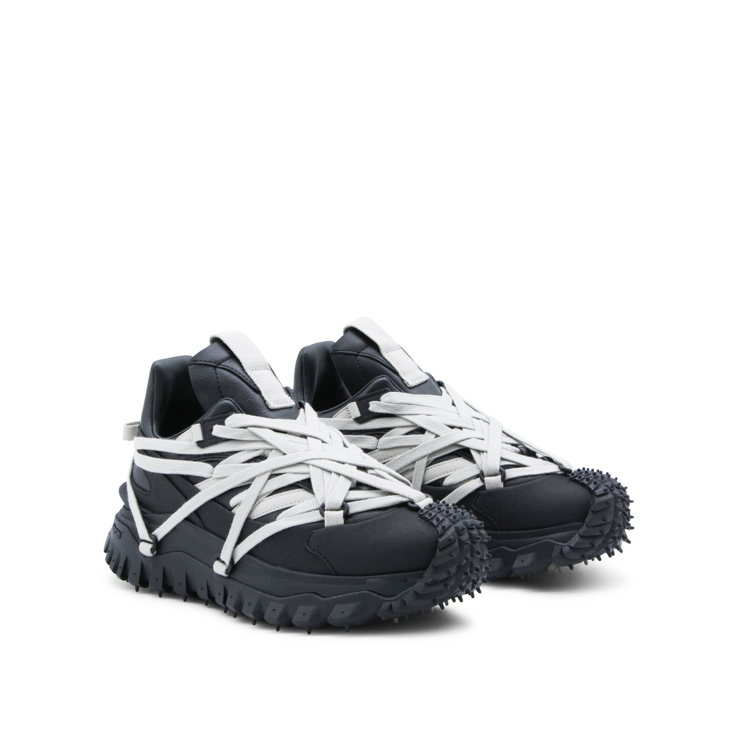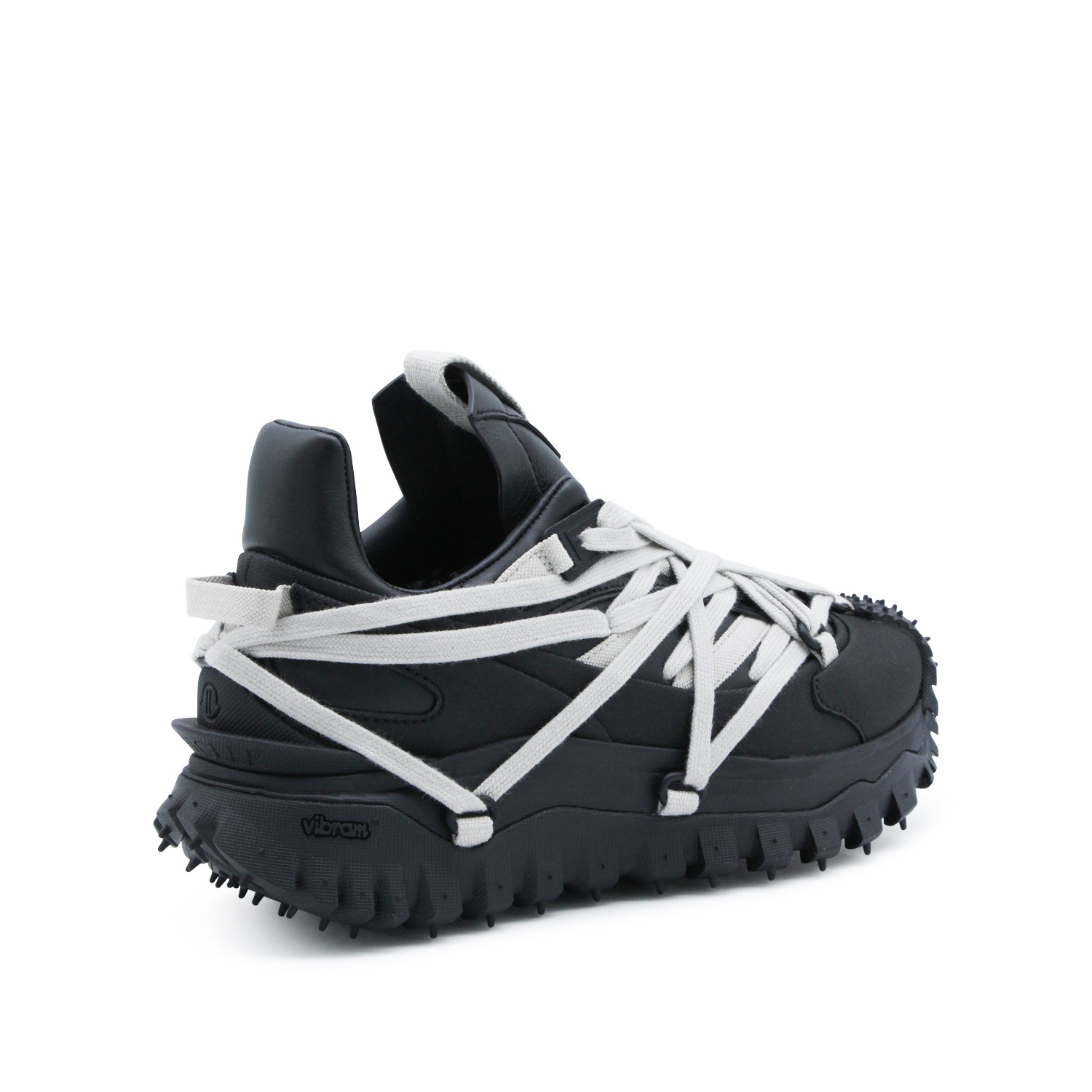 Black leather Trailgrip Megalace sneakers from Moncler + Rick Owens featuring pointed toe, Megalace clsoure, mesh lining and Vibram Megagrip rubber sole.