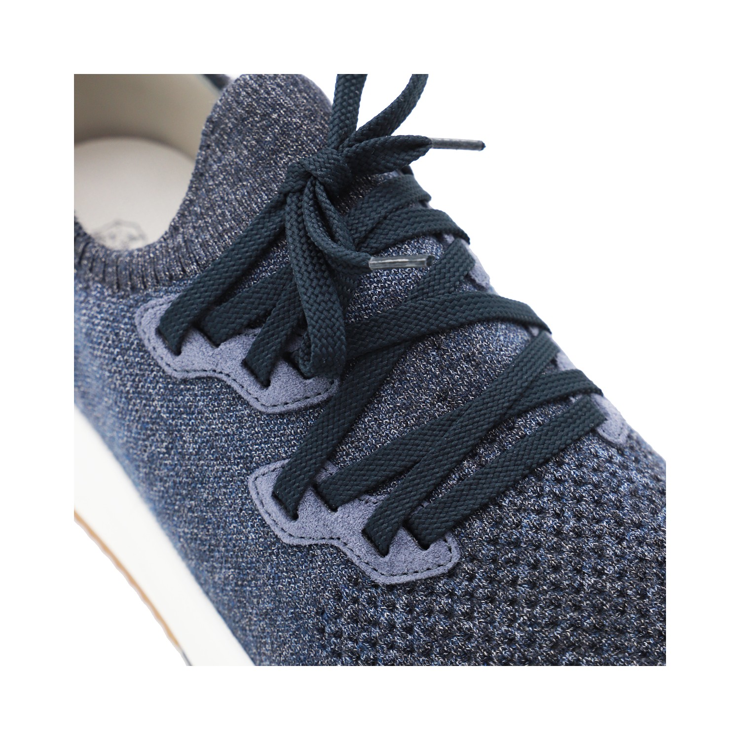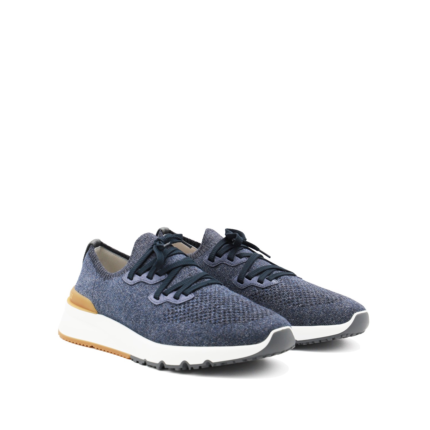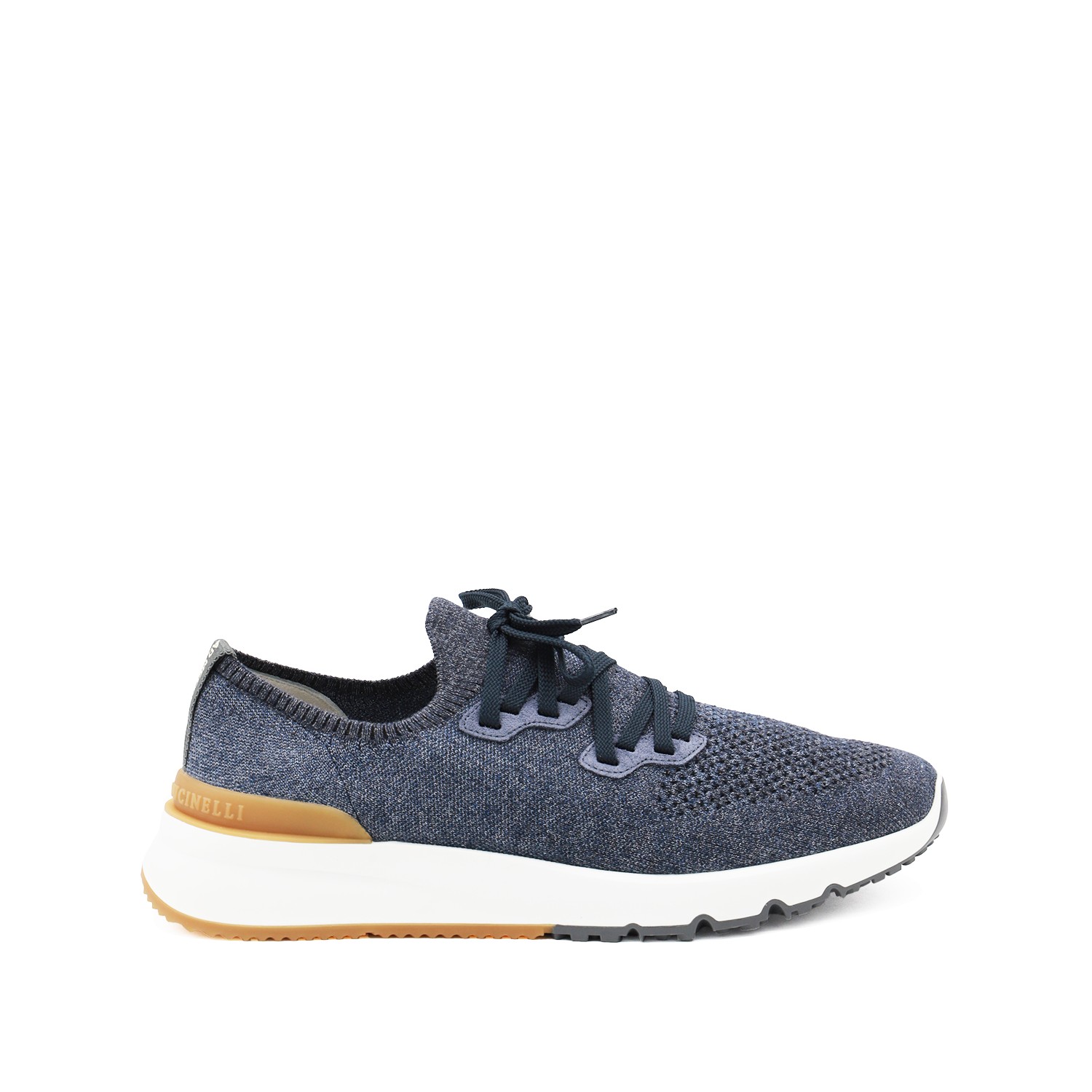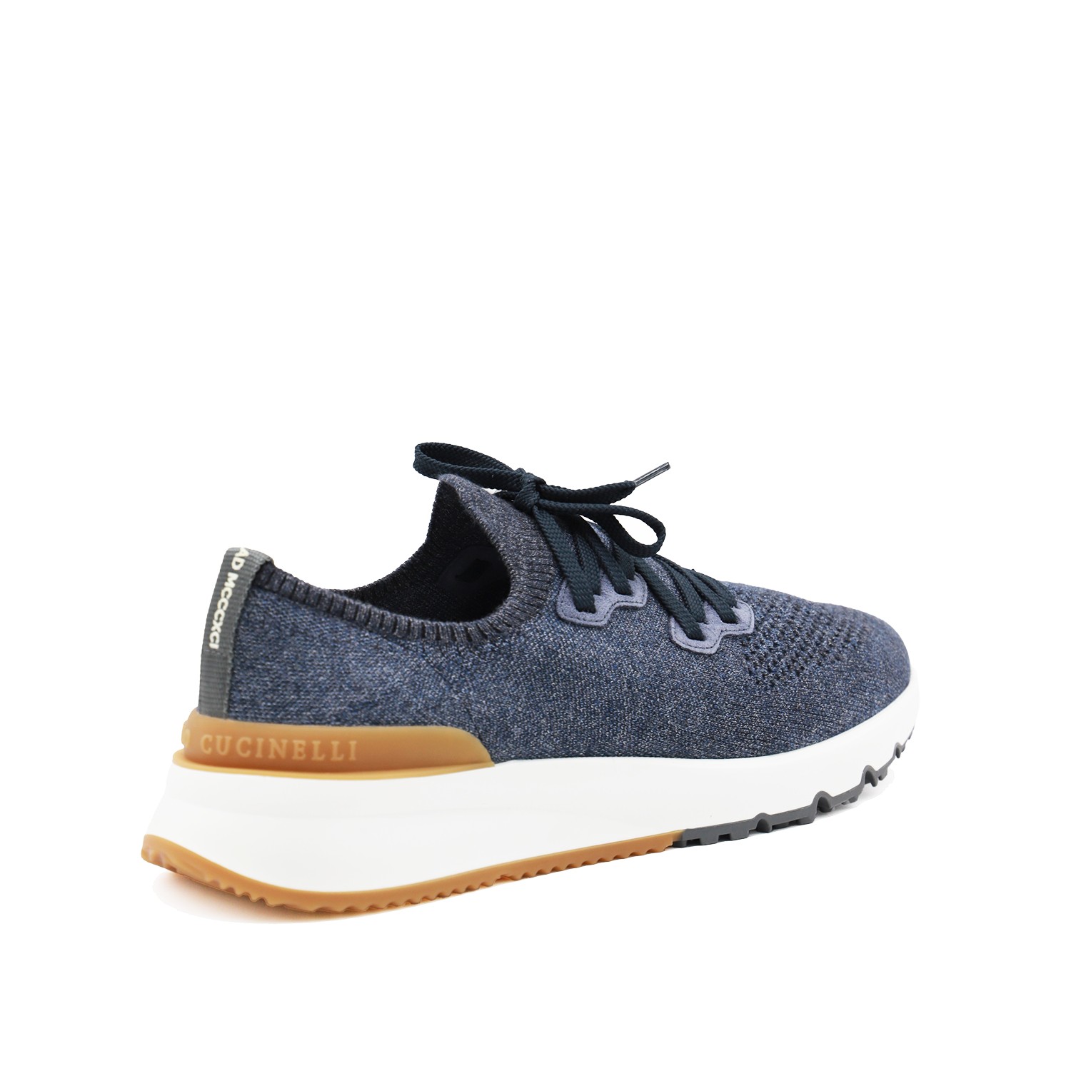 Blue knit sneakers from Brunello Cucinelli with sole in lightweight micro rubber, semi polished calfskin trim and flat fabric laces.