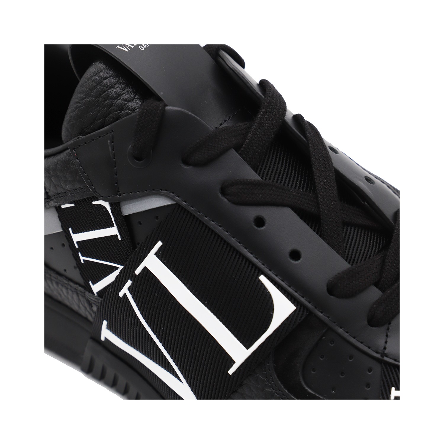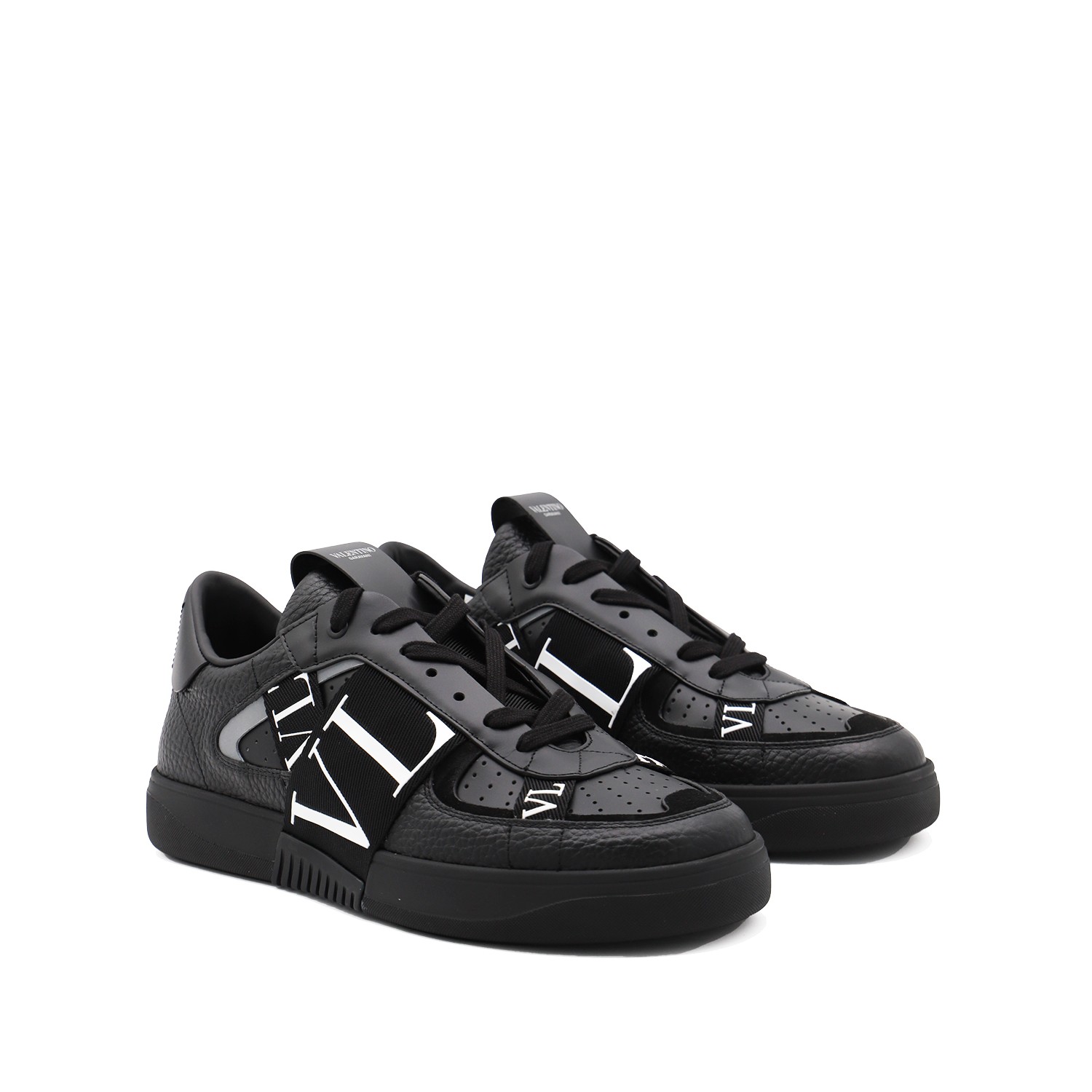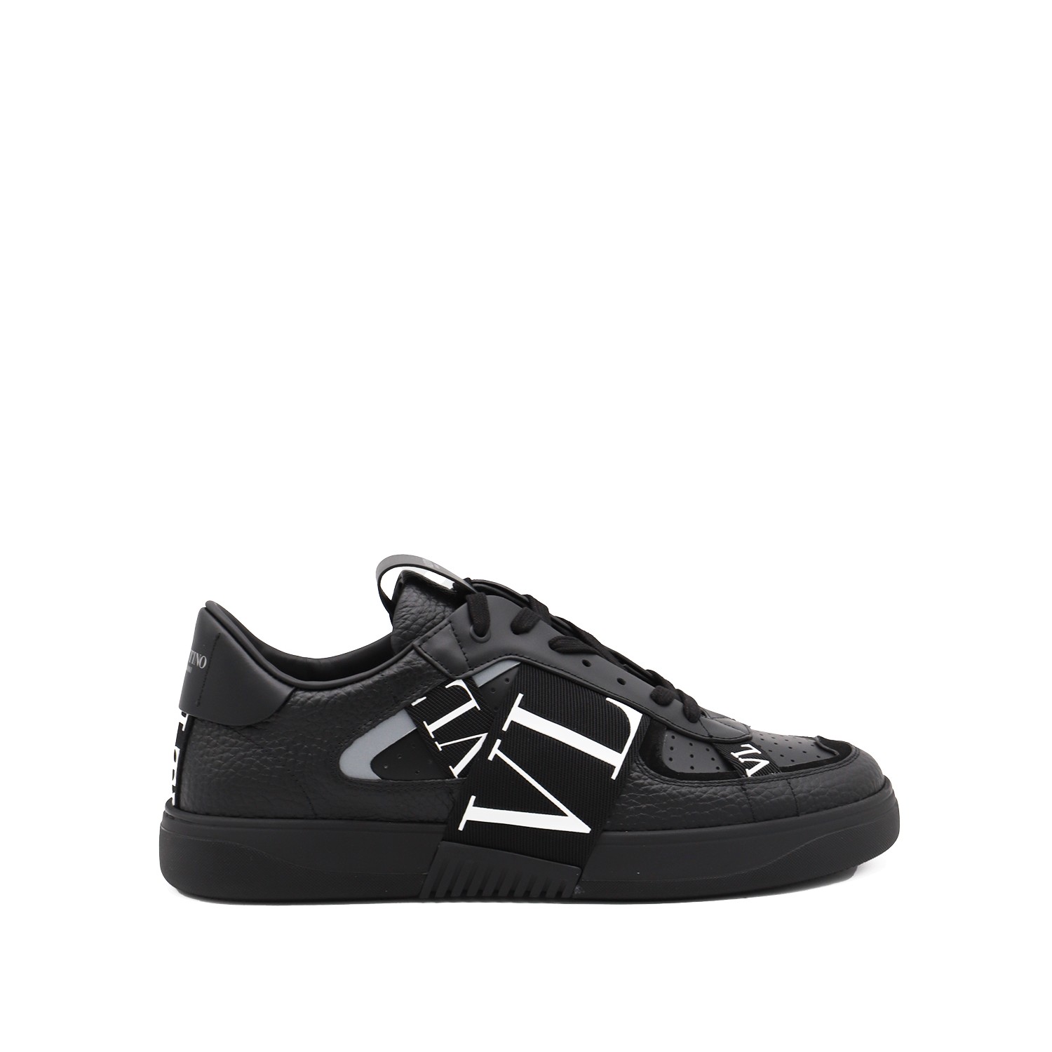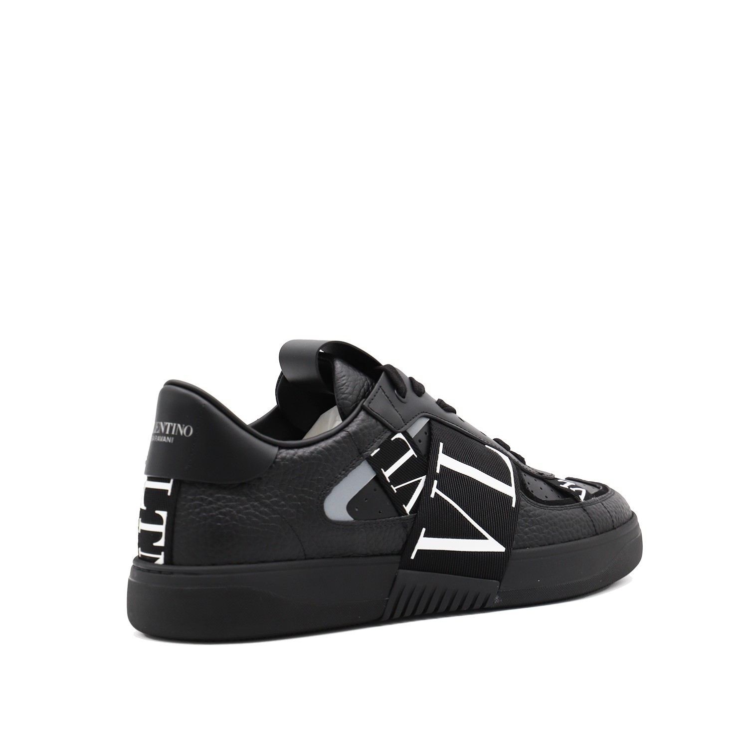 Black leather VL7N sneakers from Valentino Garavani featuring round toe, cotton lace-up fastening, ribbons with rubber-effect logo, printed logo on the back and tongue and rubber sole.