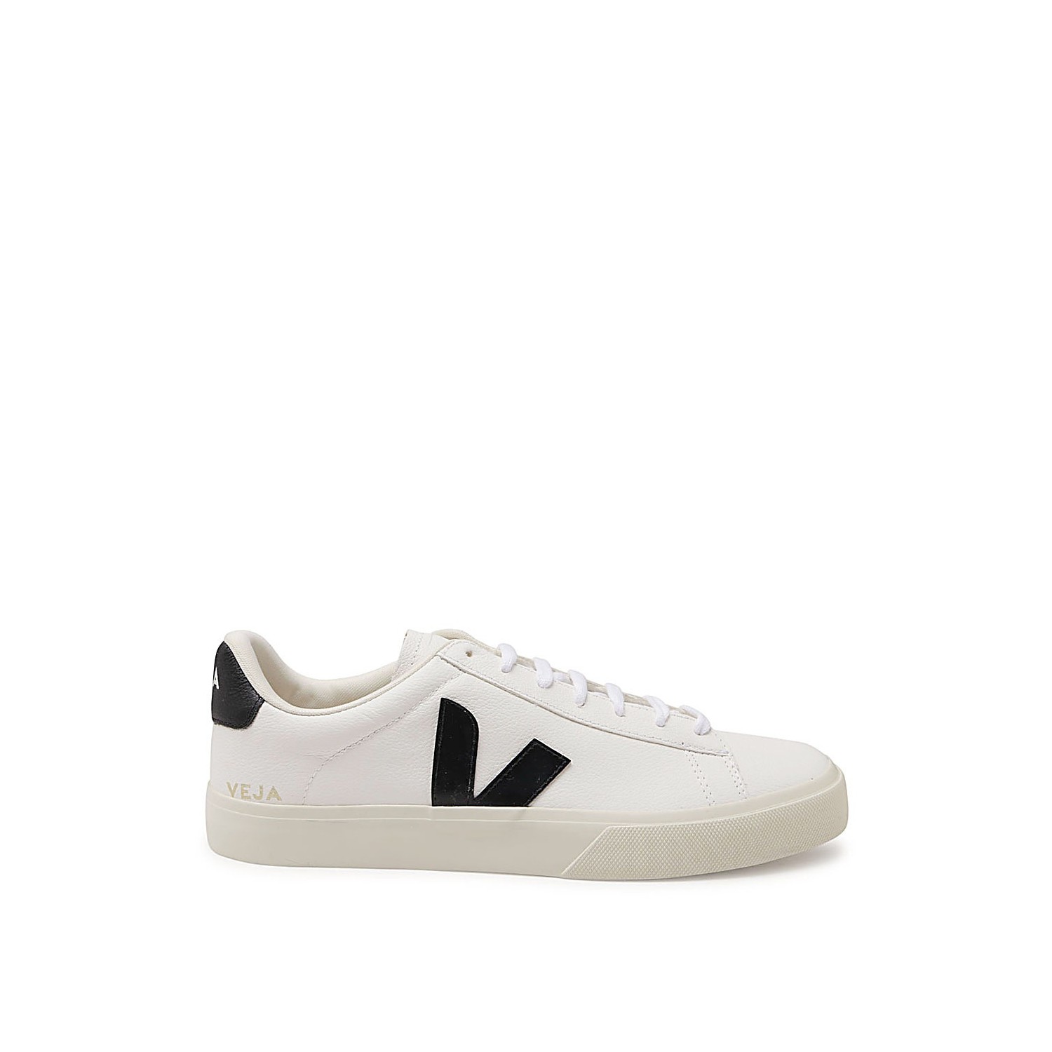 Black and white faux leather Campo sneakers from Veja featuring round toe, front lace-up fastening, logo patch at the tongue, logo print to the side, logo patch to the side, contrasting heel counter and flat sole.