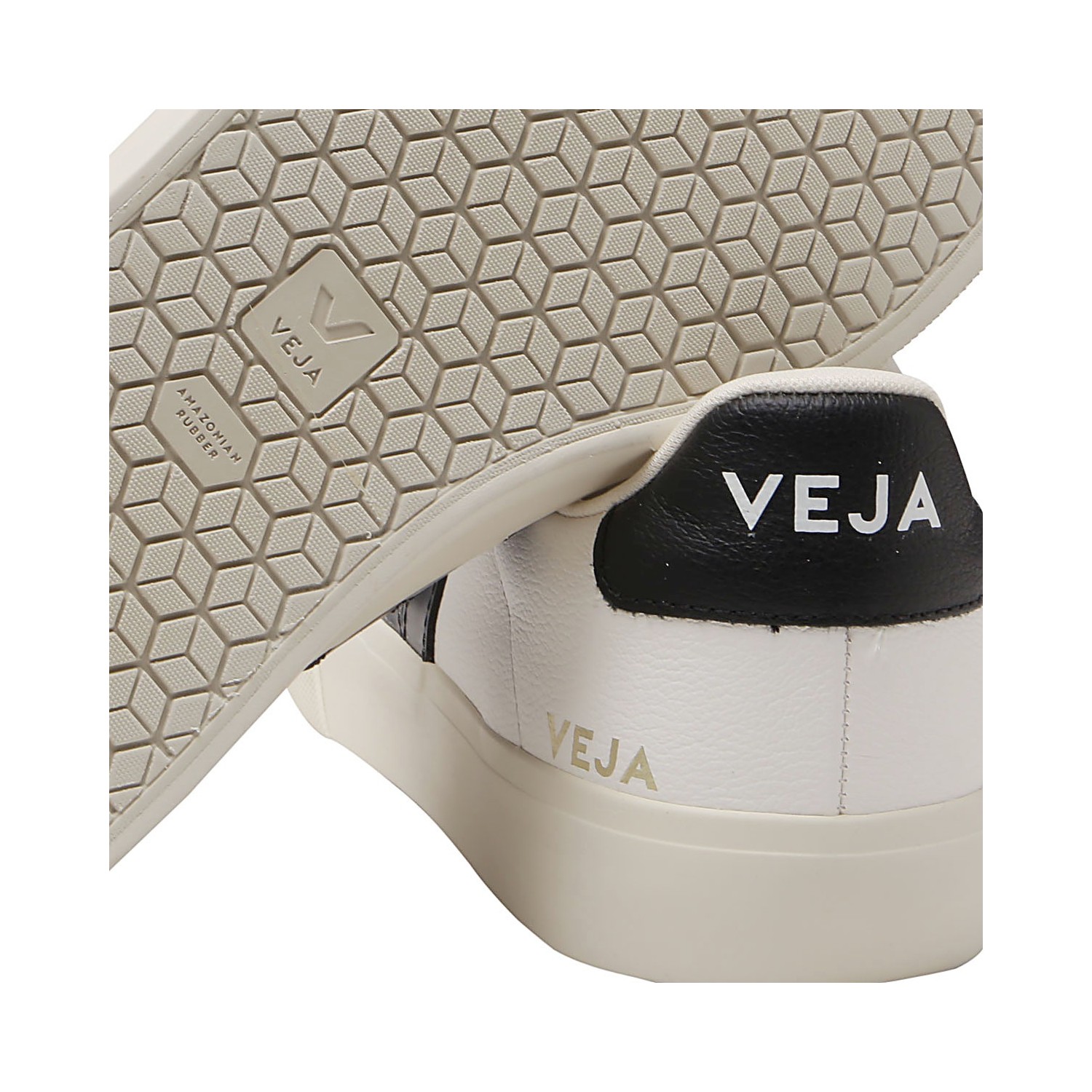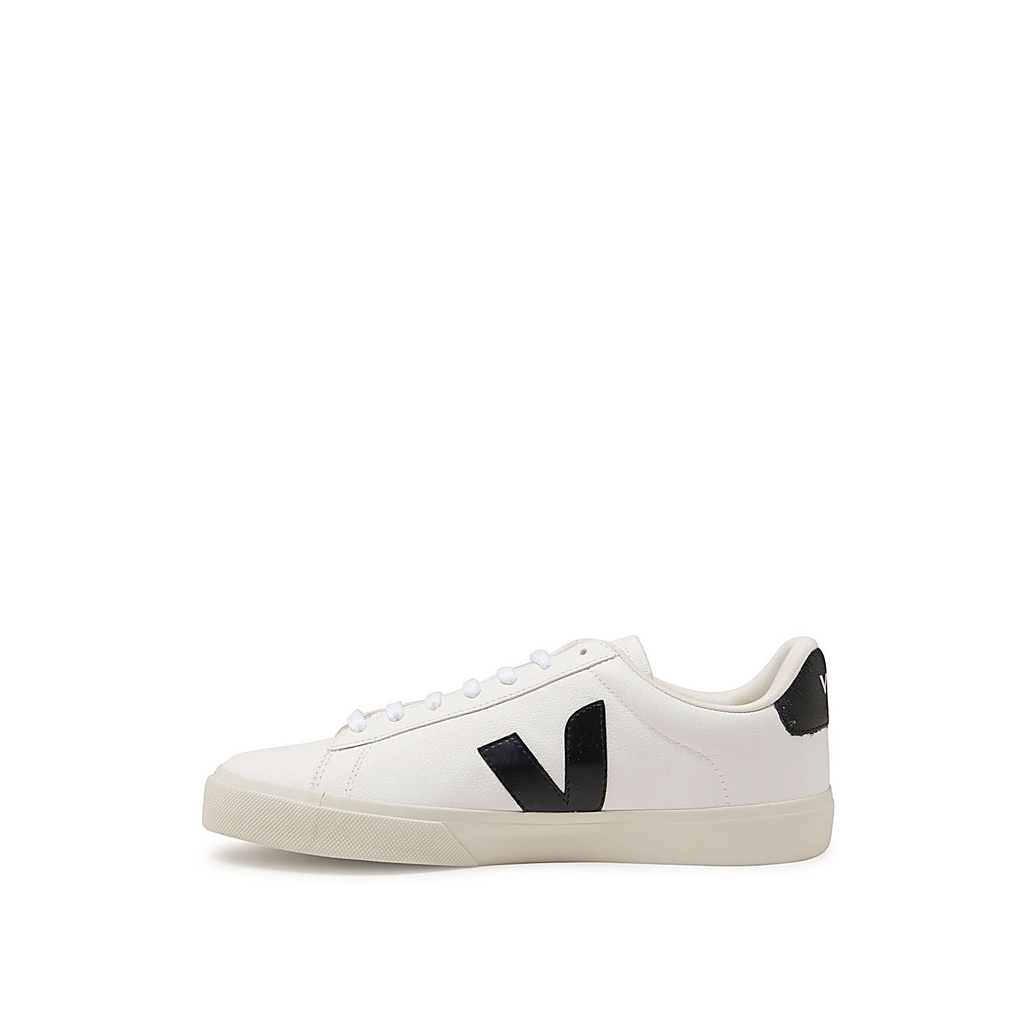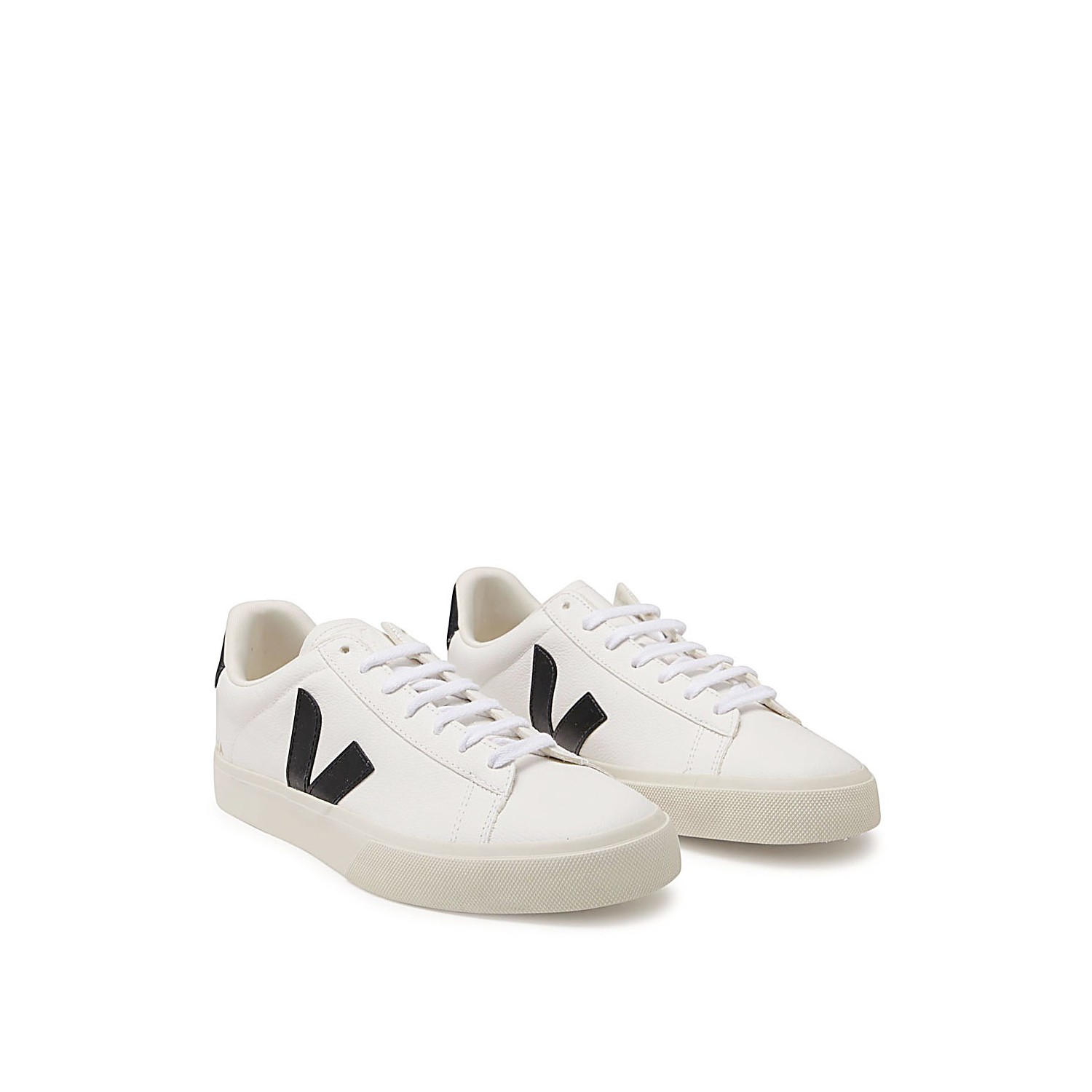 White leather Campo sneakers from Veja featuring a round toe, front lace-up fastening, contrasting heel counter, side logo patch, branded tongue and flat rubber sole.
