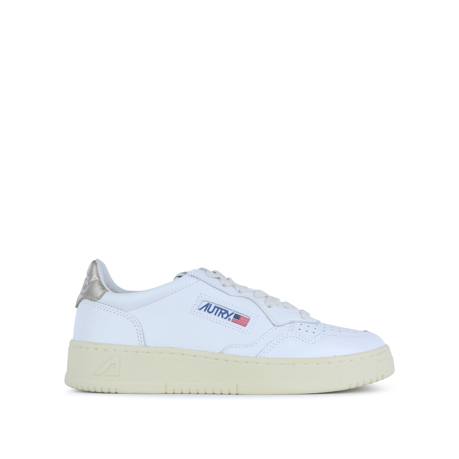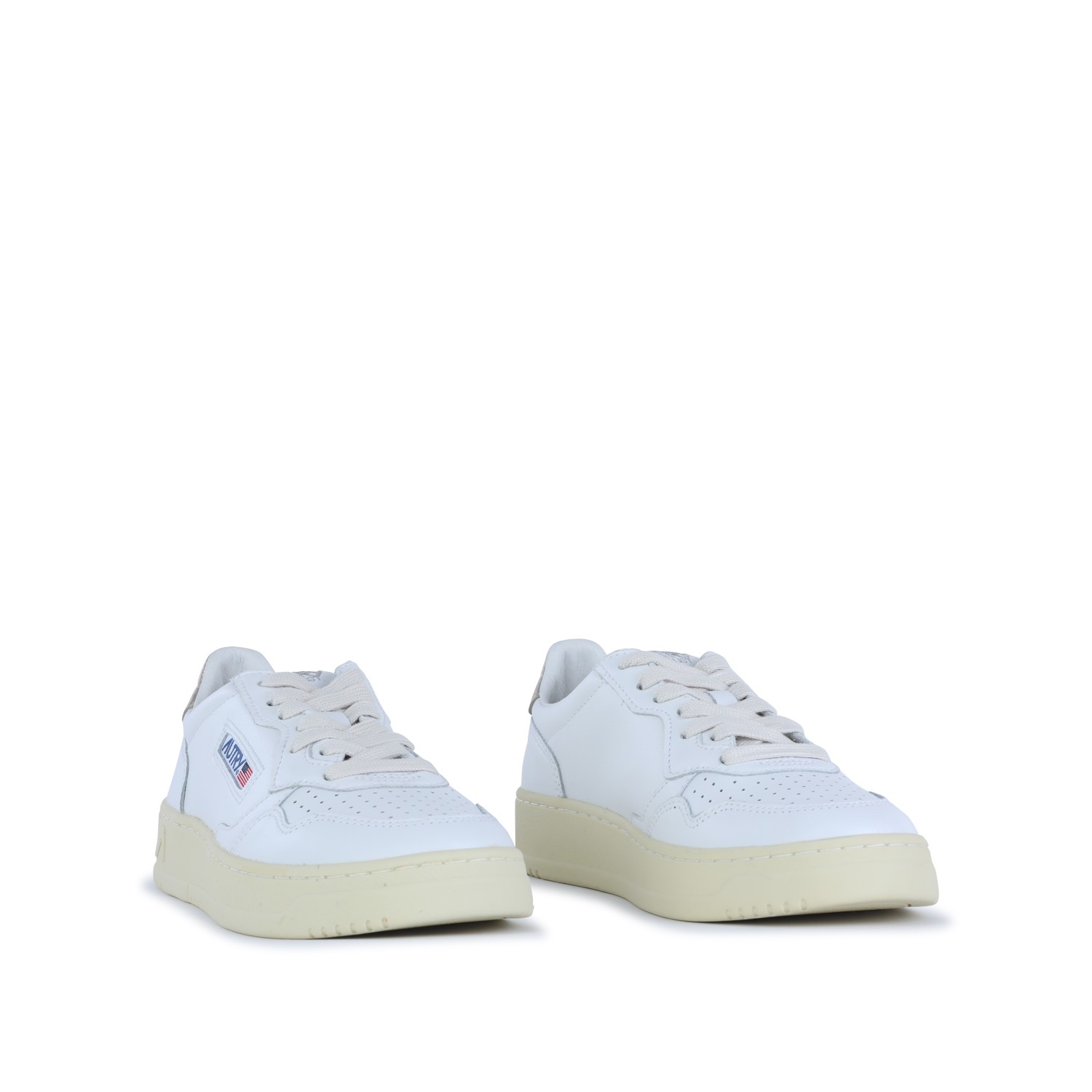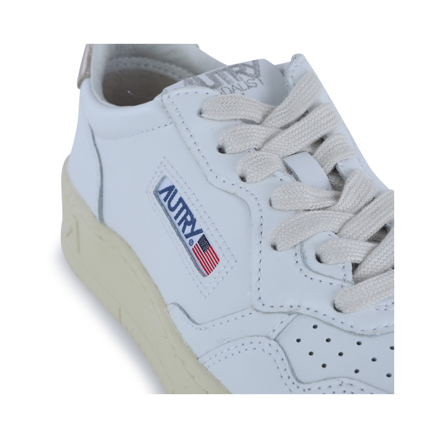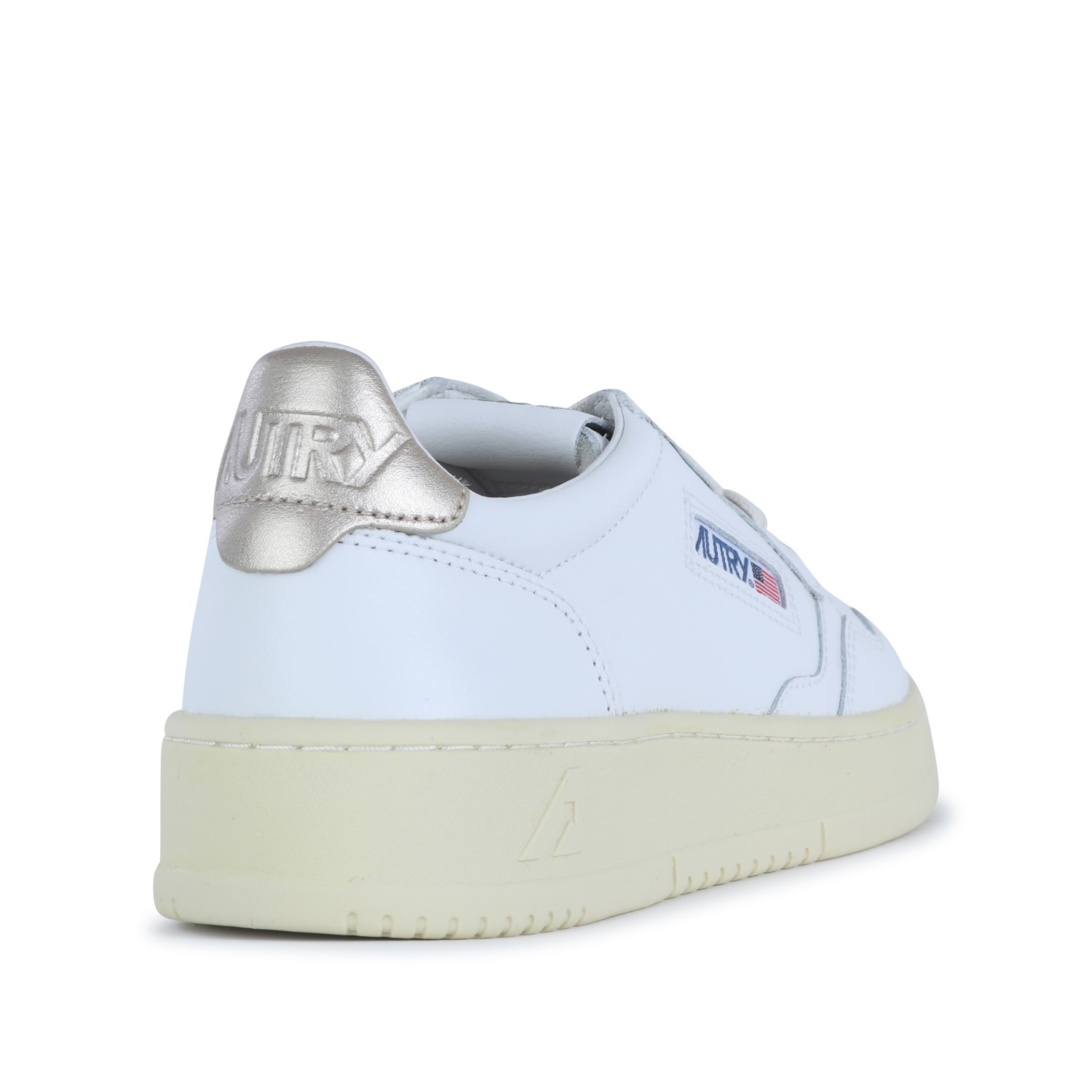 White leather 01 sneakers from Autry featuring a round toe, front lace-up fastening, gold-tone heel counter, panelled design, logo patch and flat rubber sole.
