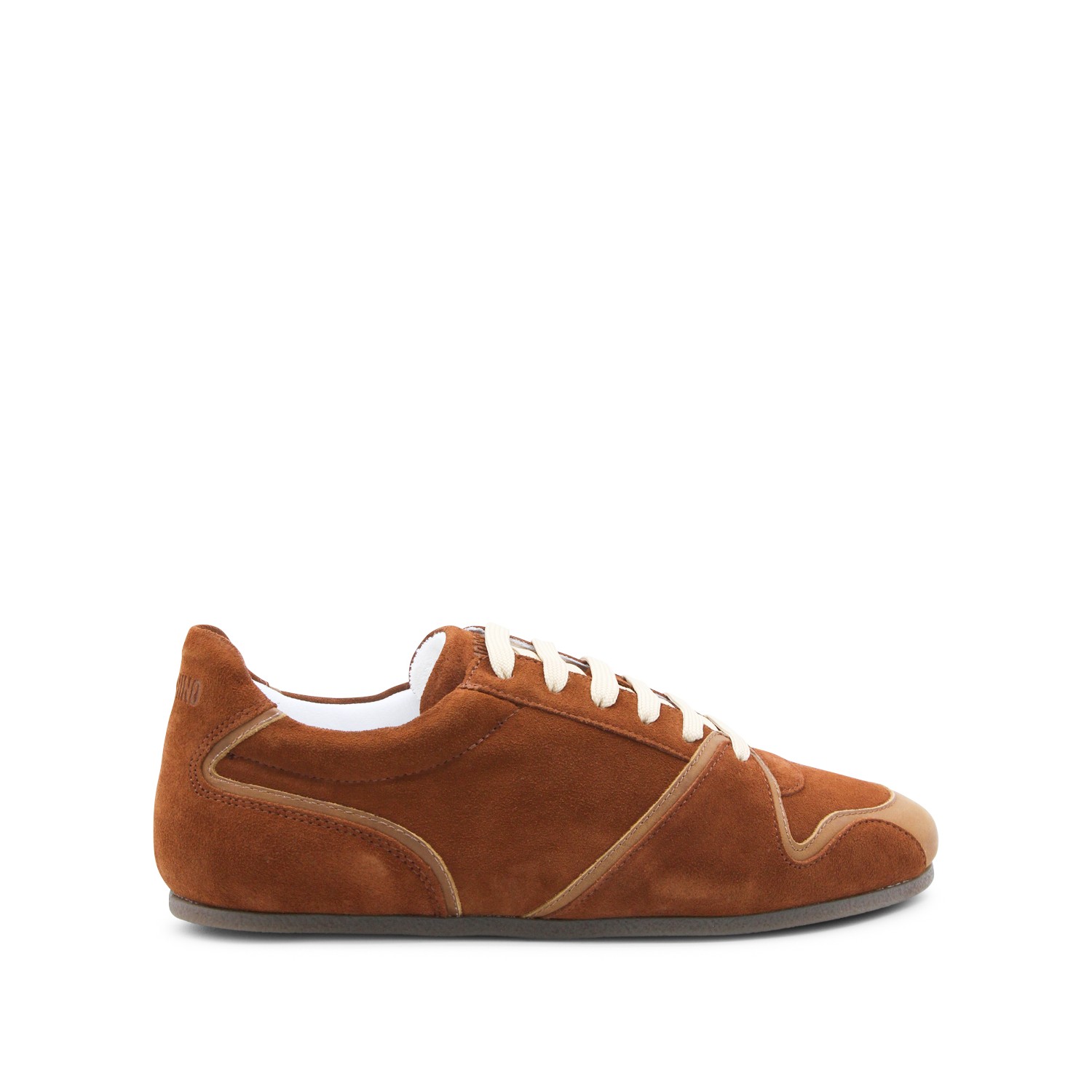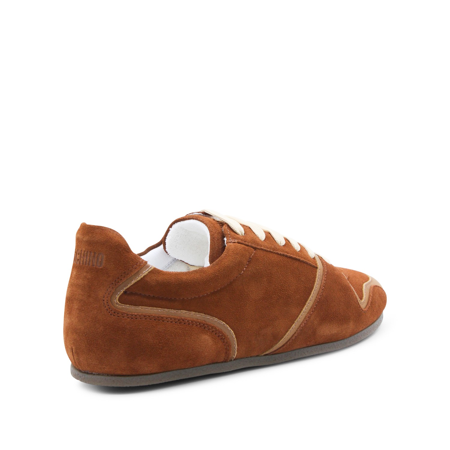 Rust leather sneakers from Moschino featuring round toe, laces fastening, suede and flat rubber sole.