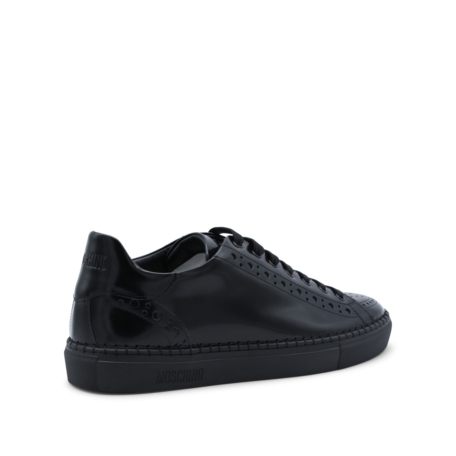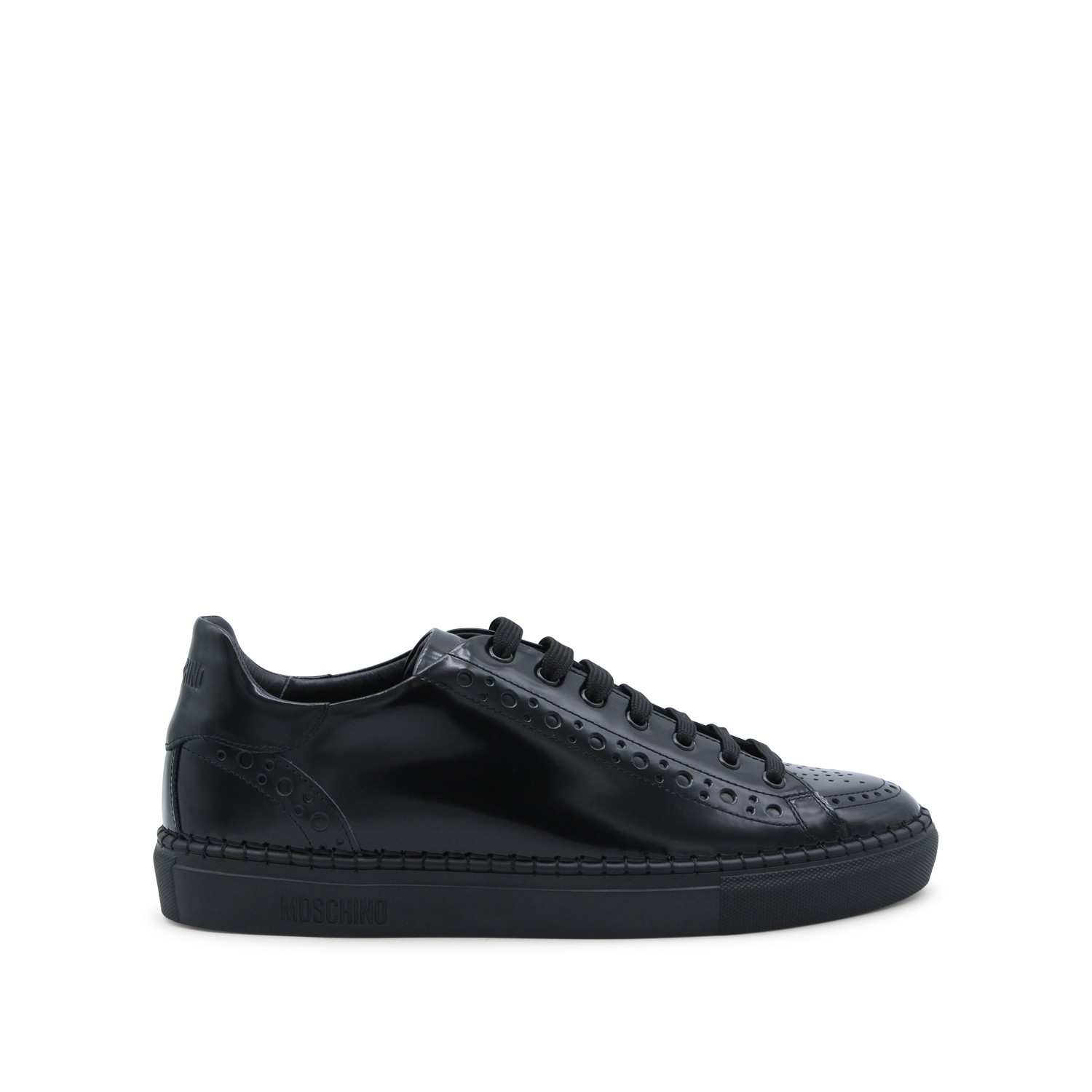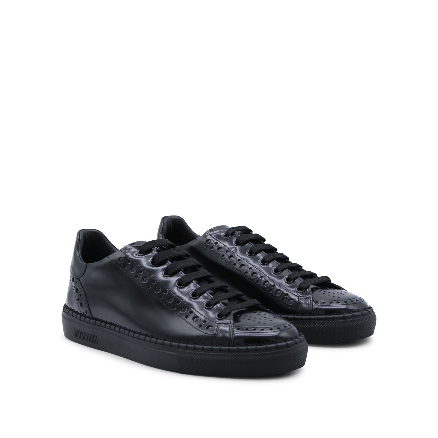 Black leather sneakers from Moschino featuring round toe, laces fastening, engraved logo, branded insole and rubber sole.