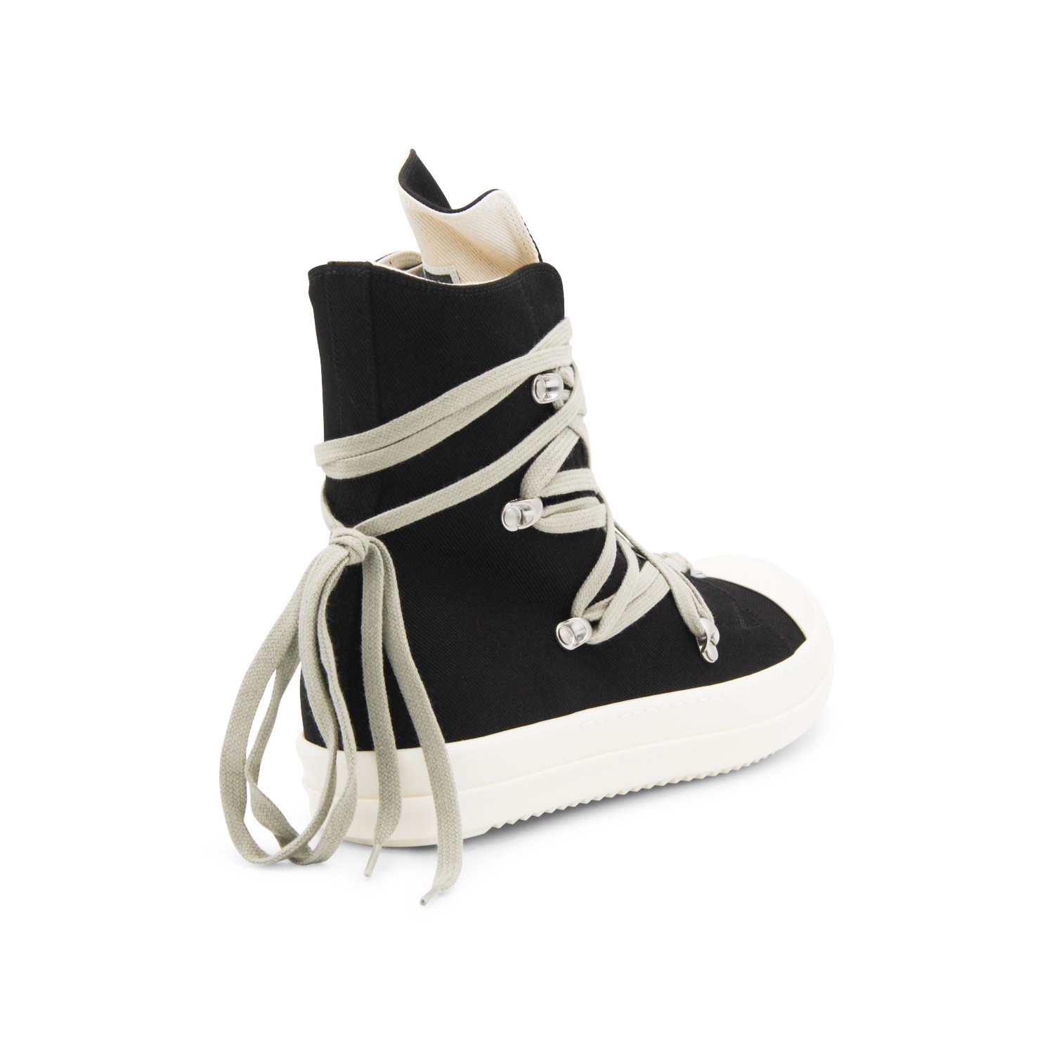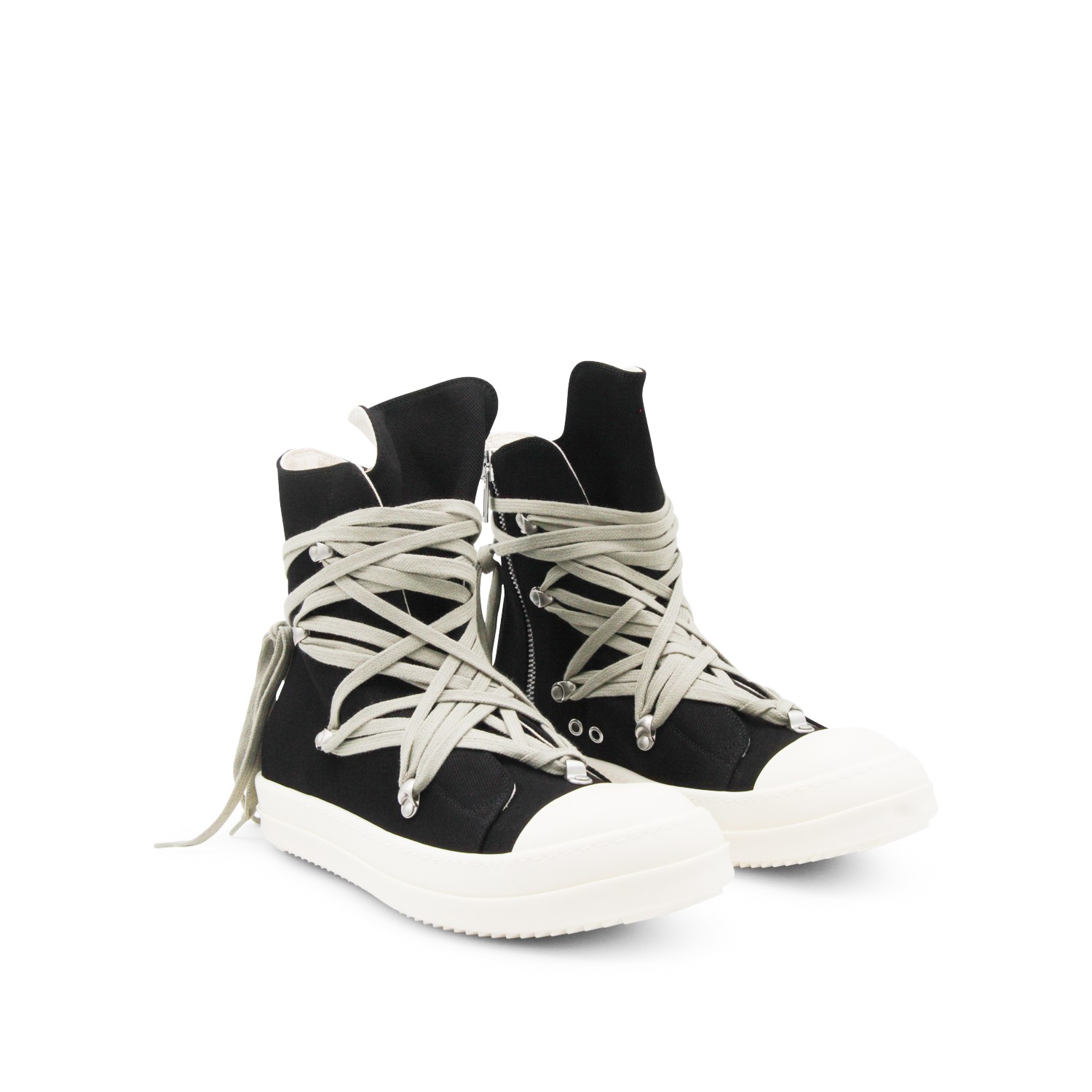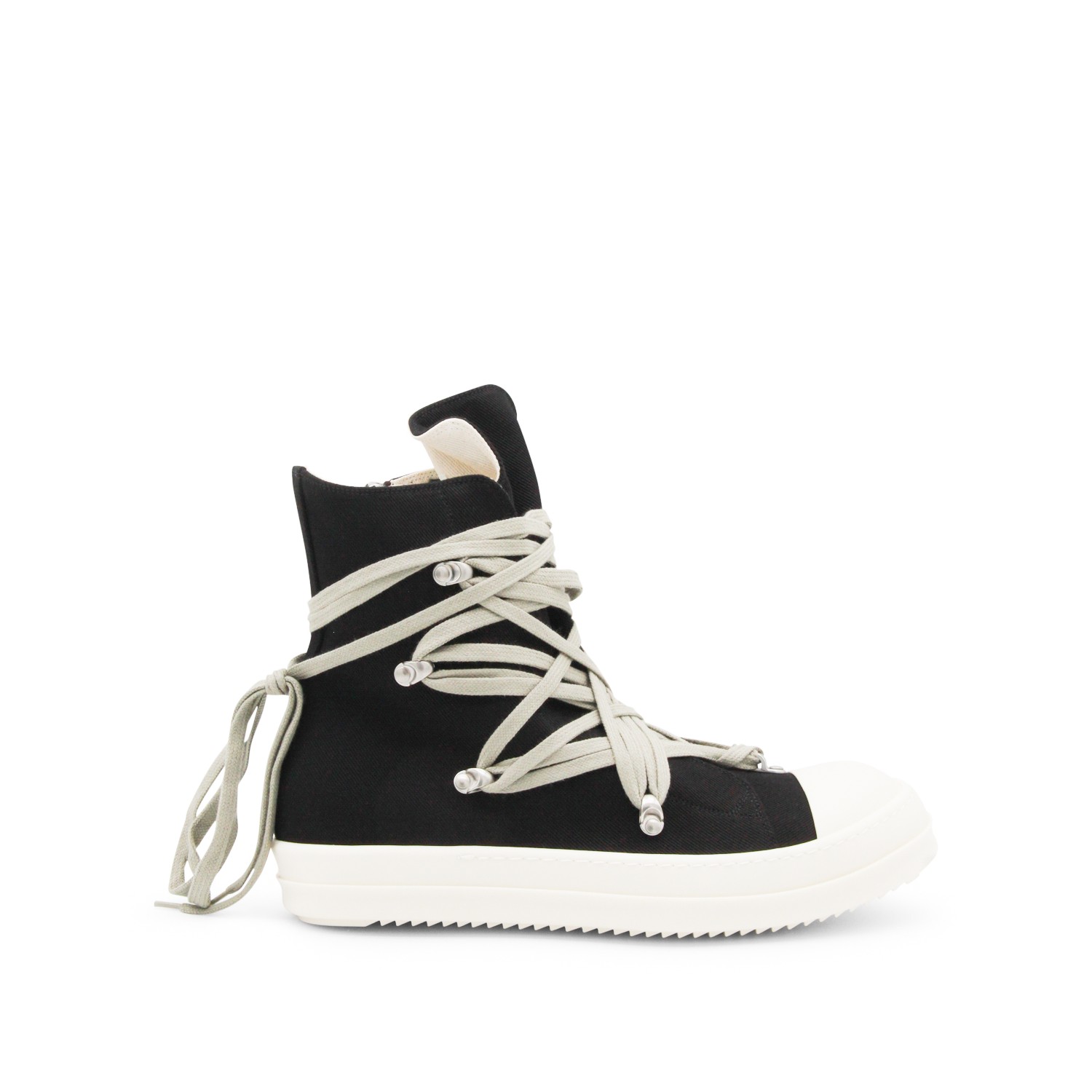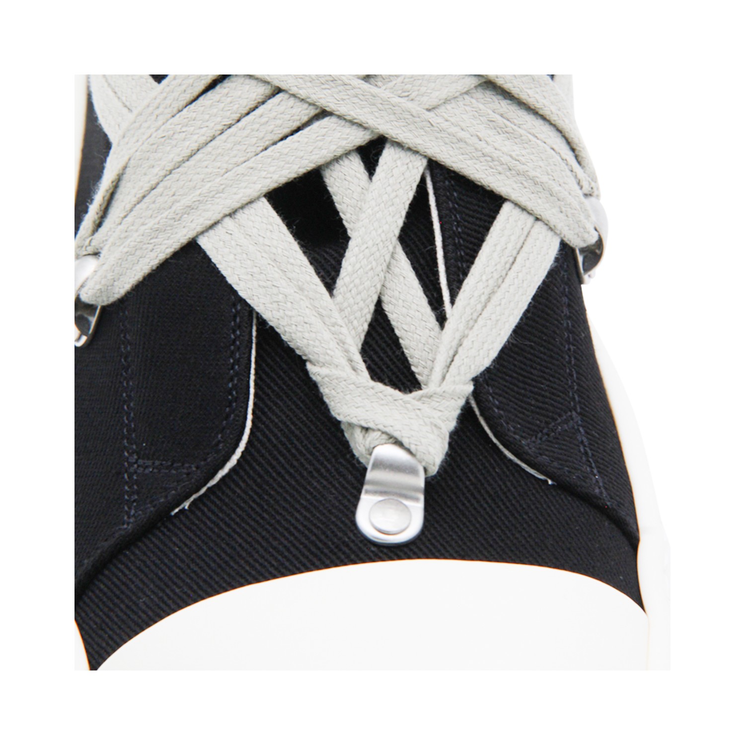 Black and white leather Megalaces sneakers from Rick Owens DRKSHDW featuring round toe, laces fatsening, mega laces details and rubber sole.