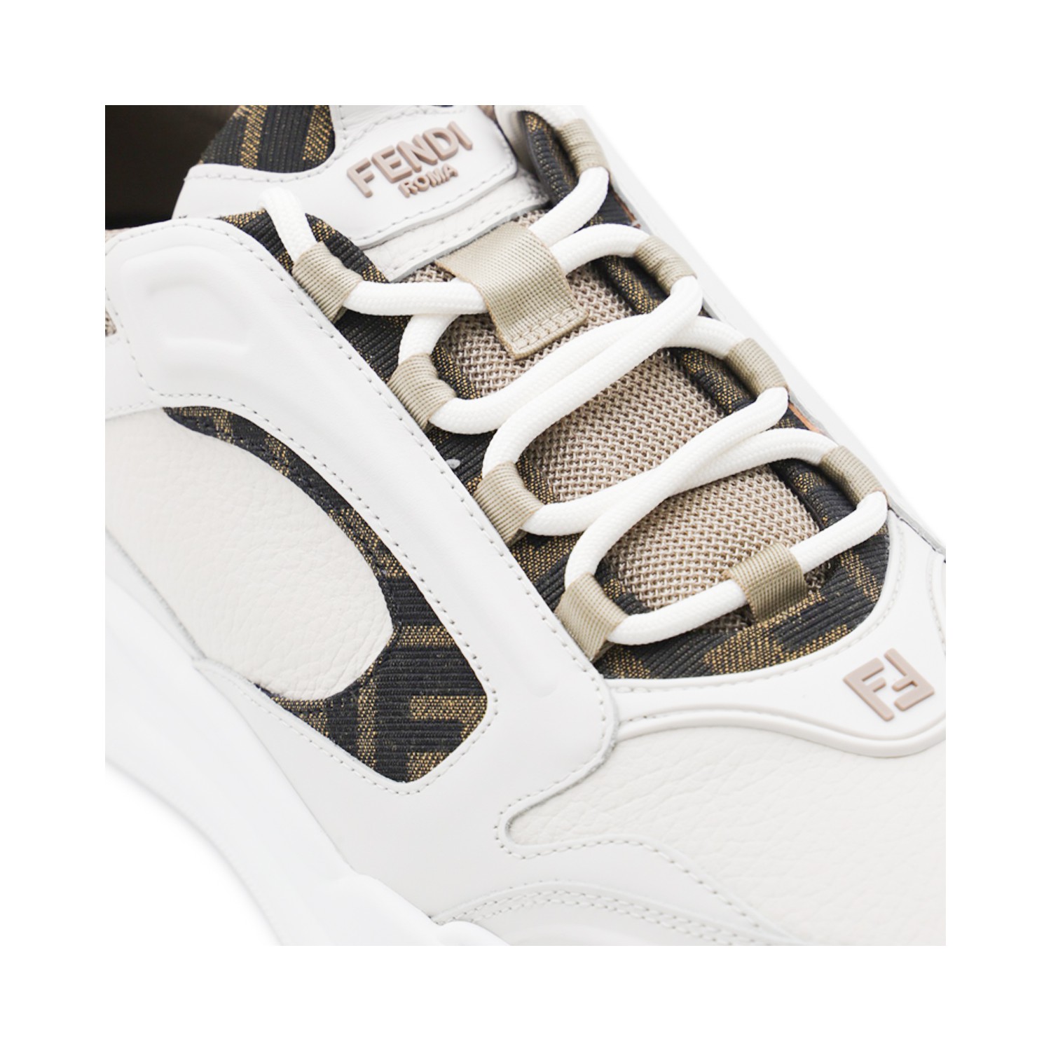 White and beige leather Fendi Force sneakers from Fendi featuring round toe, cotton lace-up fastening, monogram inserts, beige fabric details and rubber sole.