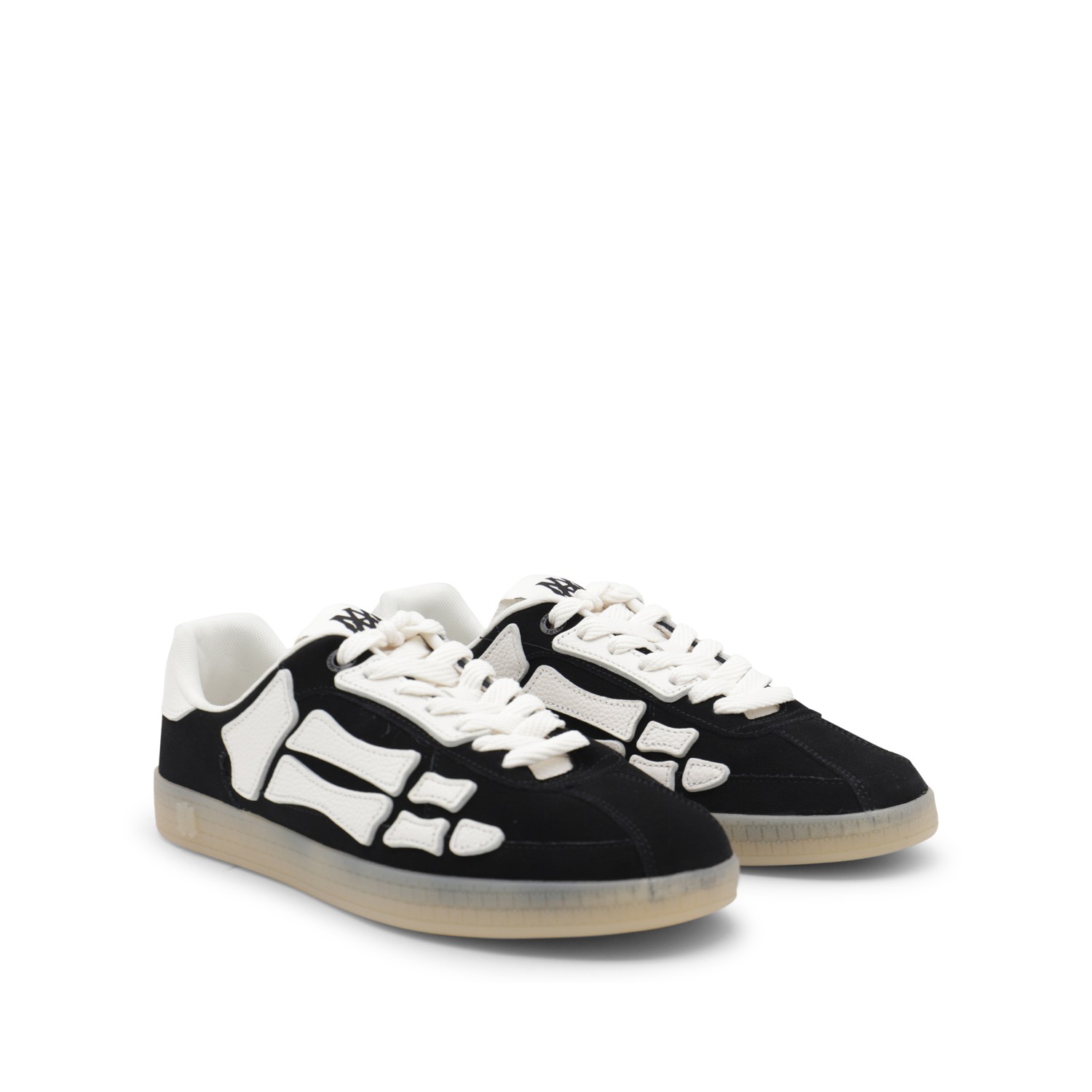 Black and white leather Pacific Bones sneakers from Amiri featuring round toe, front lace-up fastening, branded insole, logo patch at the tongue and flat rubber sole.