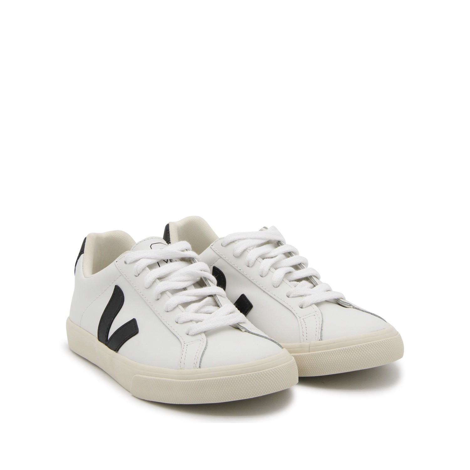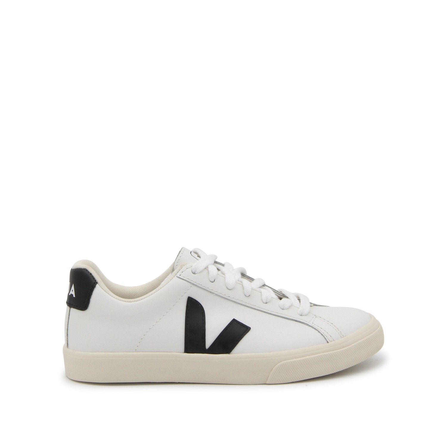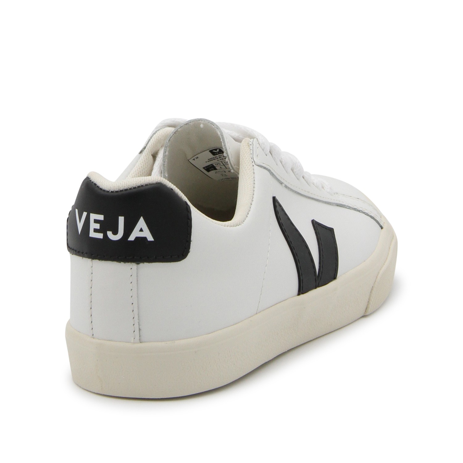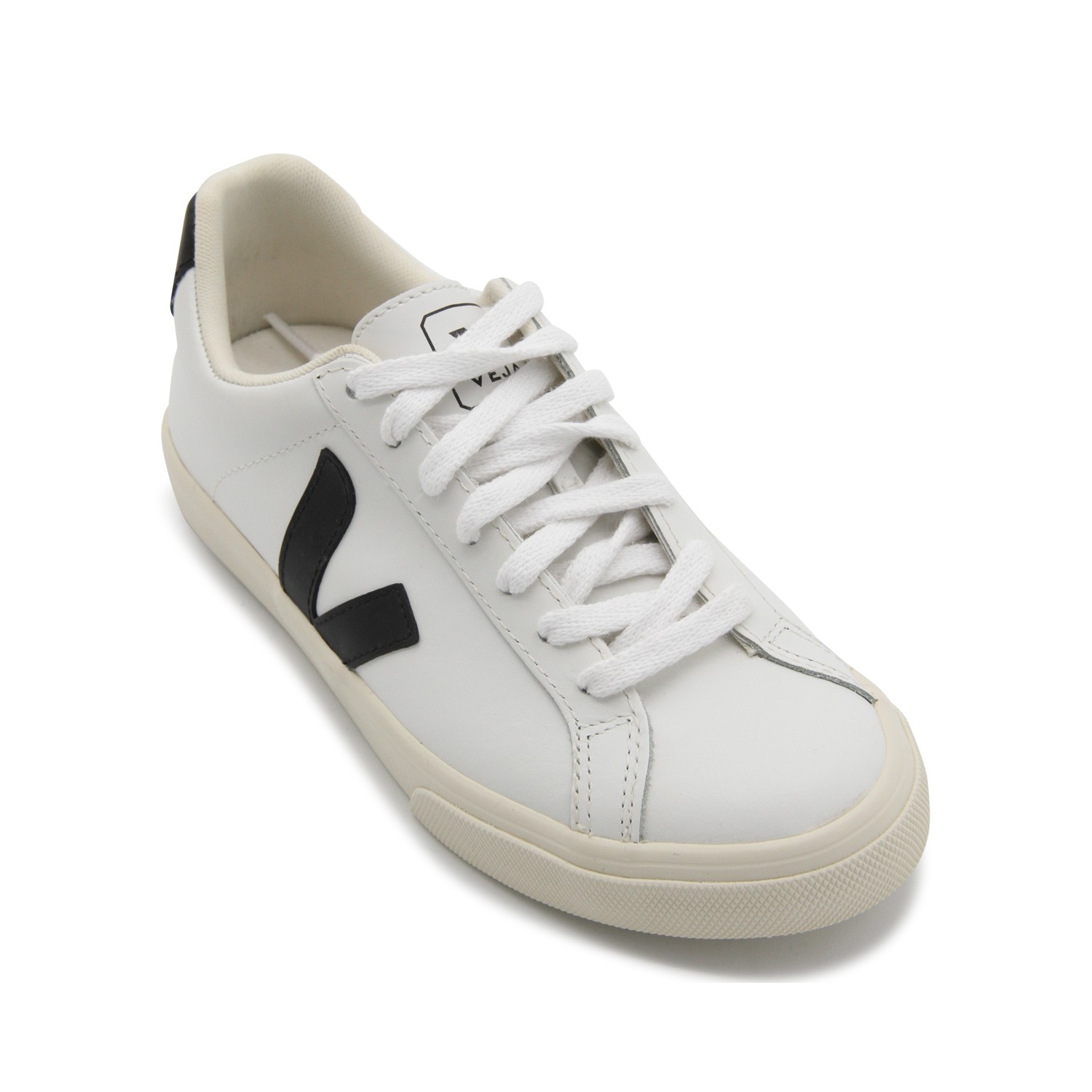 White and black leather sneakers from Veja featuring round toe, cotton laces fastening, back and lateral logo, rubber sole and comfortable fit.