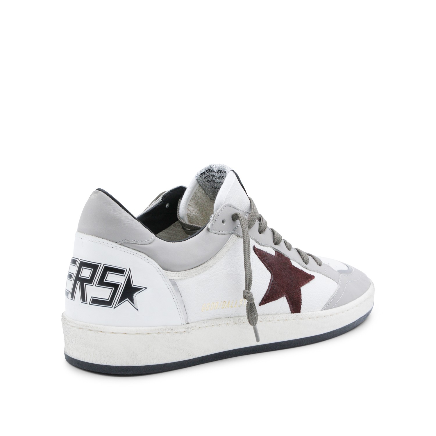 White and bordeaux leather Ballstar sneakers from Golden Goose featuring round toe, cotton laces fastening, lateral star patch, grey inserts, branded insole and rubber sole.