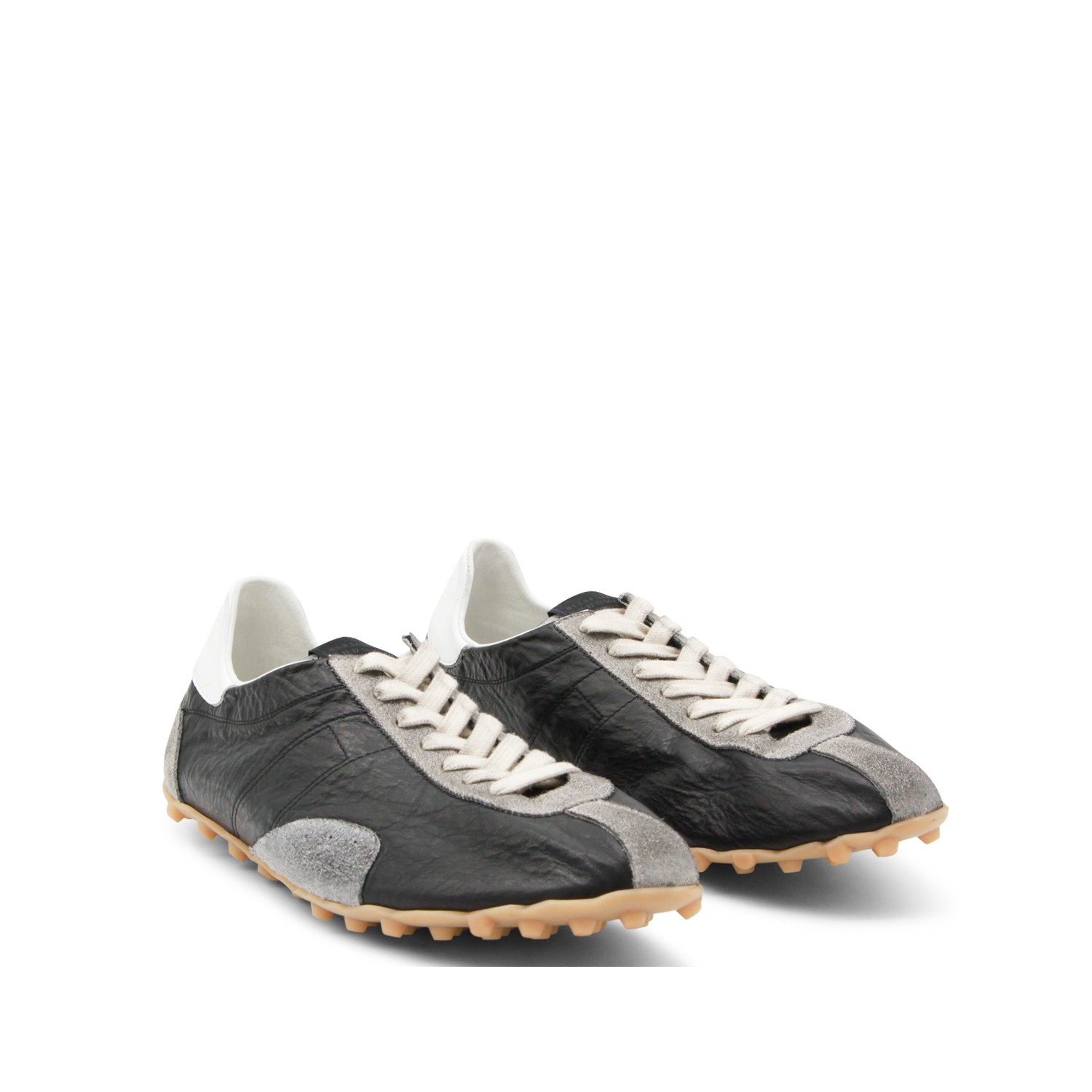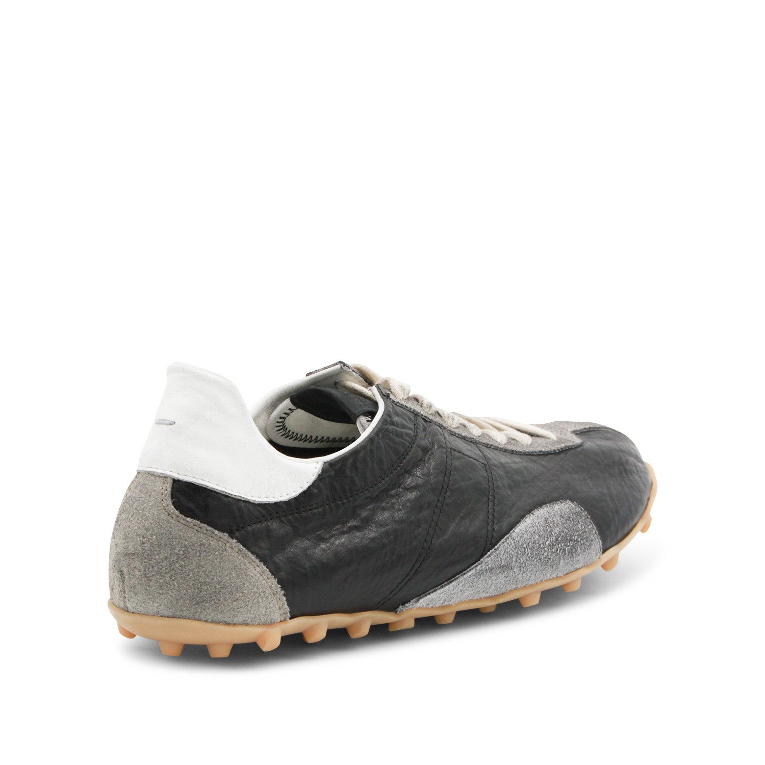 Grey leather sneakers from Maison Margiela featuring round toe, cotton laces fastening, branded heel, cotton details, rubber sole and furry suede with vintage treatment.