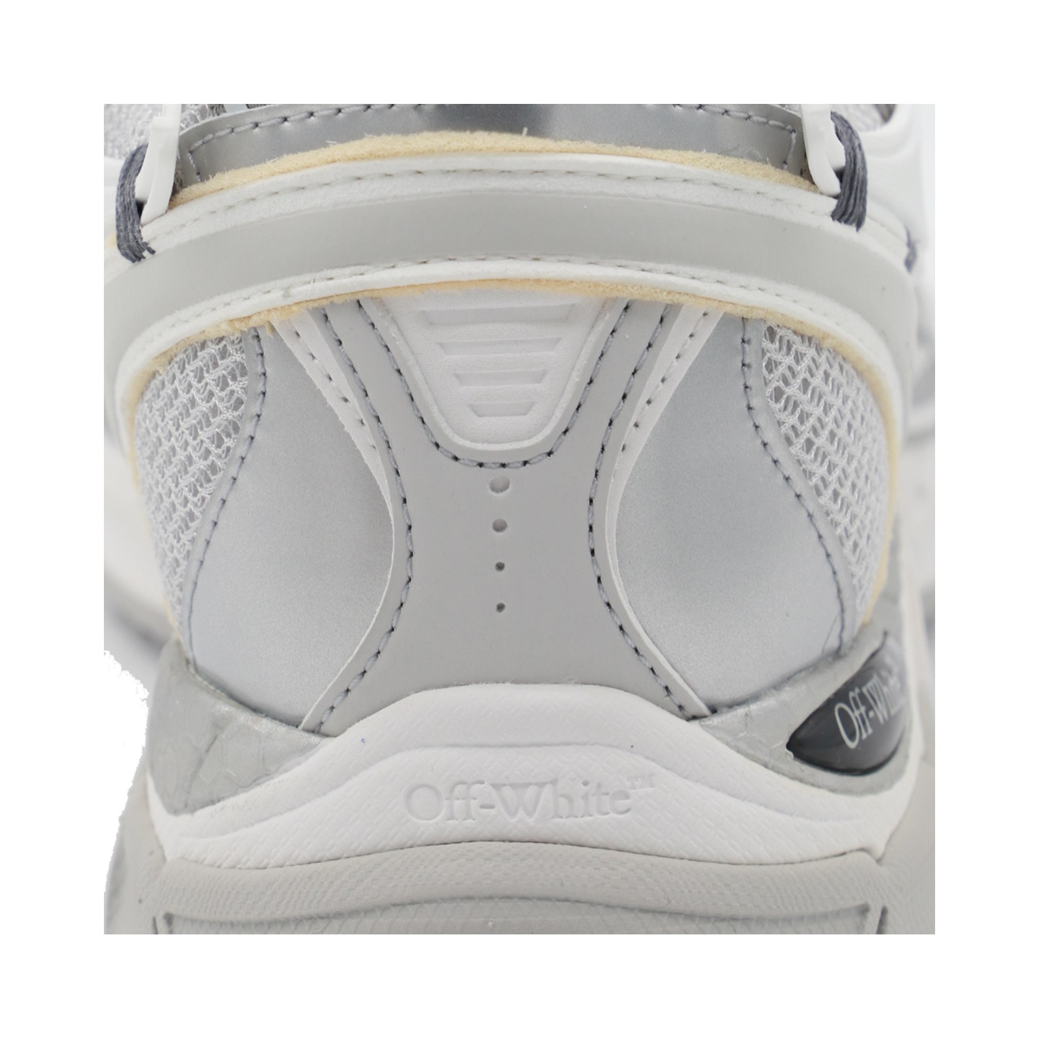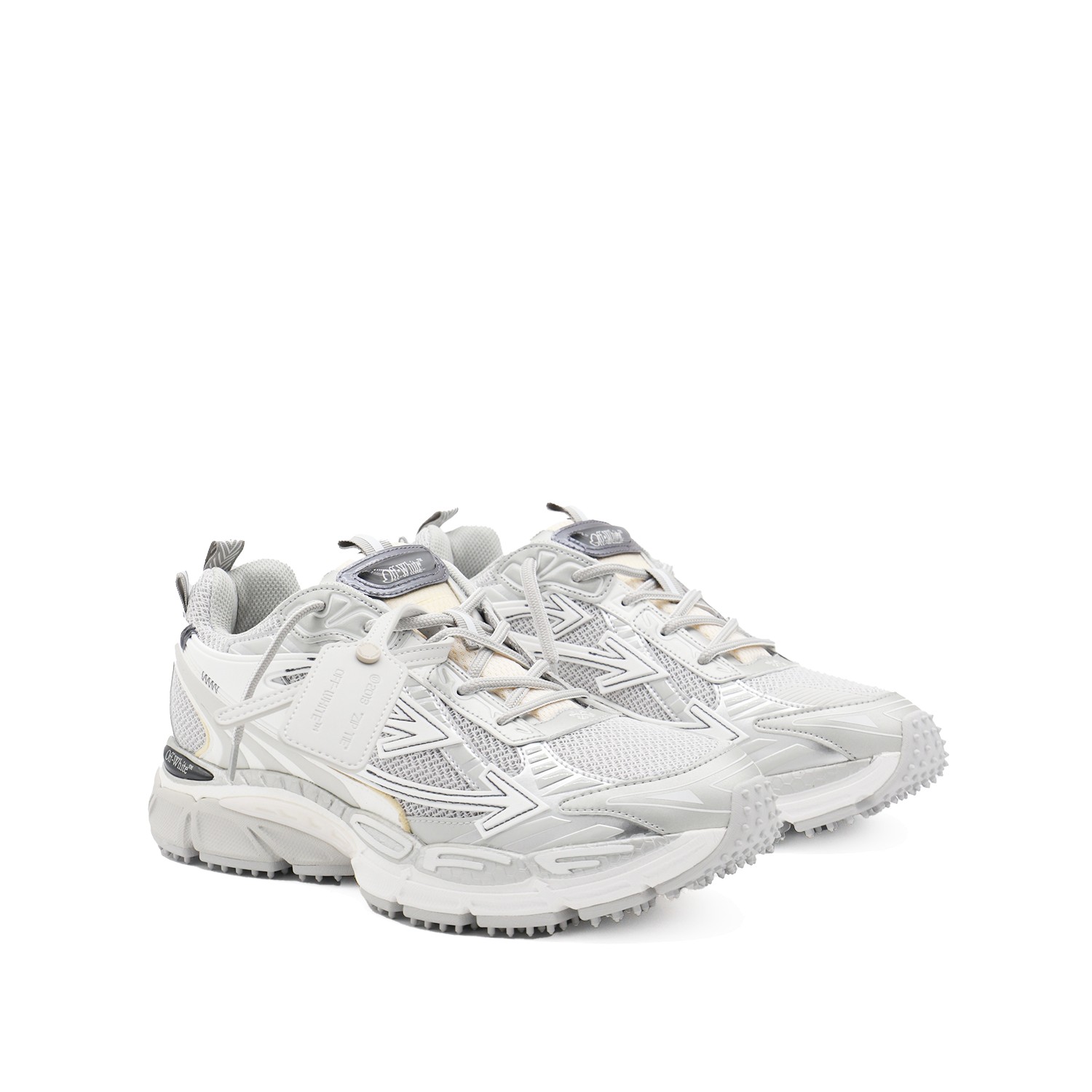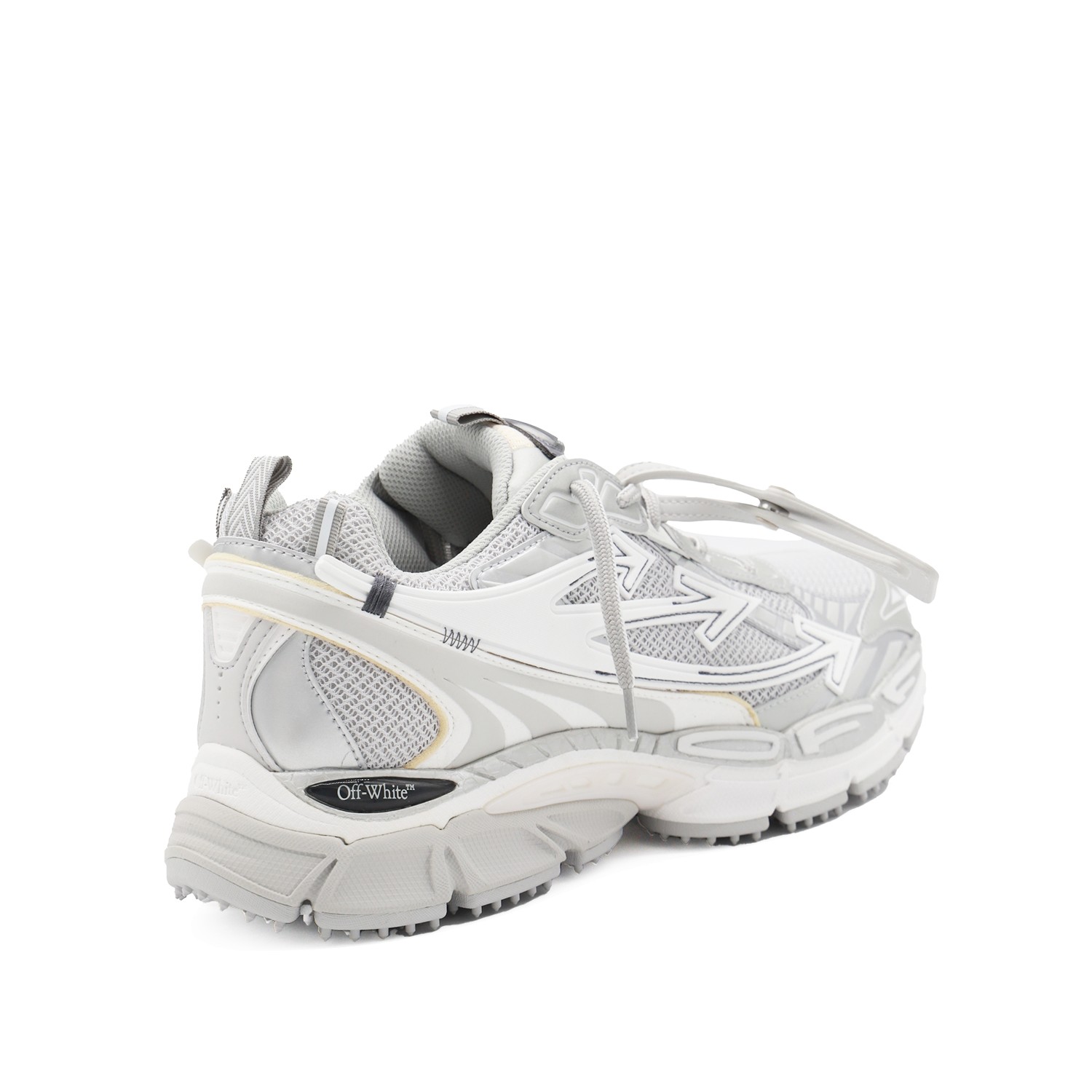 White and silver Be Right Back sneakers from Off-White featuring round toe, leather sole, lateral logo and arrow details.