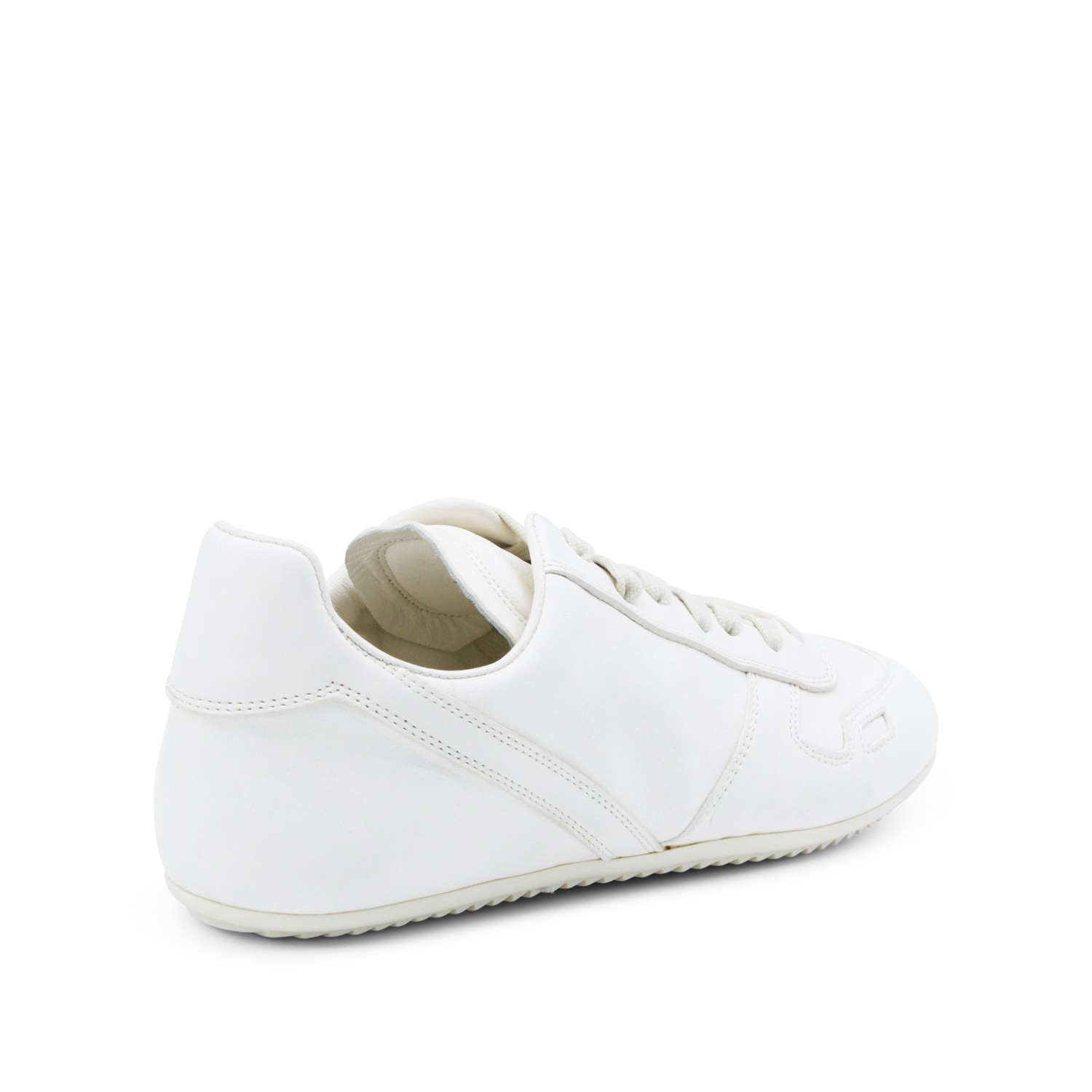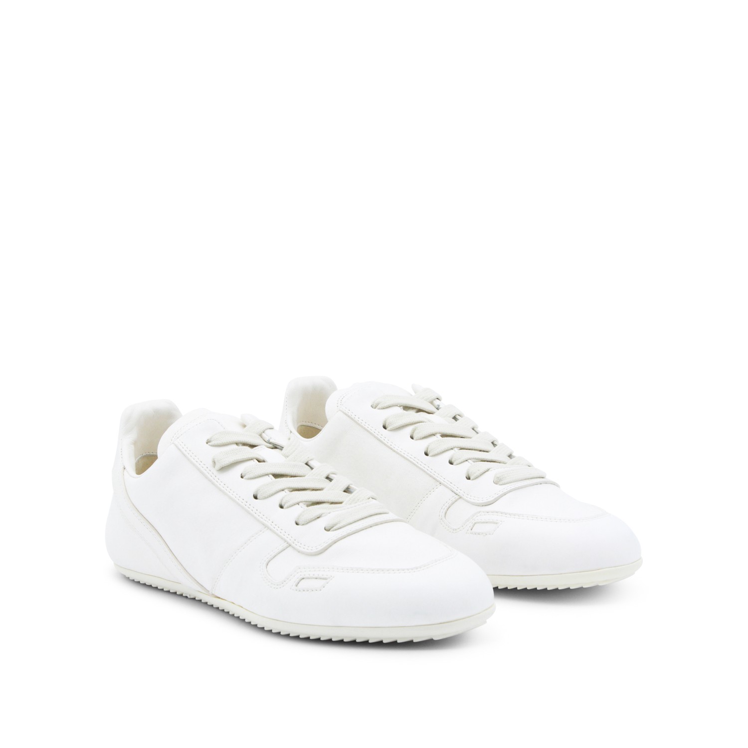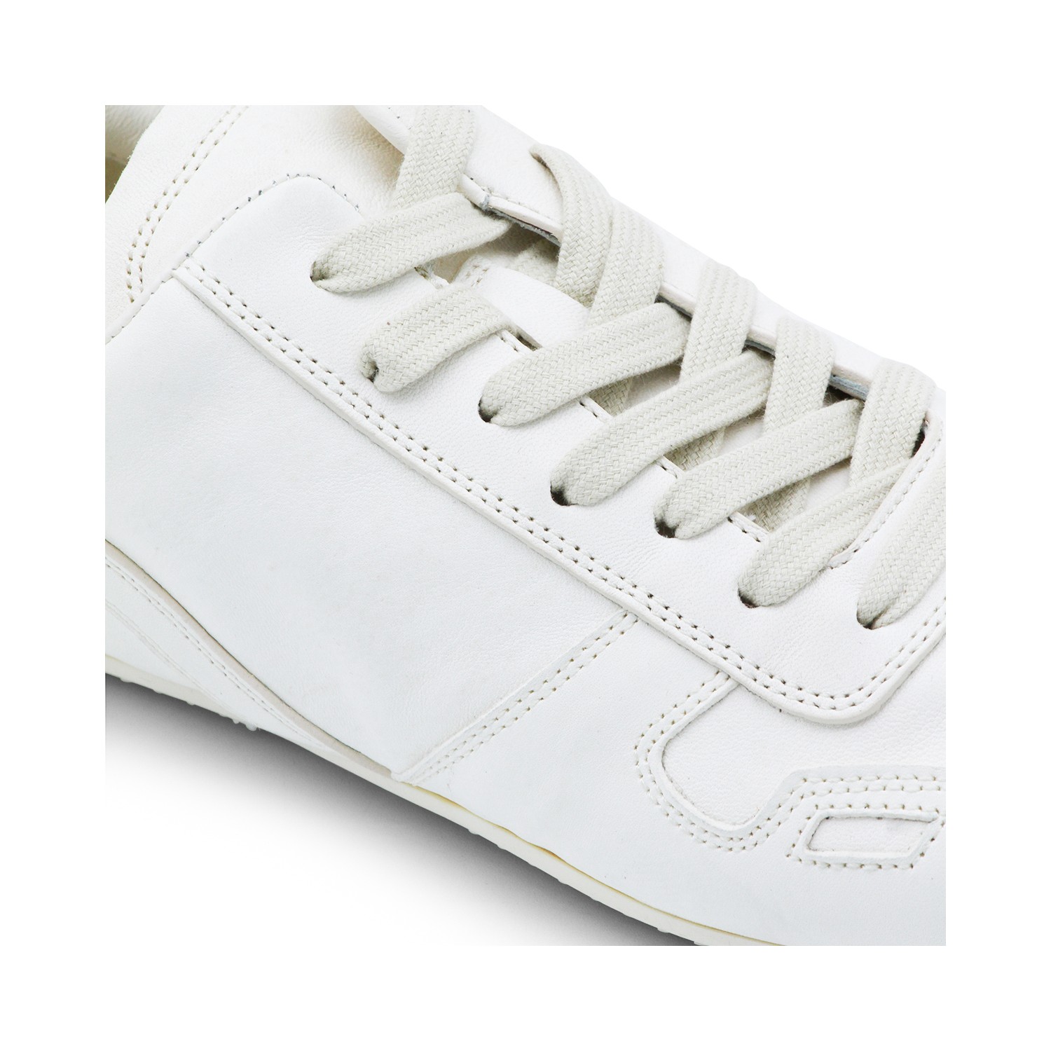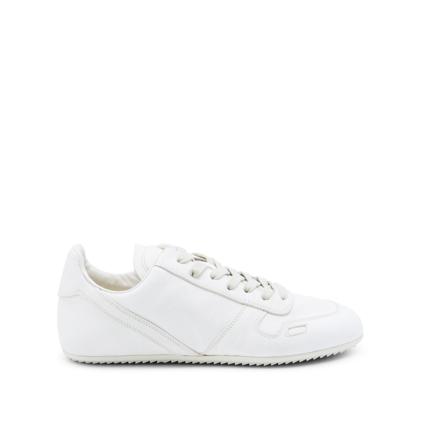 White leather sneakers from Rick Owens featuring round toe, laces fastening, leather sole and shark tooth sole.