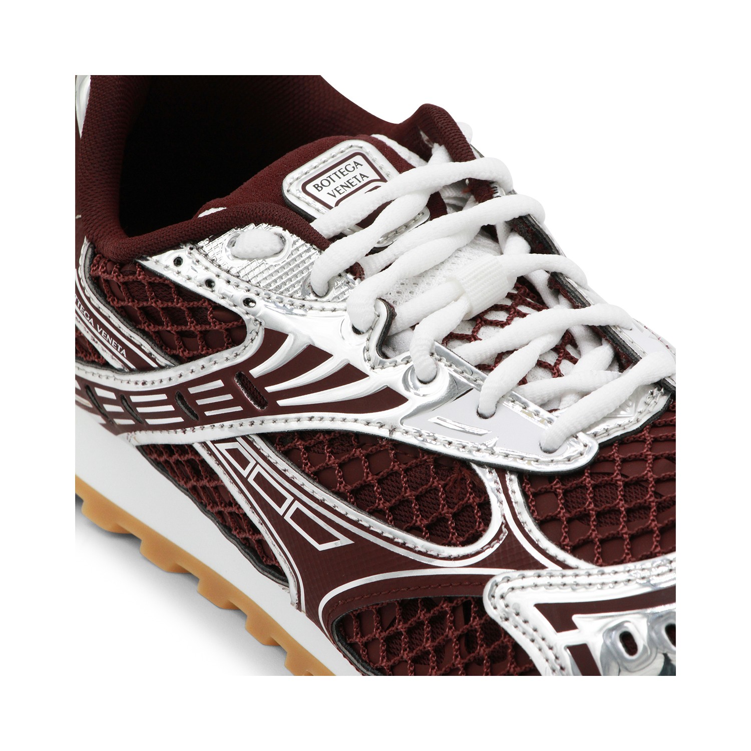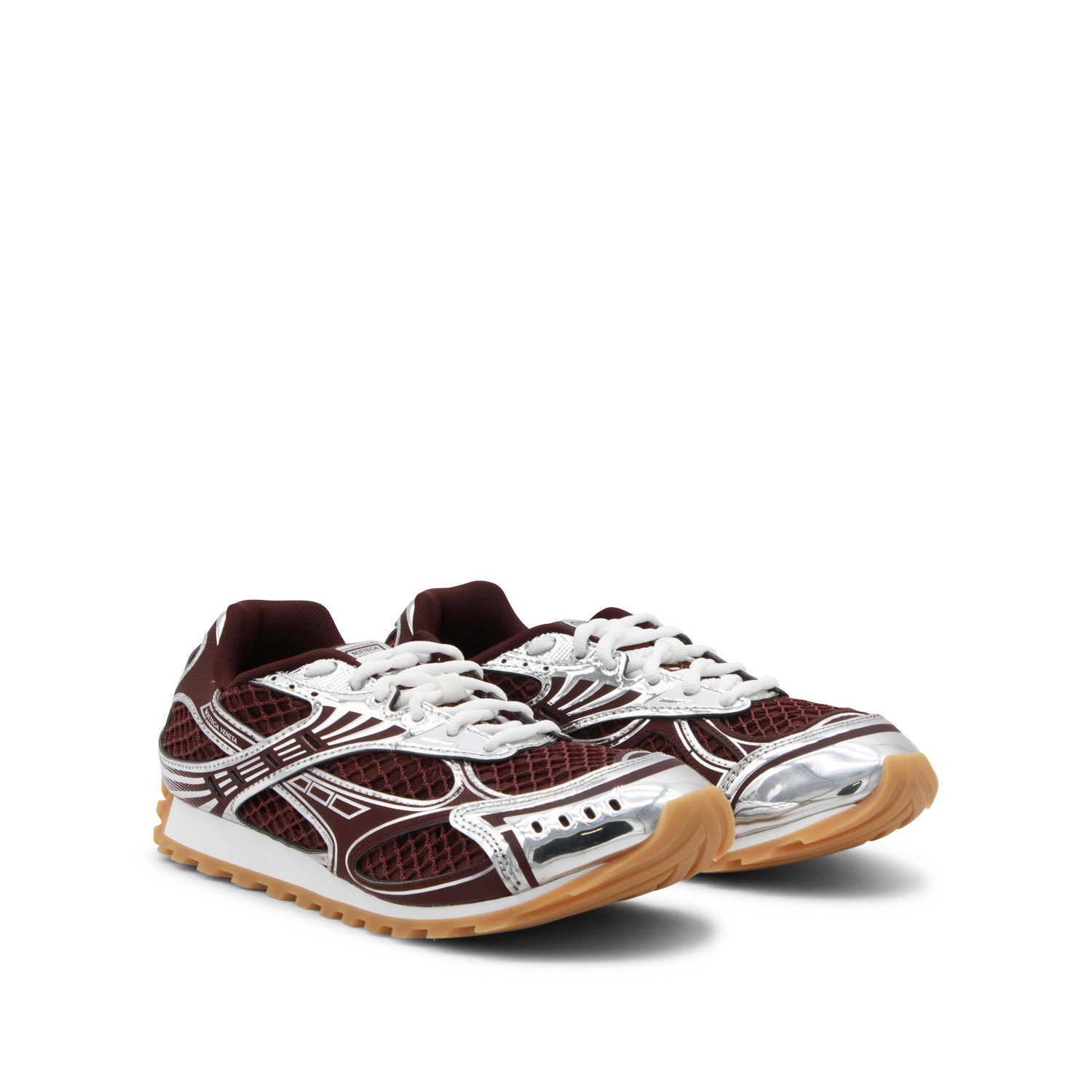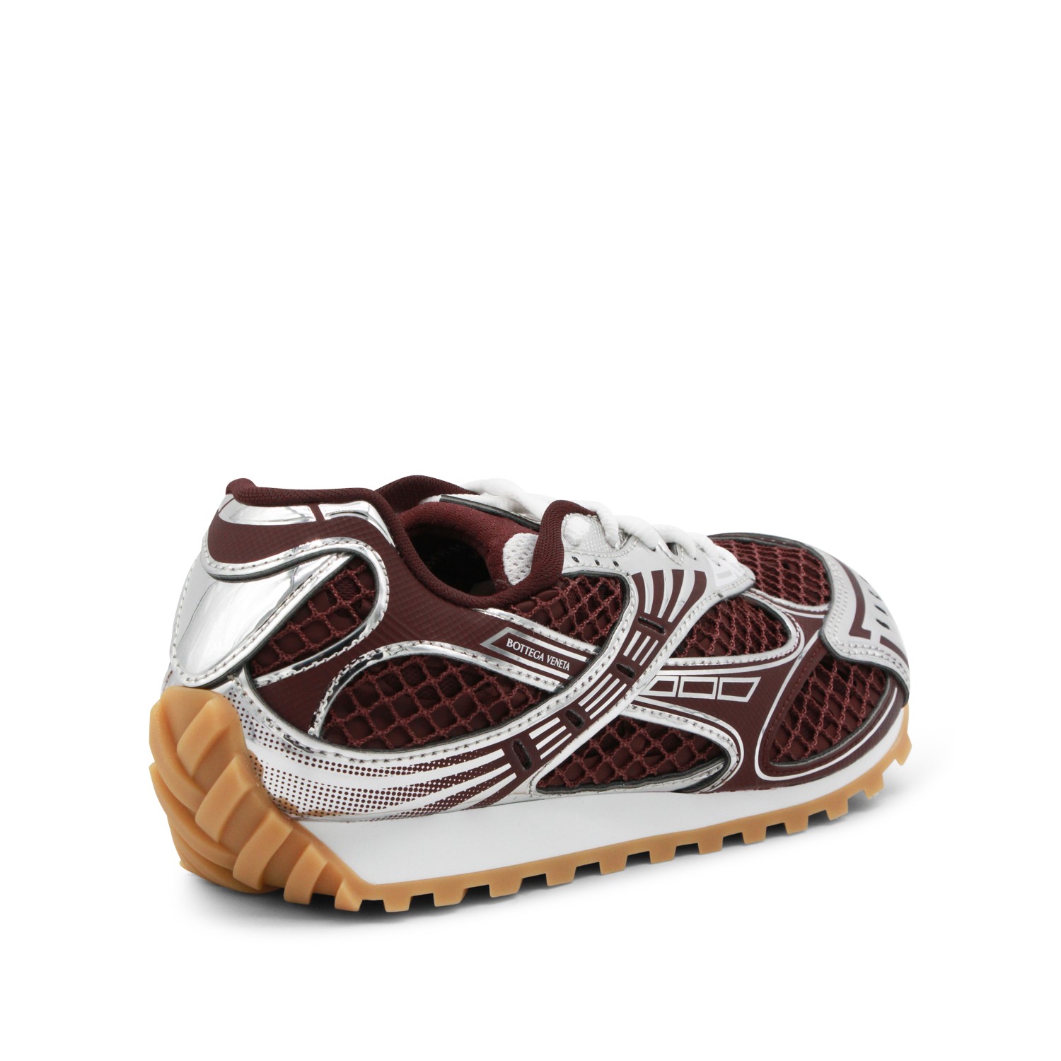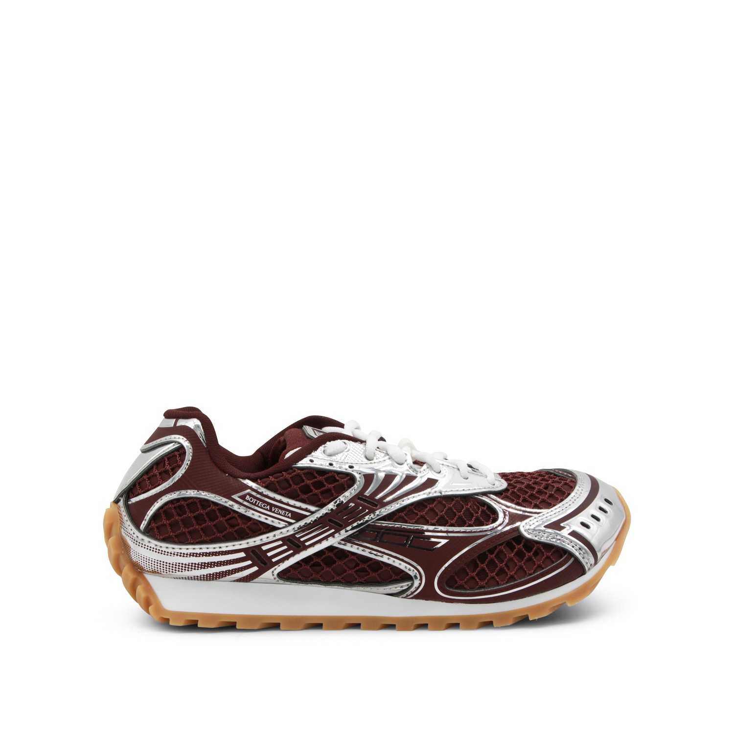 Burgundy and silver Orbit sneakers from Bottega Veneta featuring round toe, laces fastening, mesh details, branded tongue, branded insole and rubber sole.