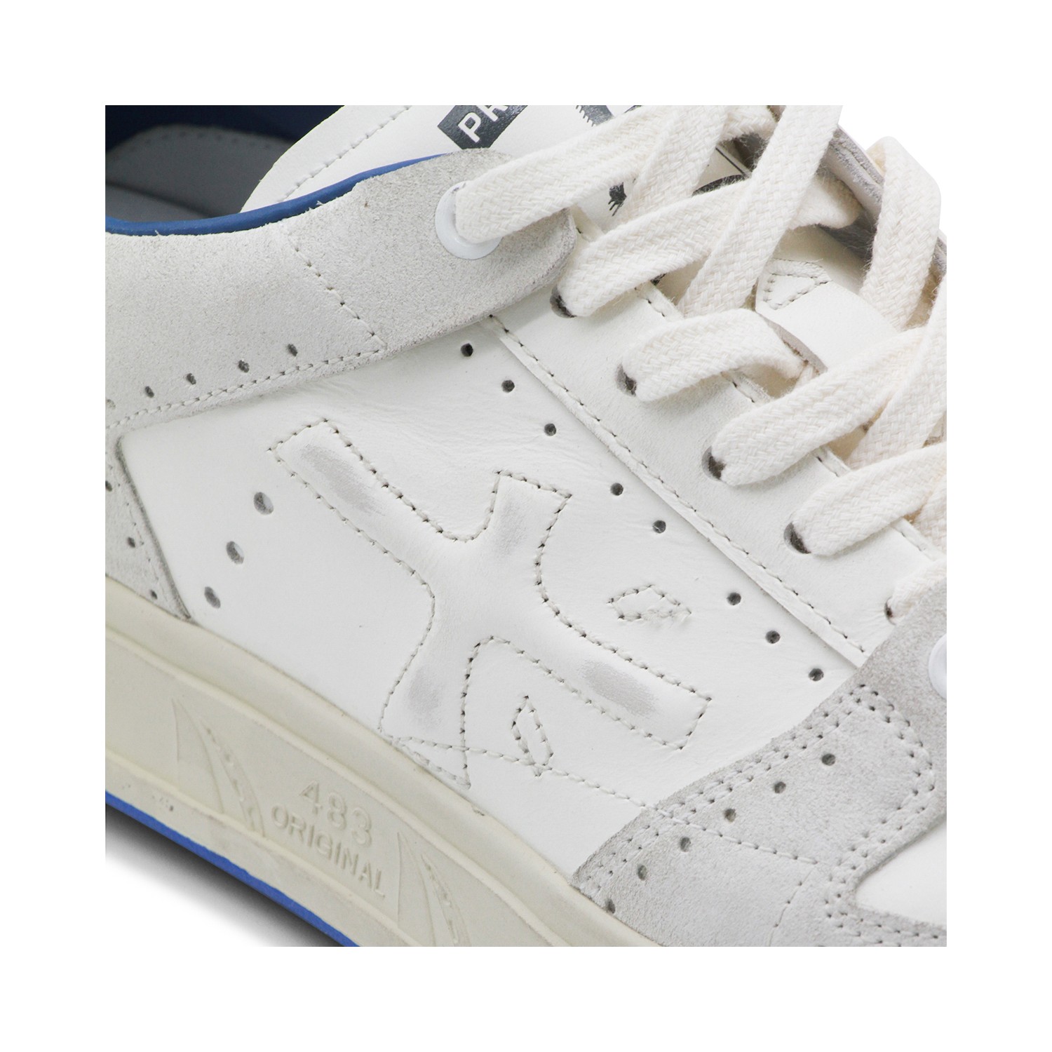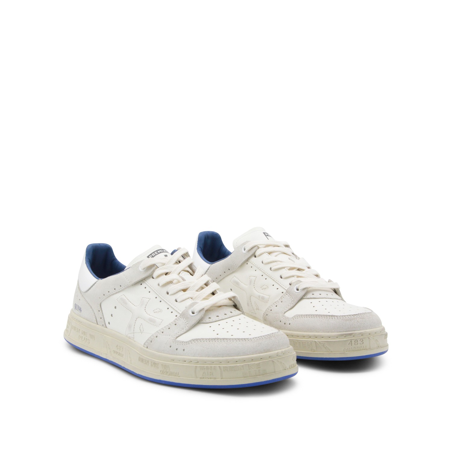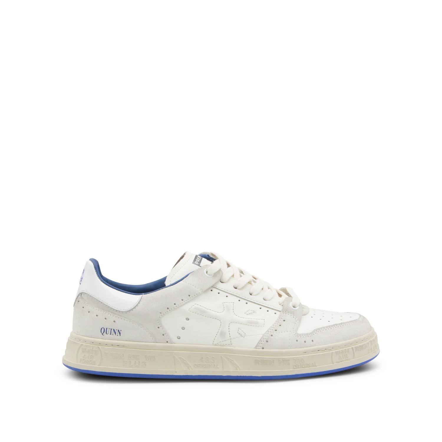 White and blue leather Quinn sneakers from Premiata featuring round toe, laces fastening, suede details, paneled design and rubber sole.