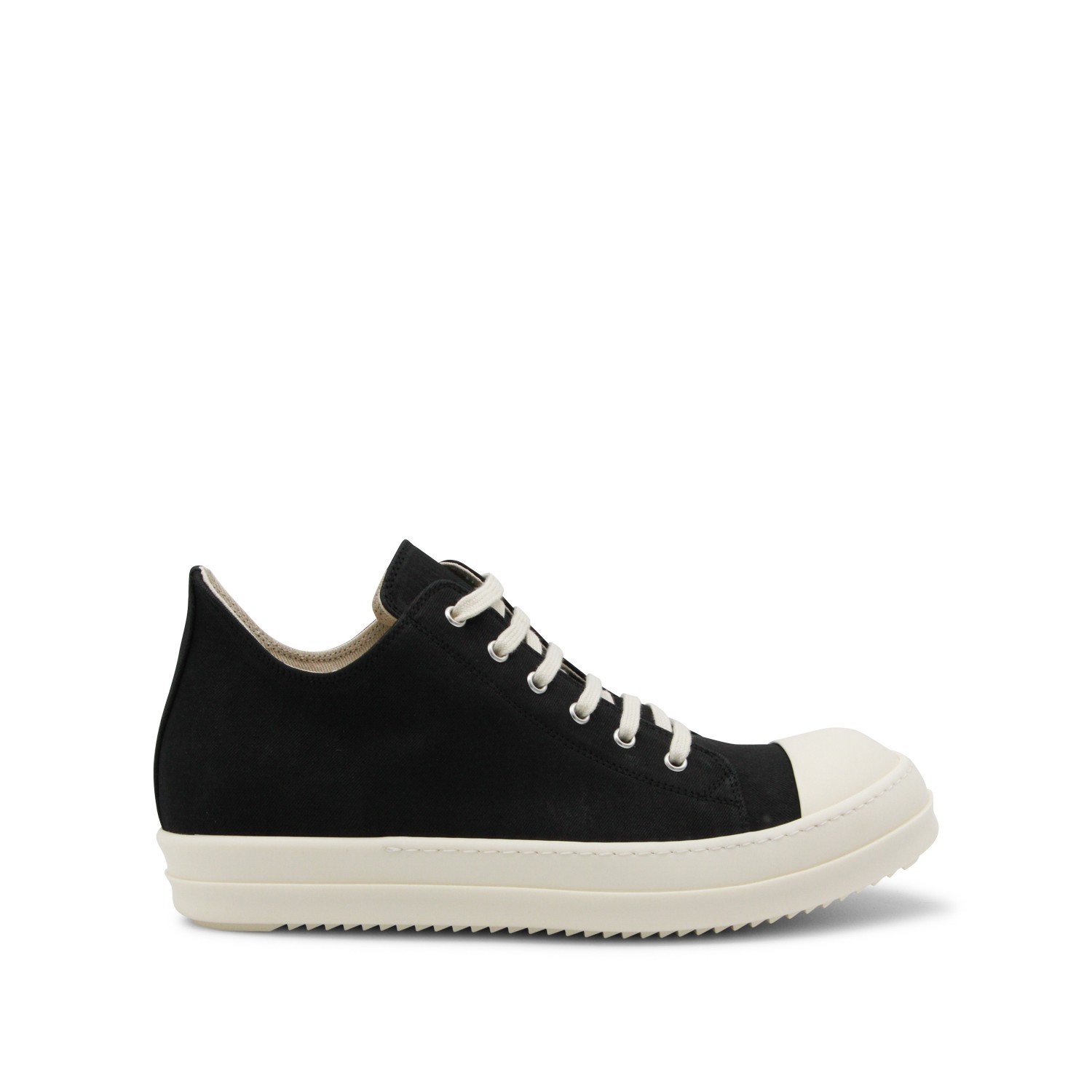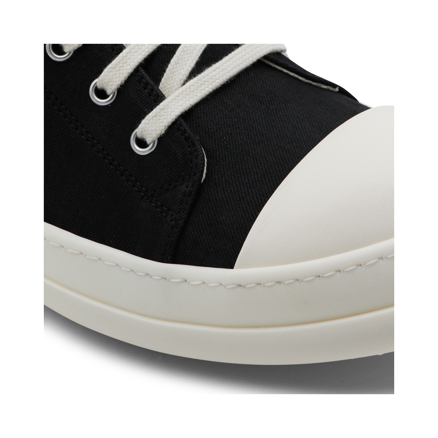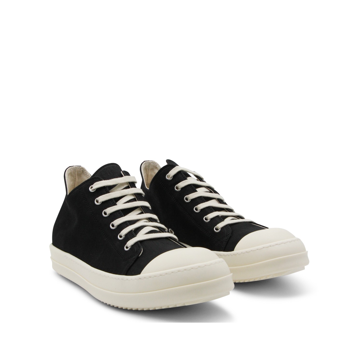 Black and white leather Low sneakers from Rick Owens DRKSHDW featuring round toe, laces fastening, stitched trim, branded insole and rubber sole.