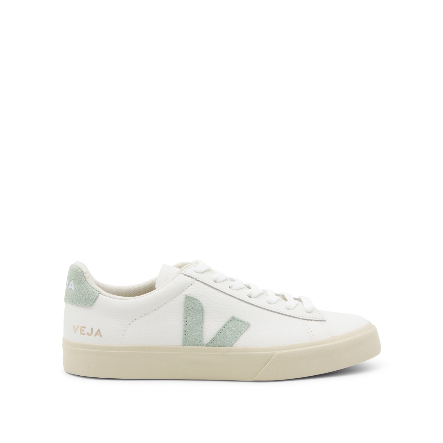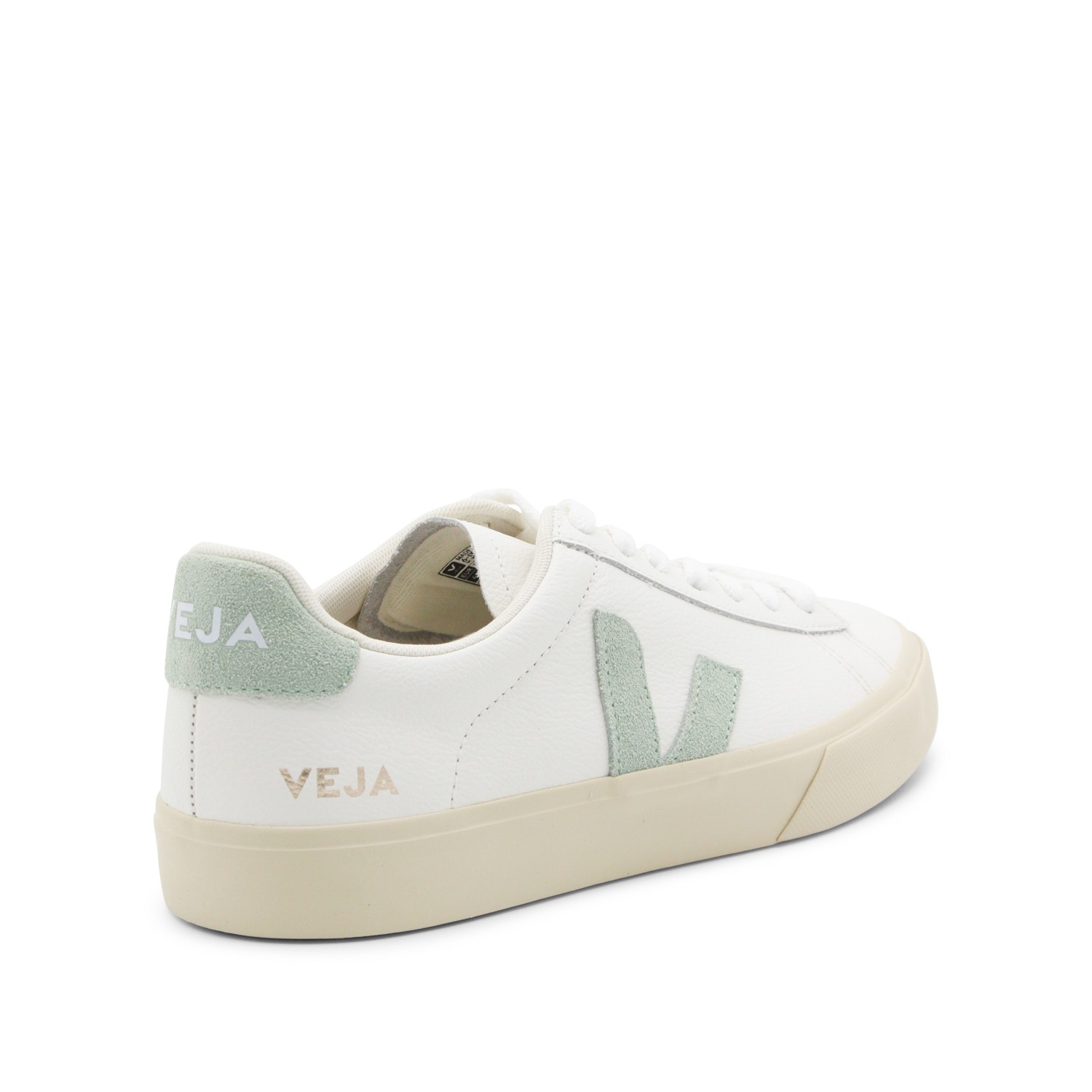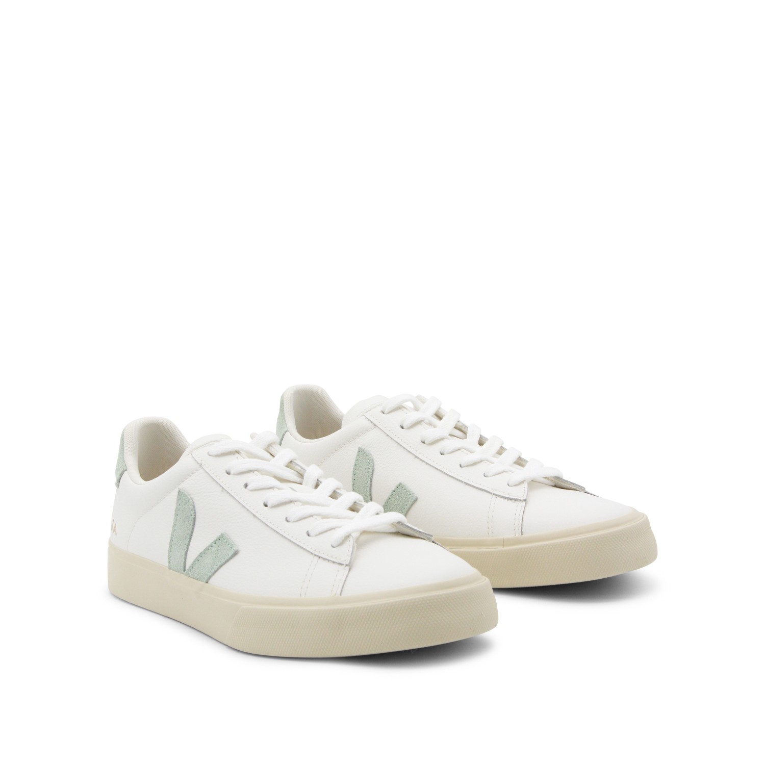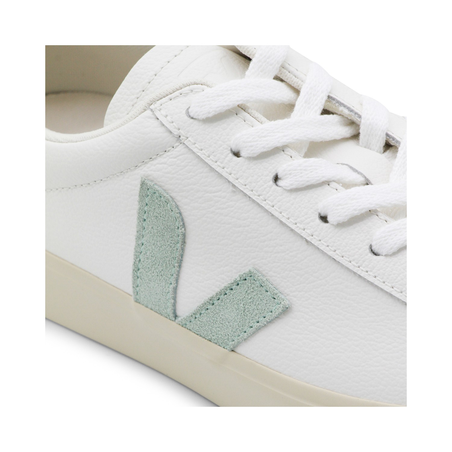 White and light green sneakers from Veja featuring round toe, laces fastening, print logo to the side, branded tongue and rubber sole.