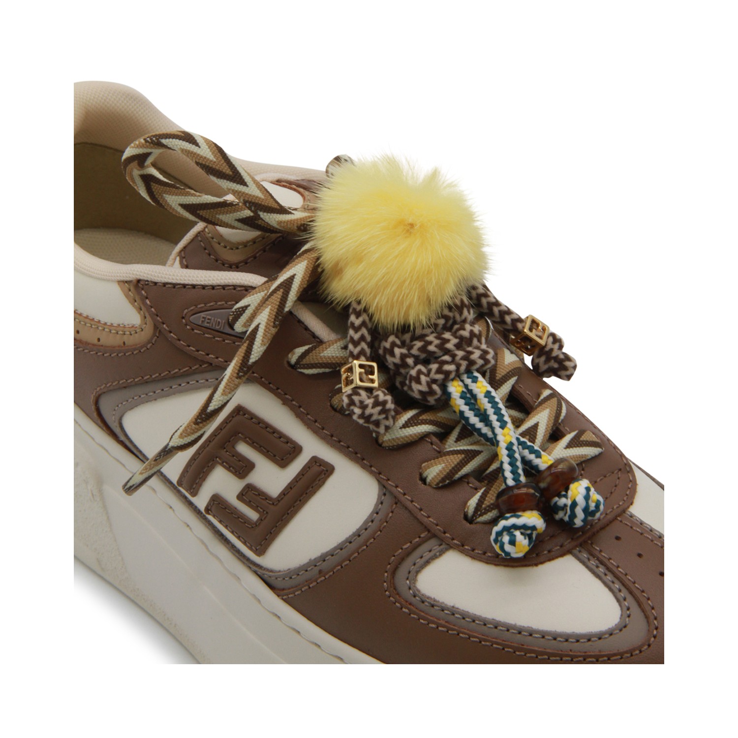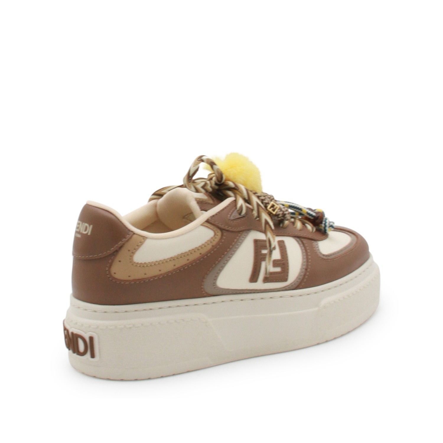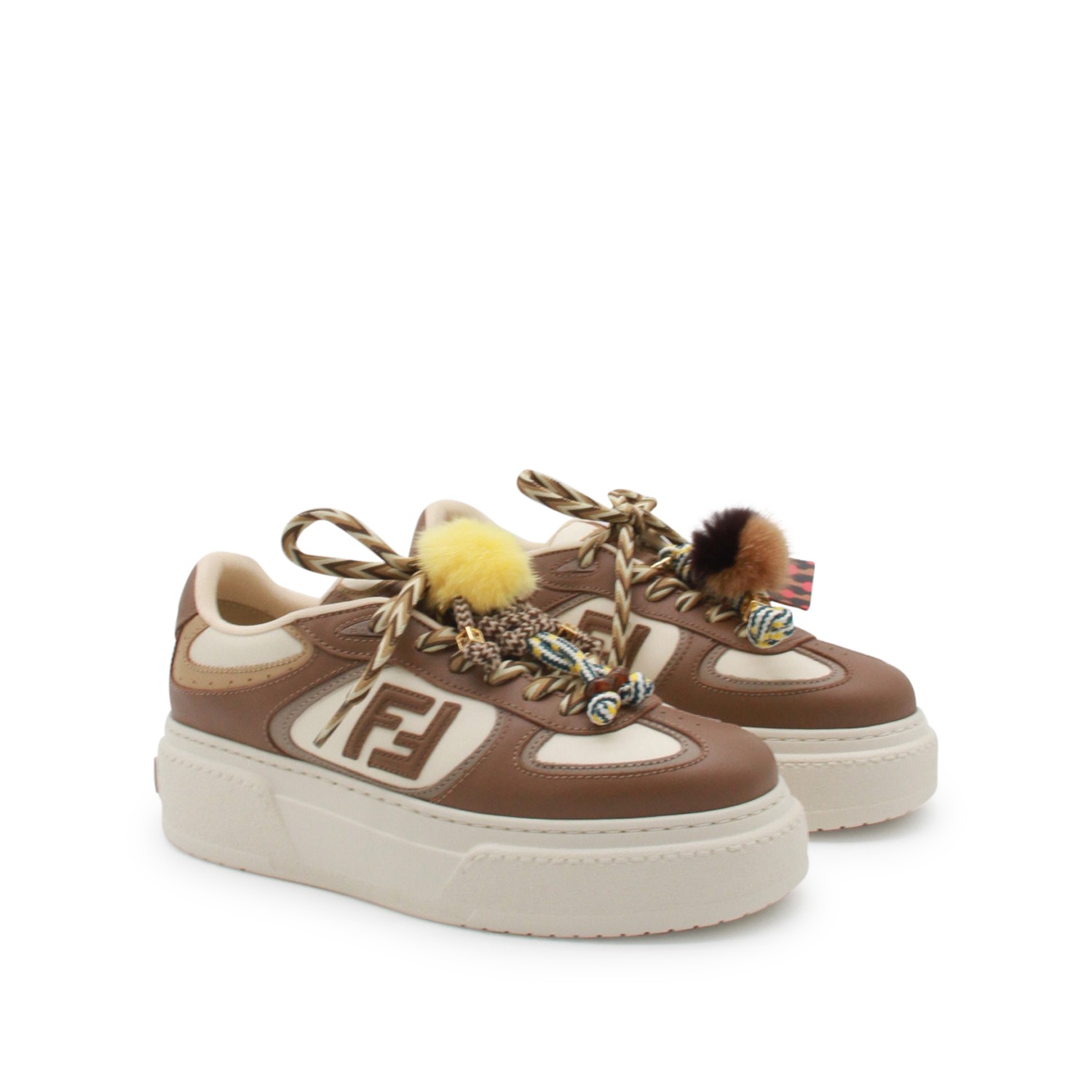 Brown and white leather Match sneakers from Fendi featuring round toe, laces fastening, FF lateral logo, charms, rear logo and platform rubber sole.