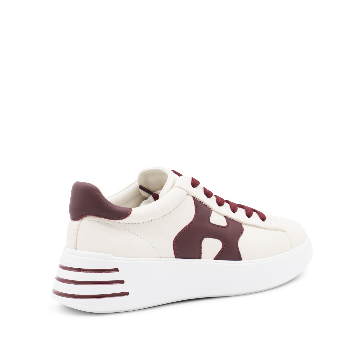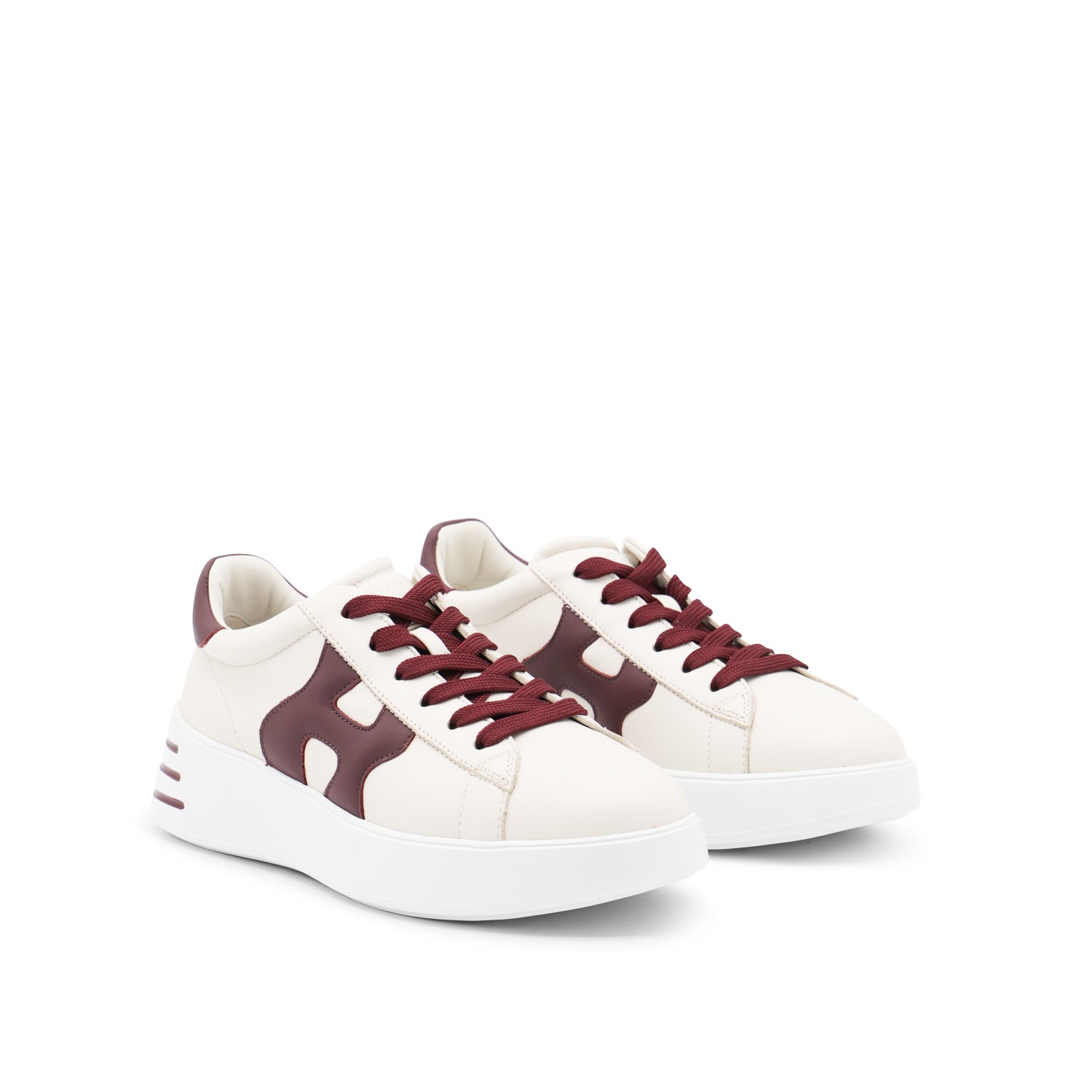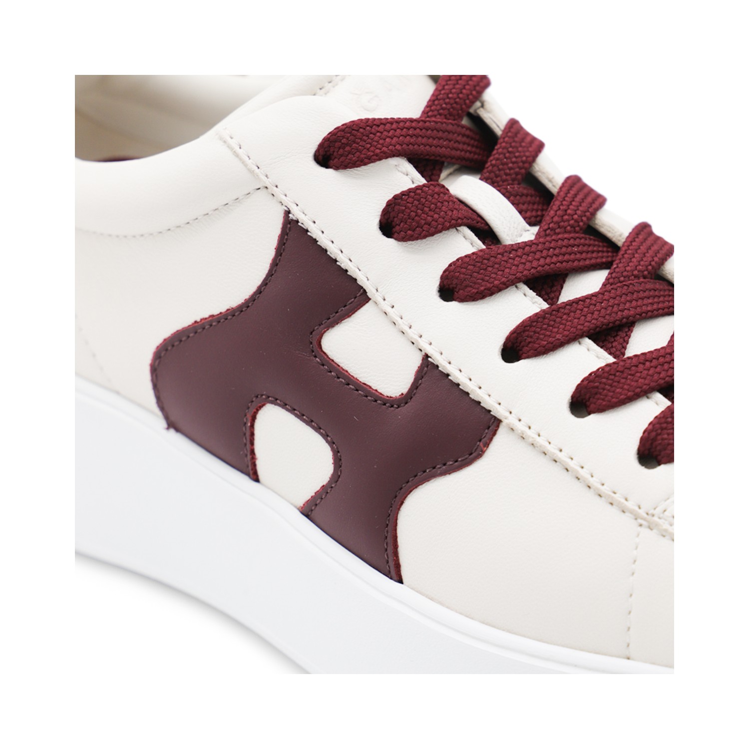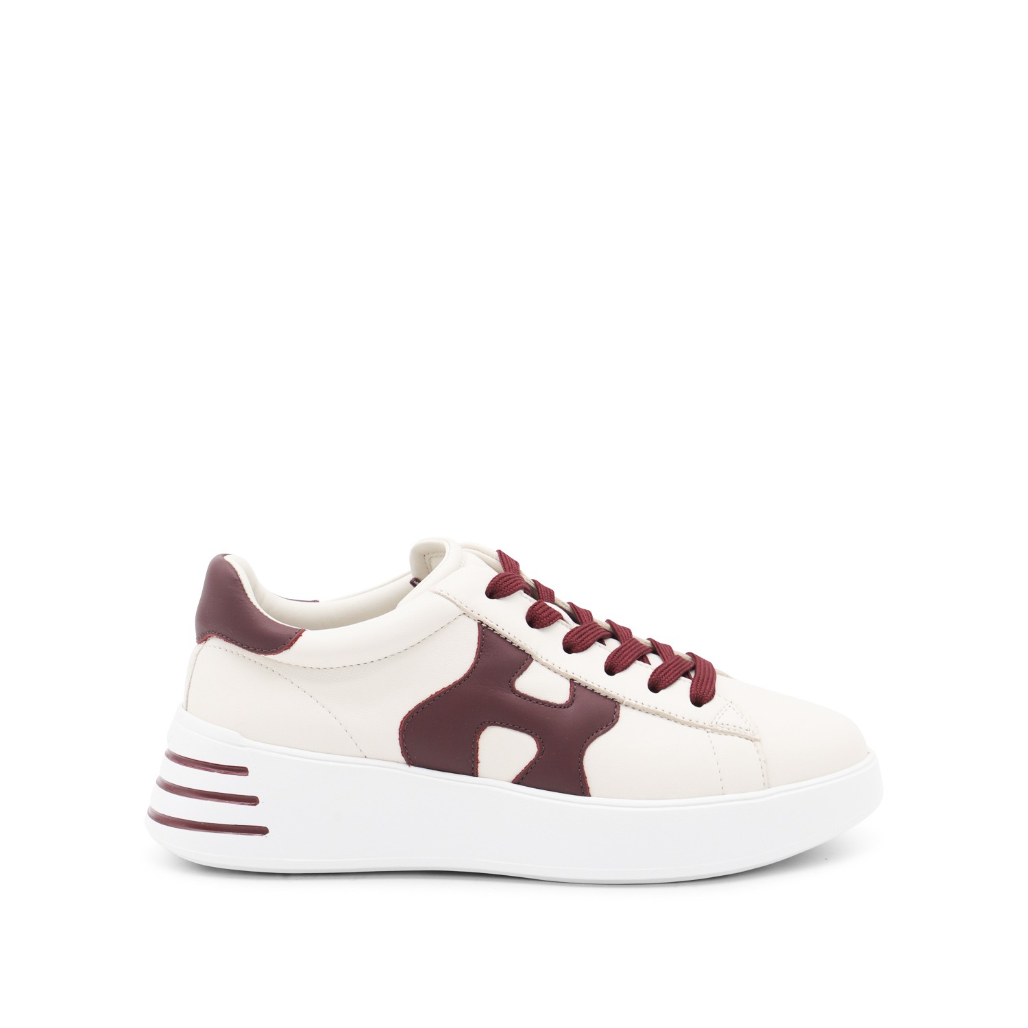 White and burgundy leather sneakers from Hogan featuring lace-up fastening, round toe, branded insole, emboessed logo and oversized rubber sole.