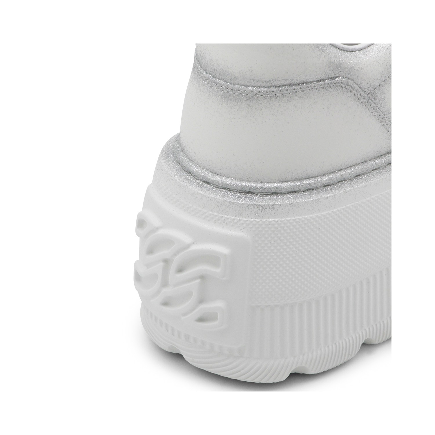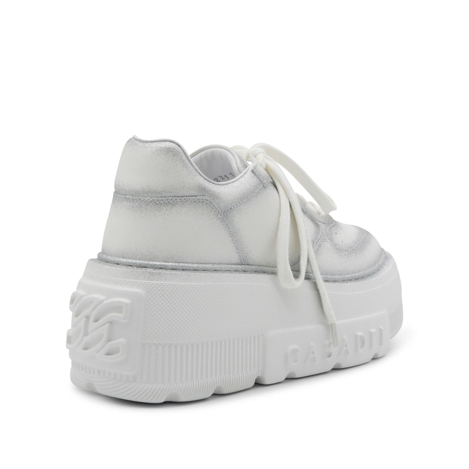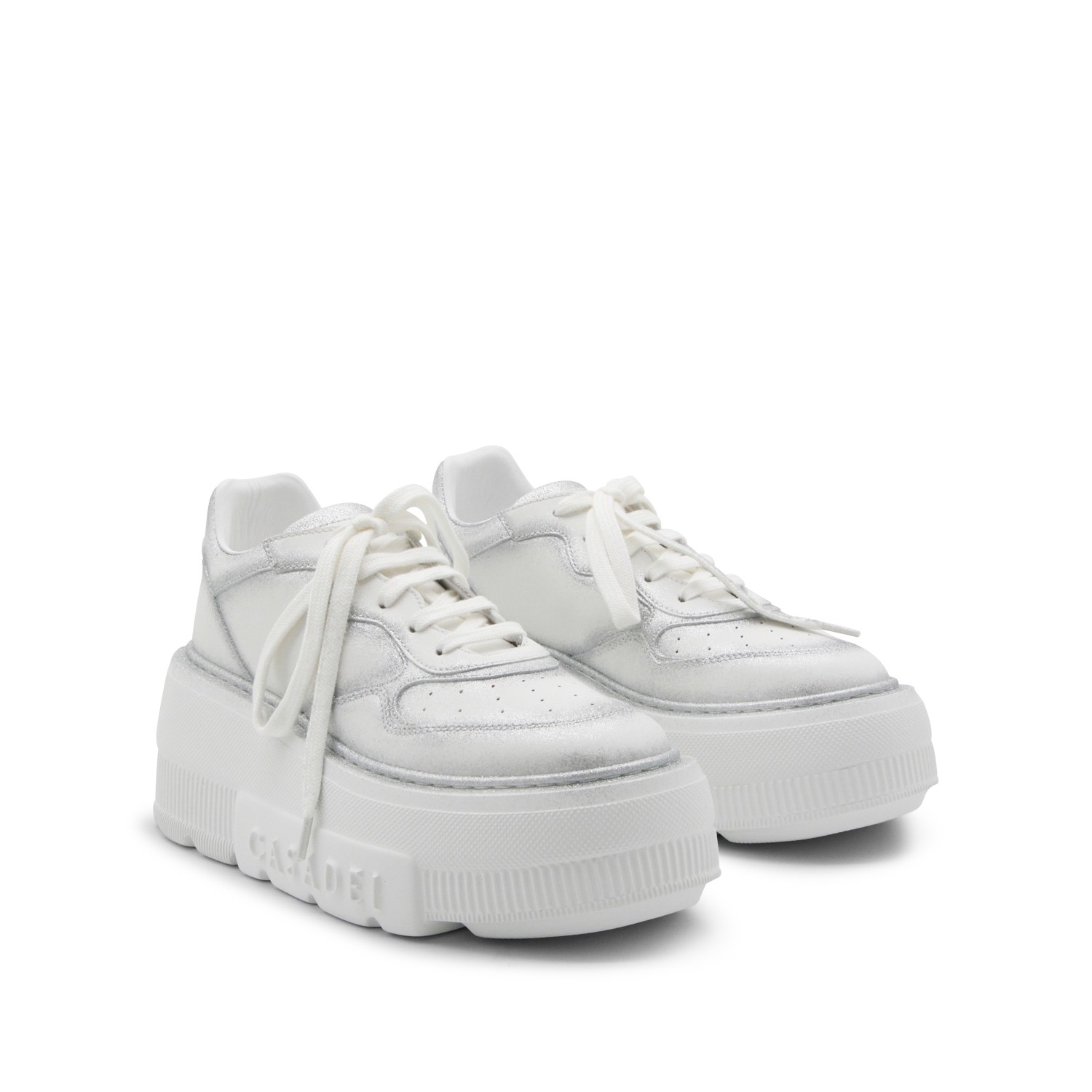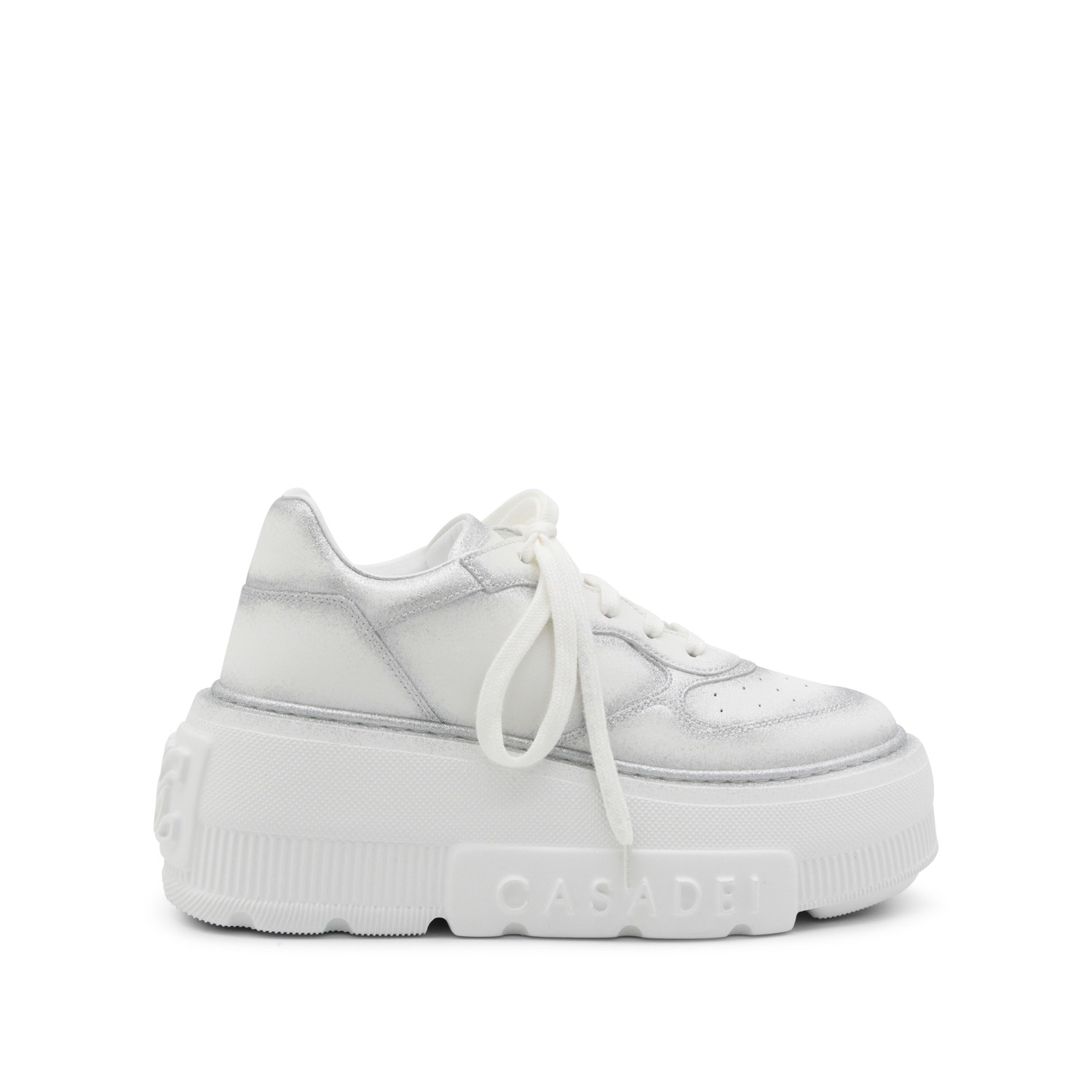 White and silver leather sneakers from Casadei featuring round toe, laces fastening, embossed logo on the sole and platform.