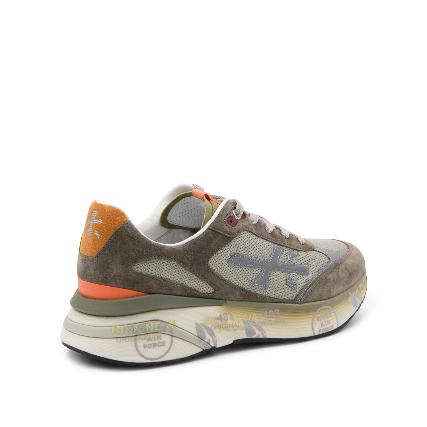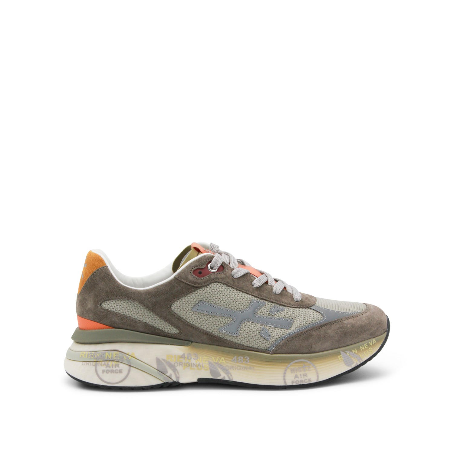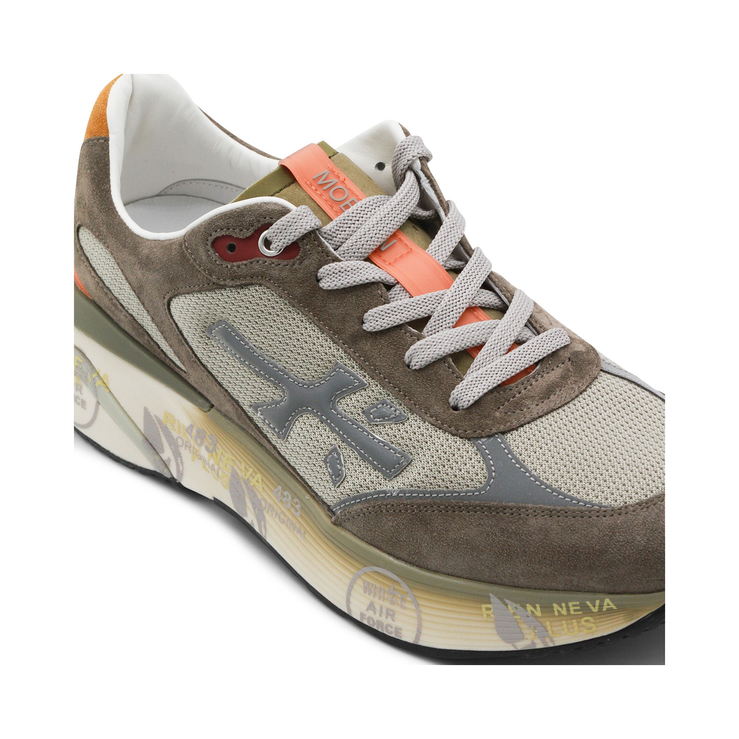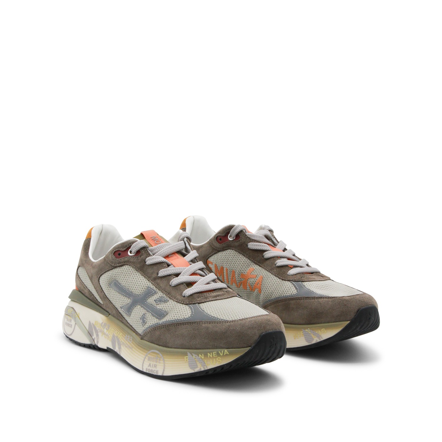 Taupe leather Moerun sneakers from Premiata featuring round toe, laces fastening, paneled design, logo, branded insole and rubber sole.