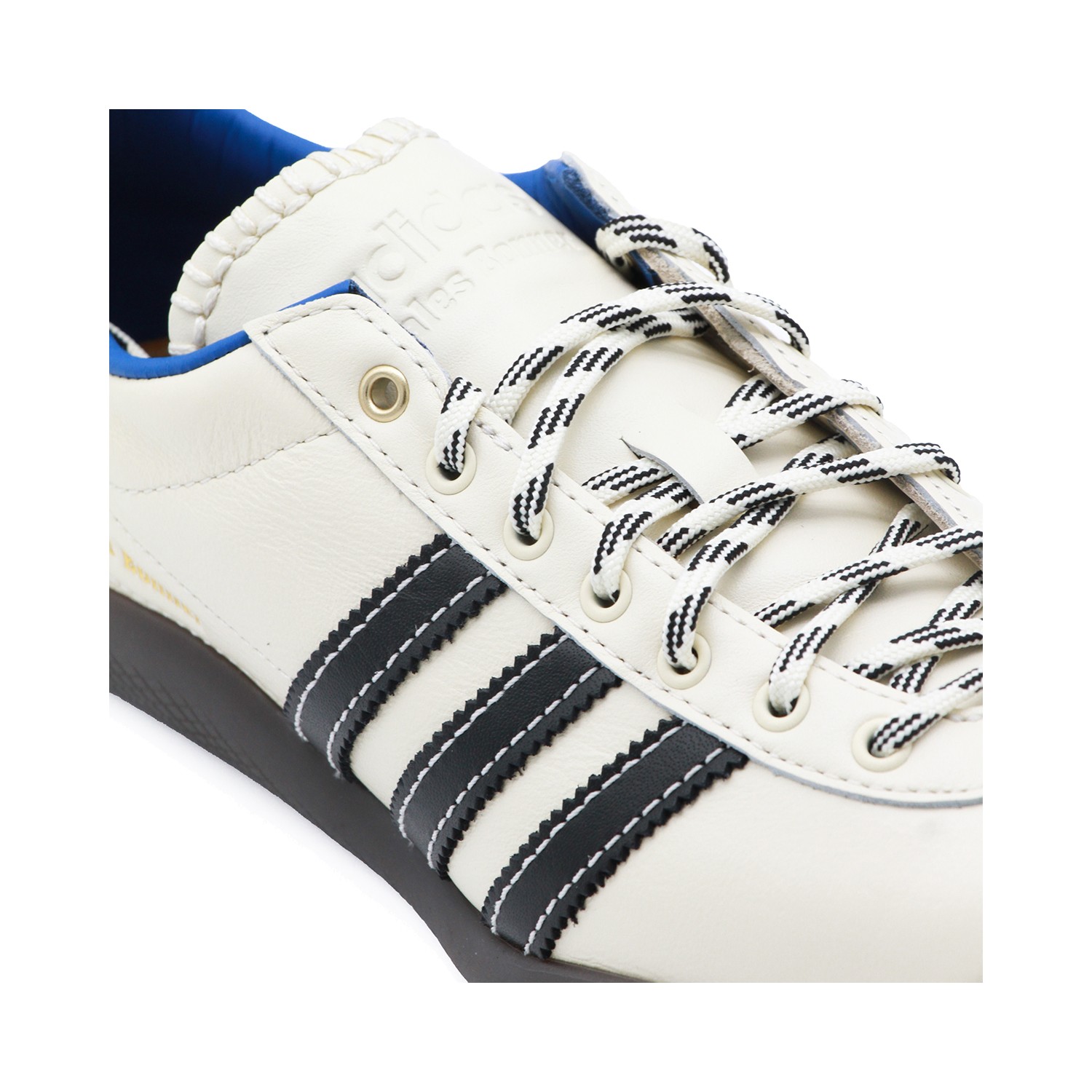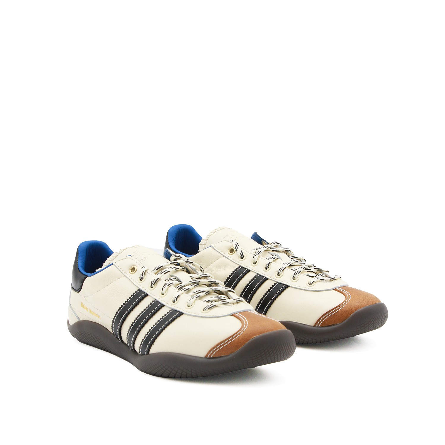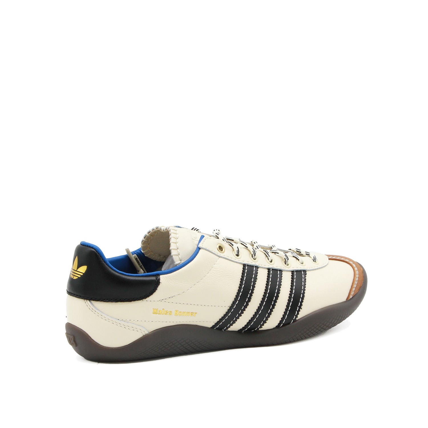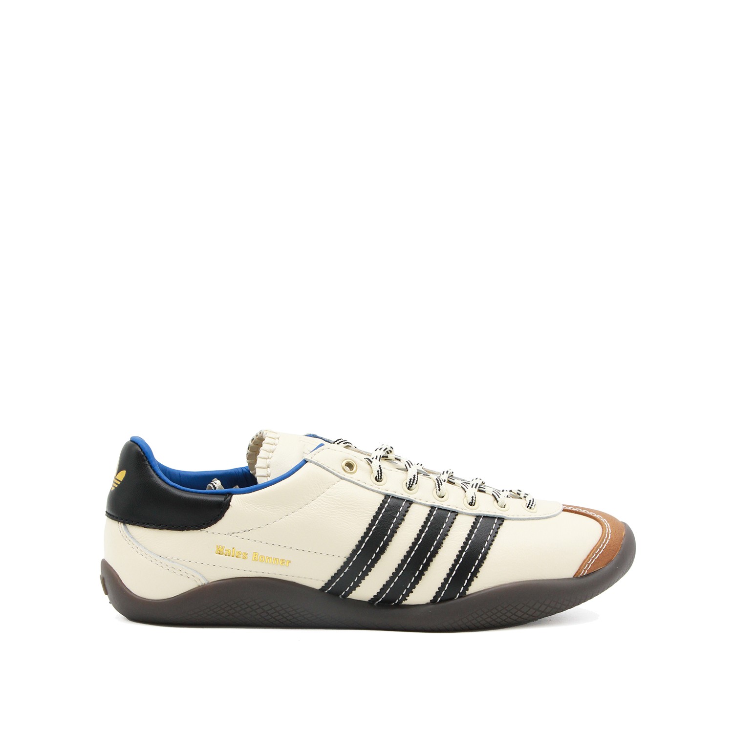 White leather Karintha sneakers from Adidas By Wales Bonner featuring round toe, laces fastening, stripes at side, logo, contrasting heel counter, branded insole and rubber sole.
