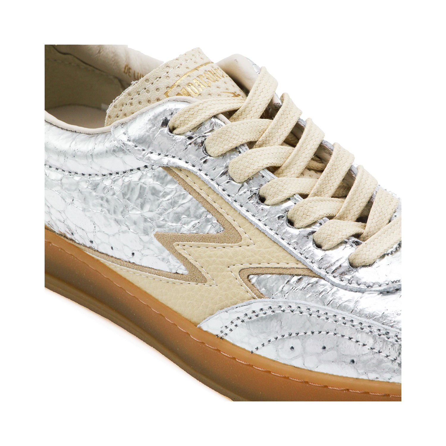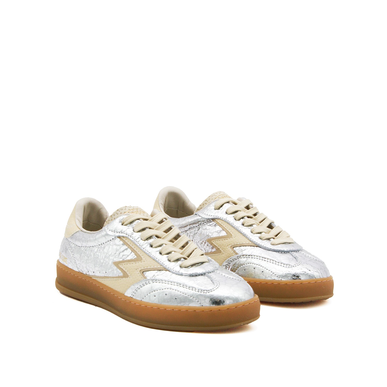 Silver leather Club sneakers from Moaconcept featuring round toe, laces fastening, laminated effect, logo, branded tongue and rubber sole.