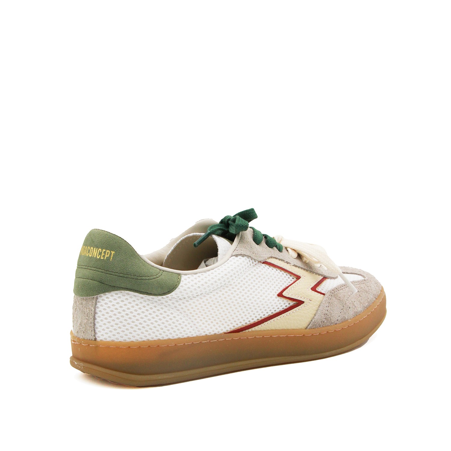 White and green leather Club sneakers from Moaconcept featuring round toe, laces fastening, dirty effect, contrasting heel counter, branded insole and flat rubber sole.