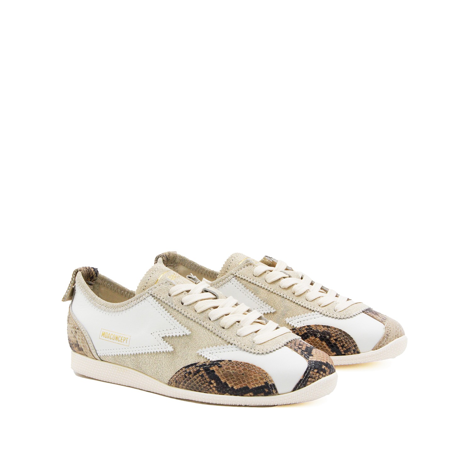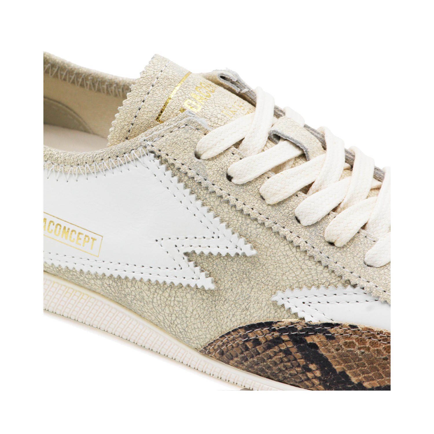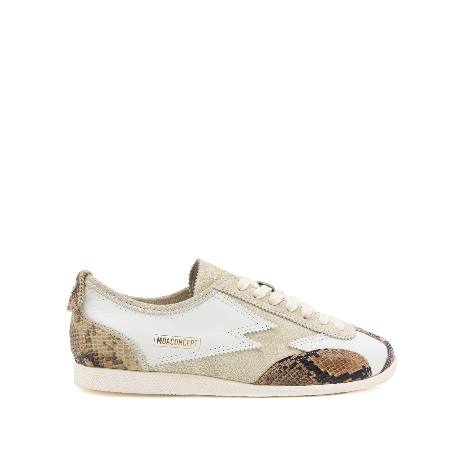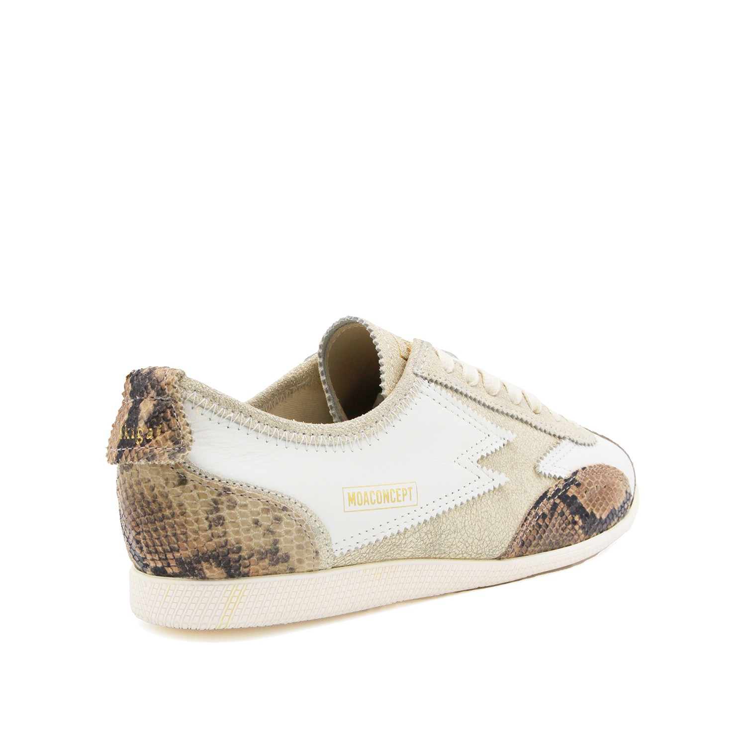 White and beige leather Ikigai sneakers from Moaconcept featuring round toe, laces fastening, snake pattern details, logo print to the side, branded in sole and rubber sole.