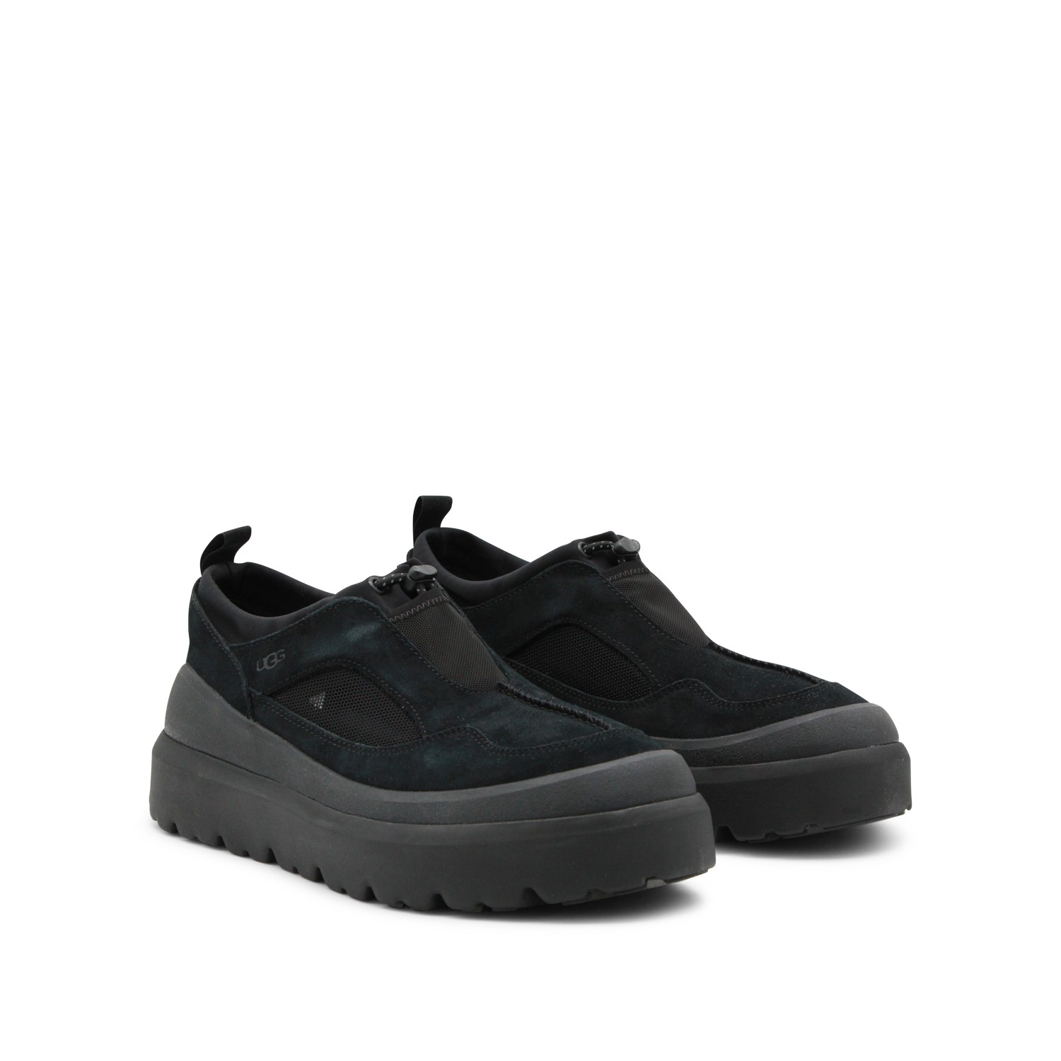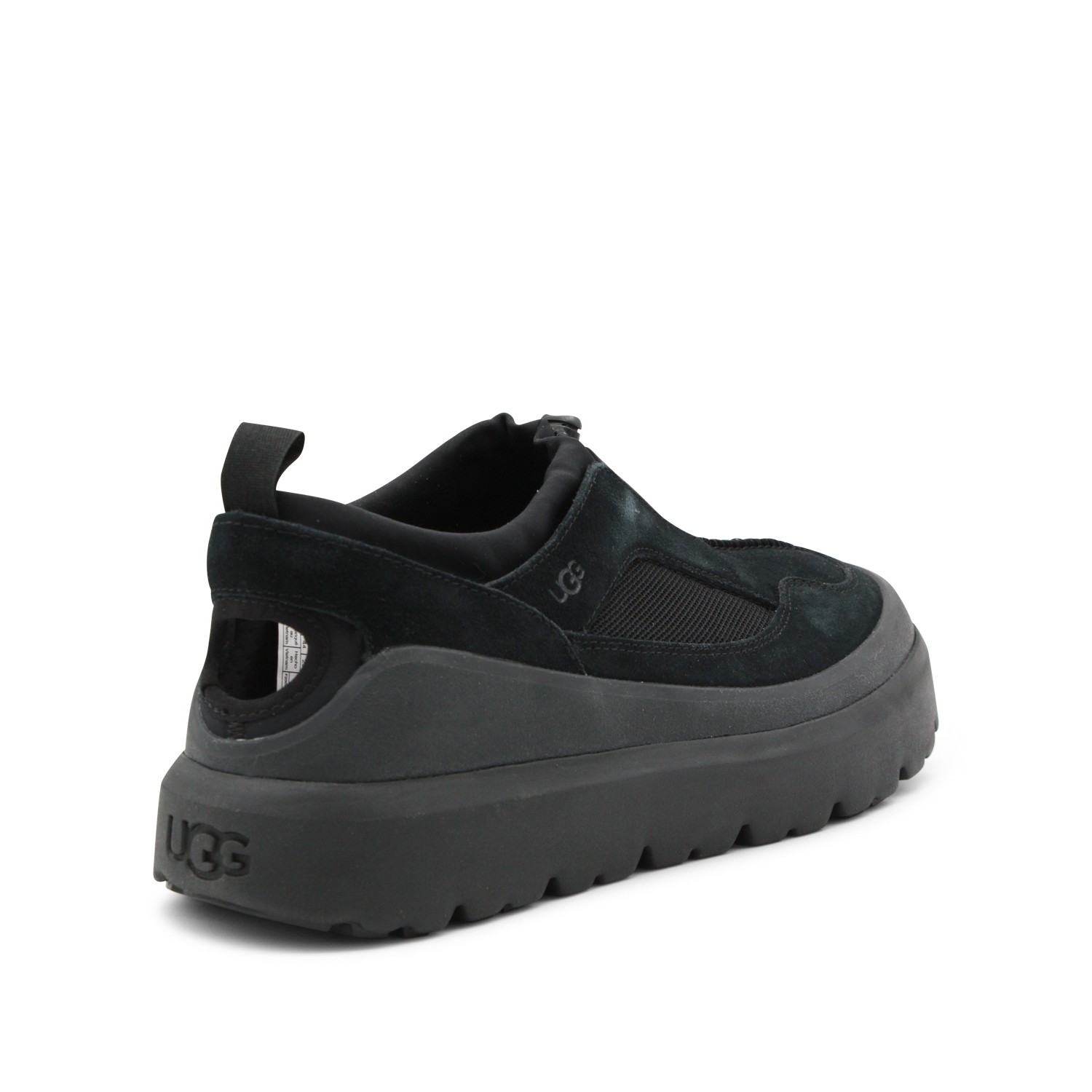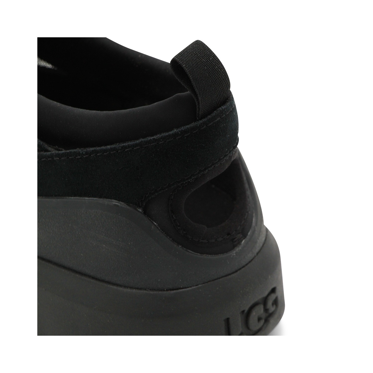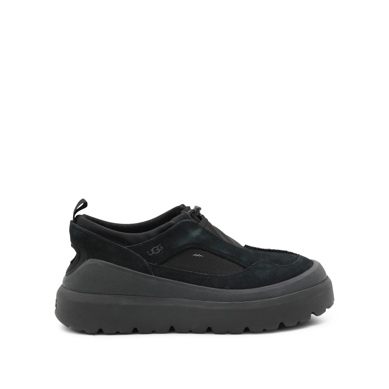 Black leather Heritage Utility Axoid sneakers from UGG featuring round toe, slip-on style, suede, logo, branded insole and rubber sole.