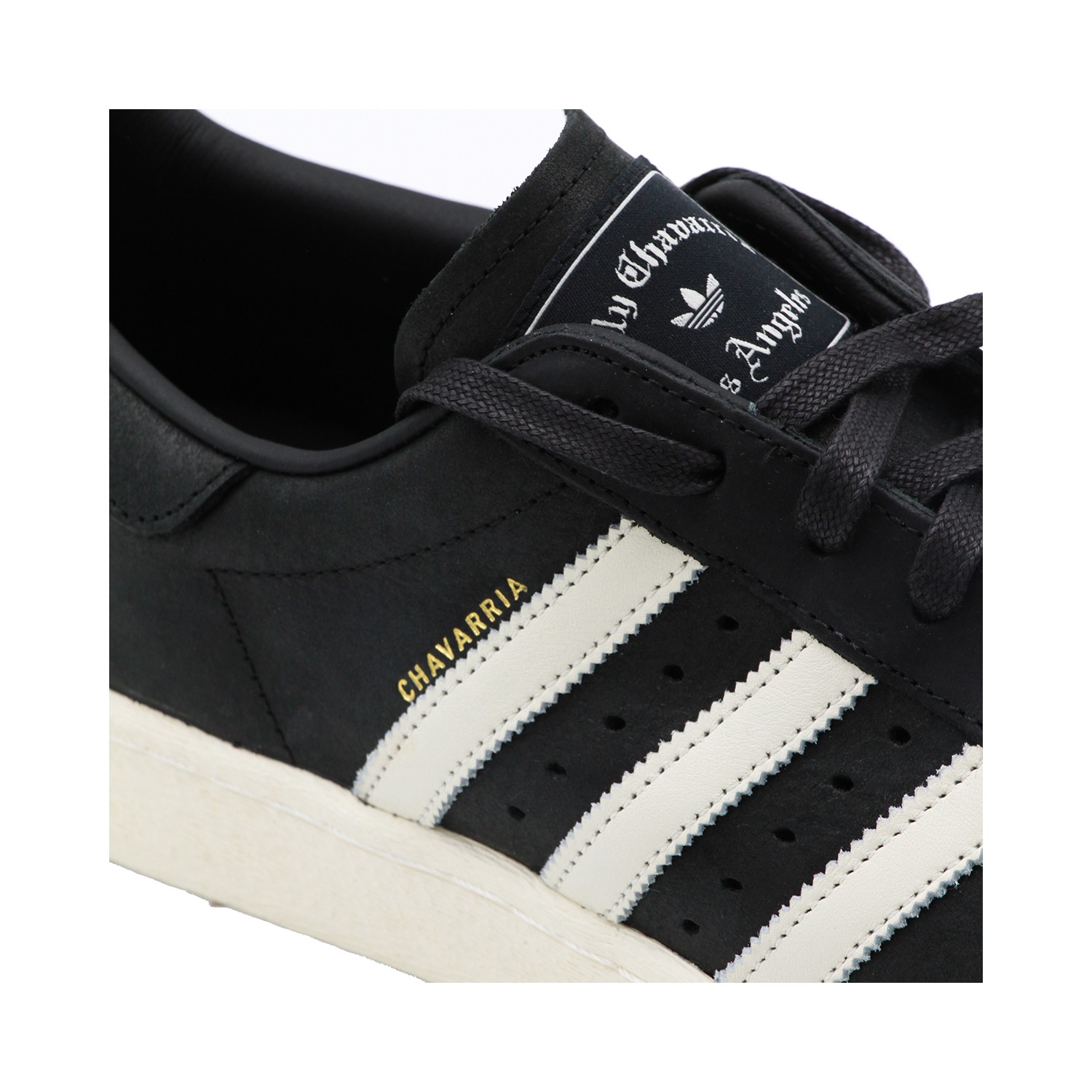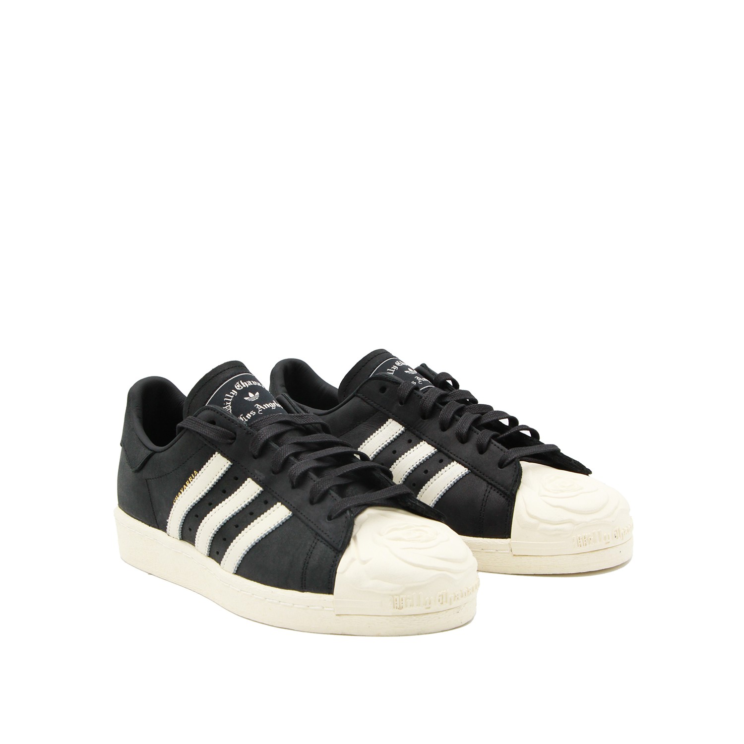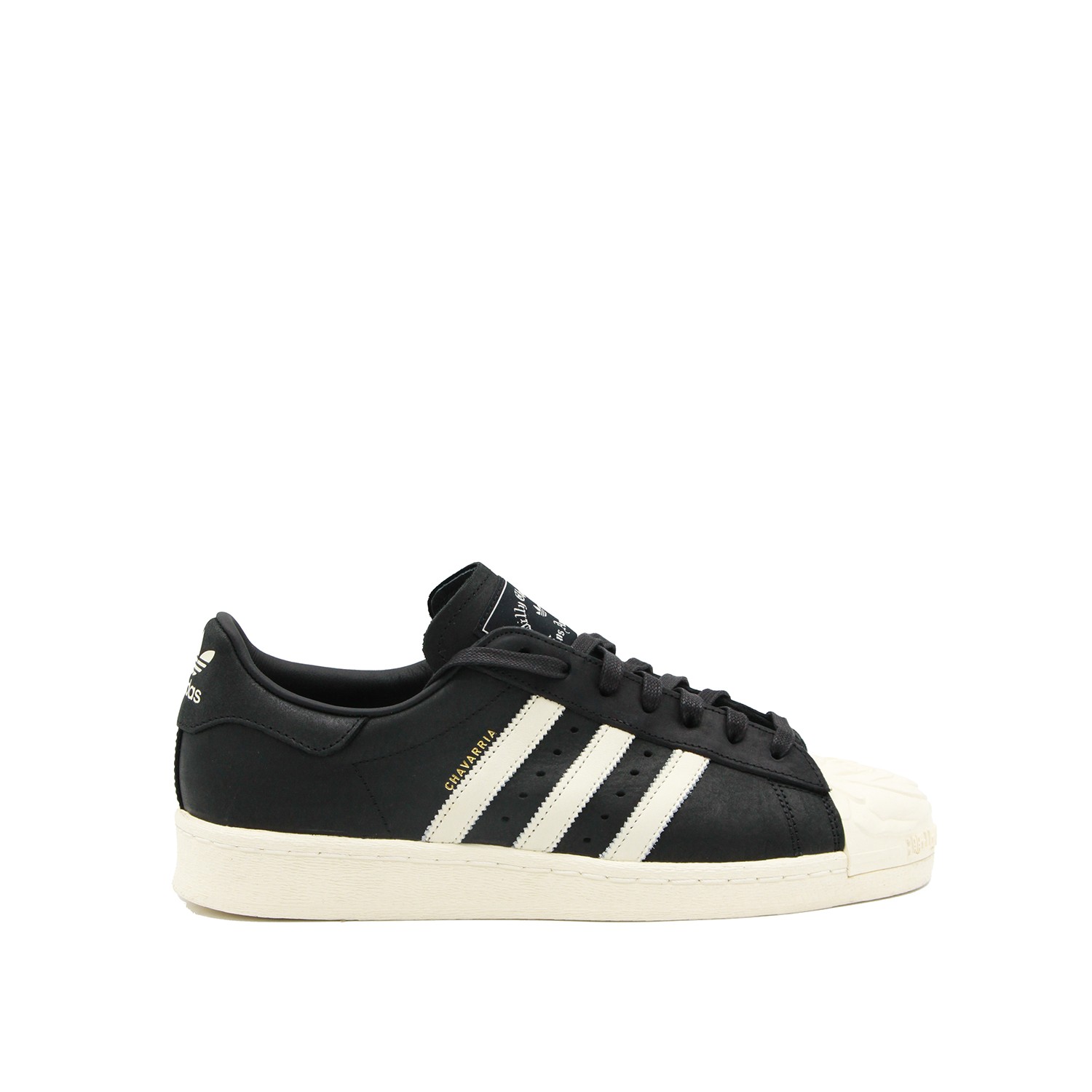 Black and white leather Superstar from Adidas X Willy Chavarria featuring round toe, laces fastening, Stripes to the side, logo, branded tongue and rubber sole.