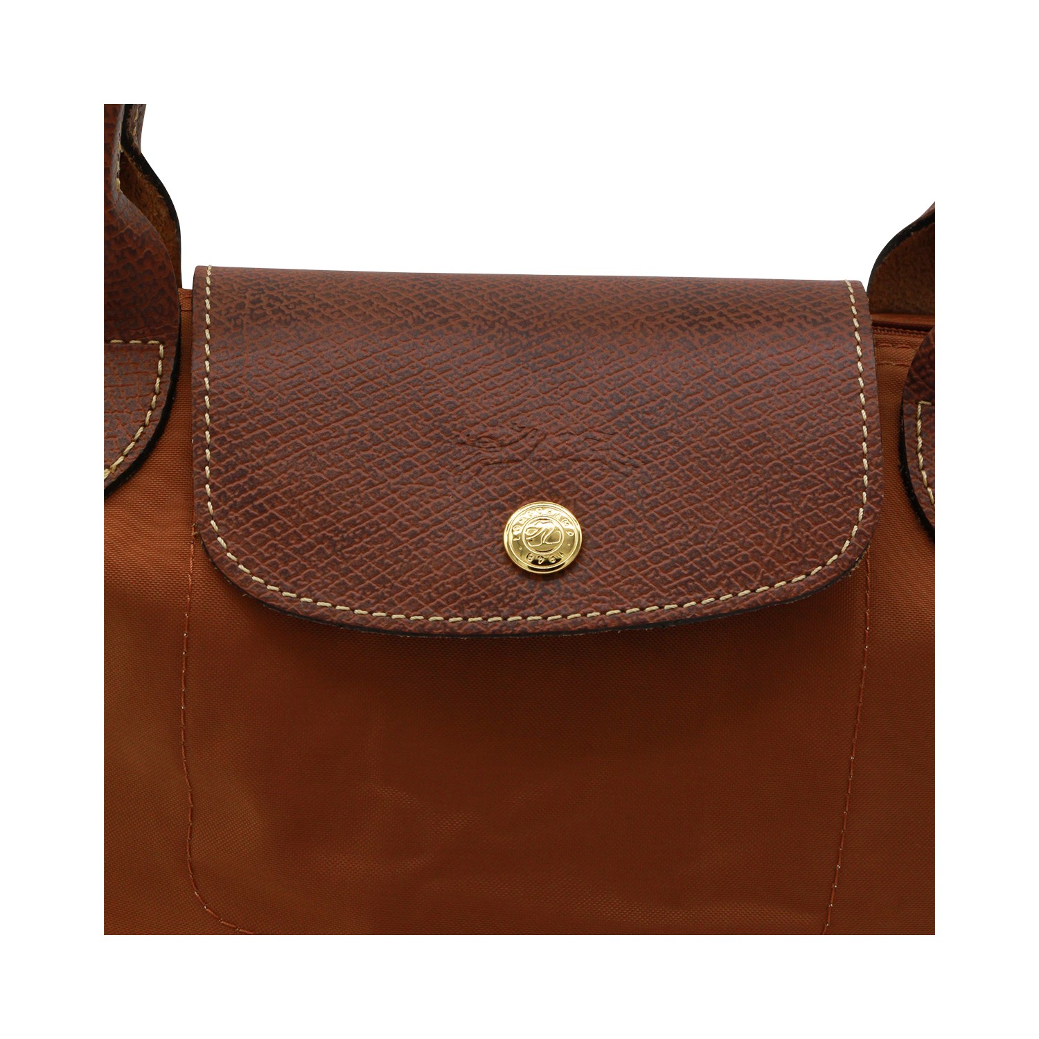 Brown canvas Le Pliage tote bag from Longchamp featuring round top handles, a foldover top with snap closure, a top zip fastening, foldable design, brown leather details, internal zipped pocket and gold-tone hardware.