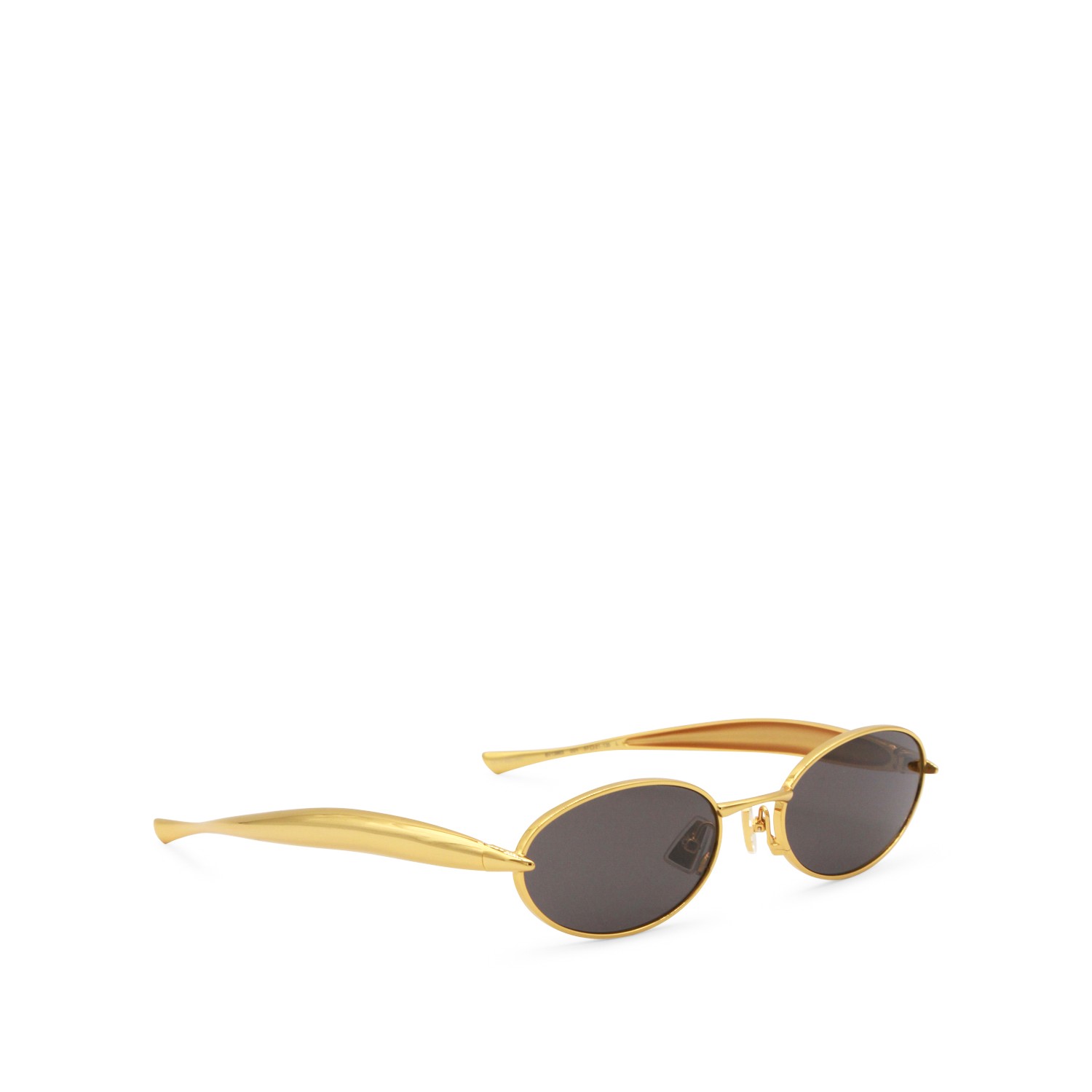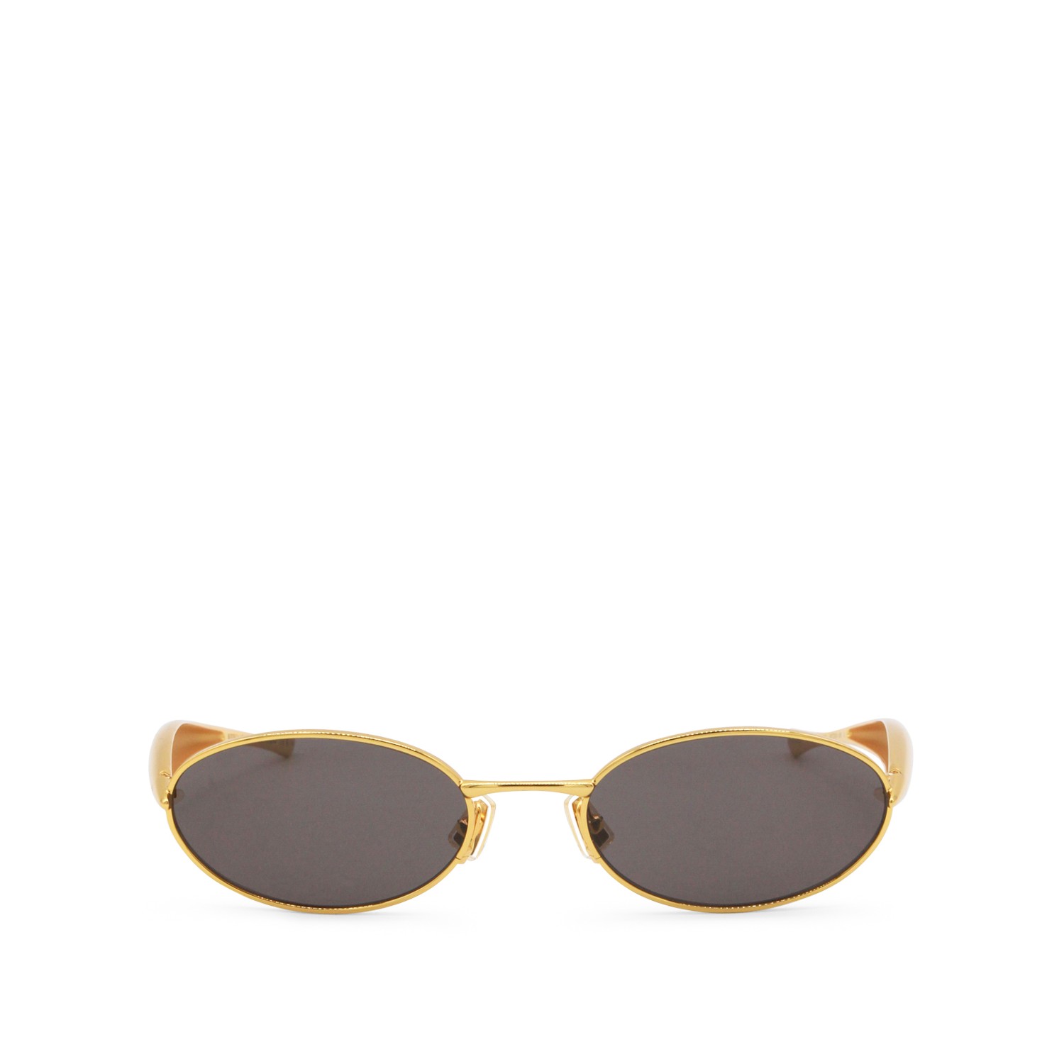 Gold metal sunglass from Bottega Veneta featuring oval shape and gradient grey lenses.