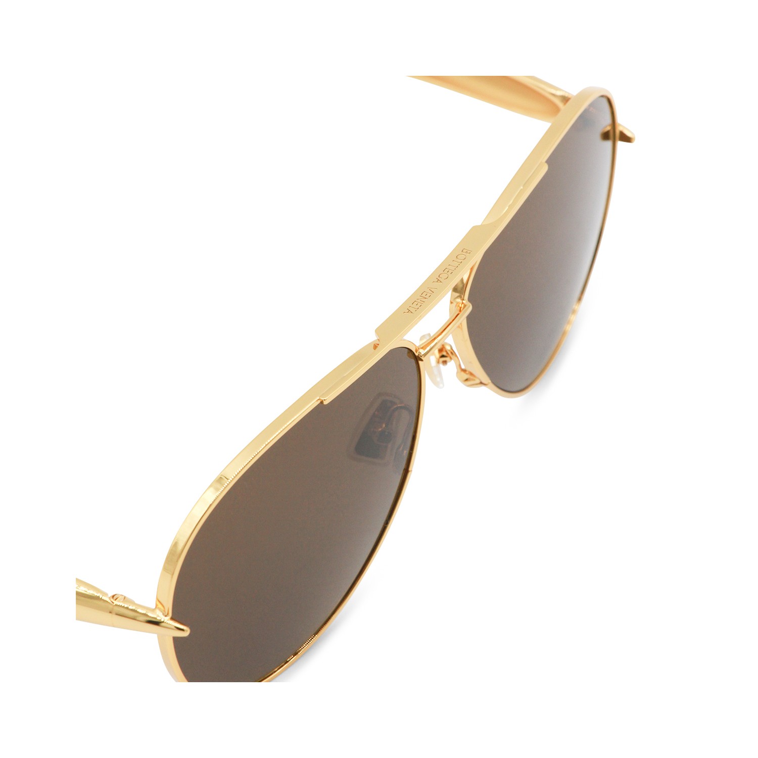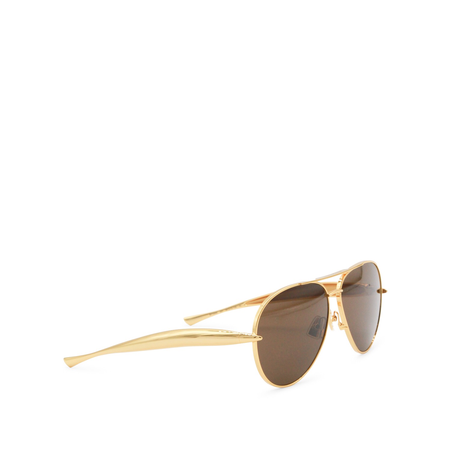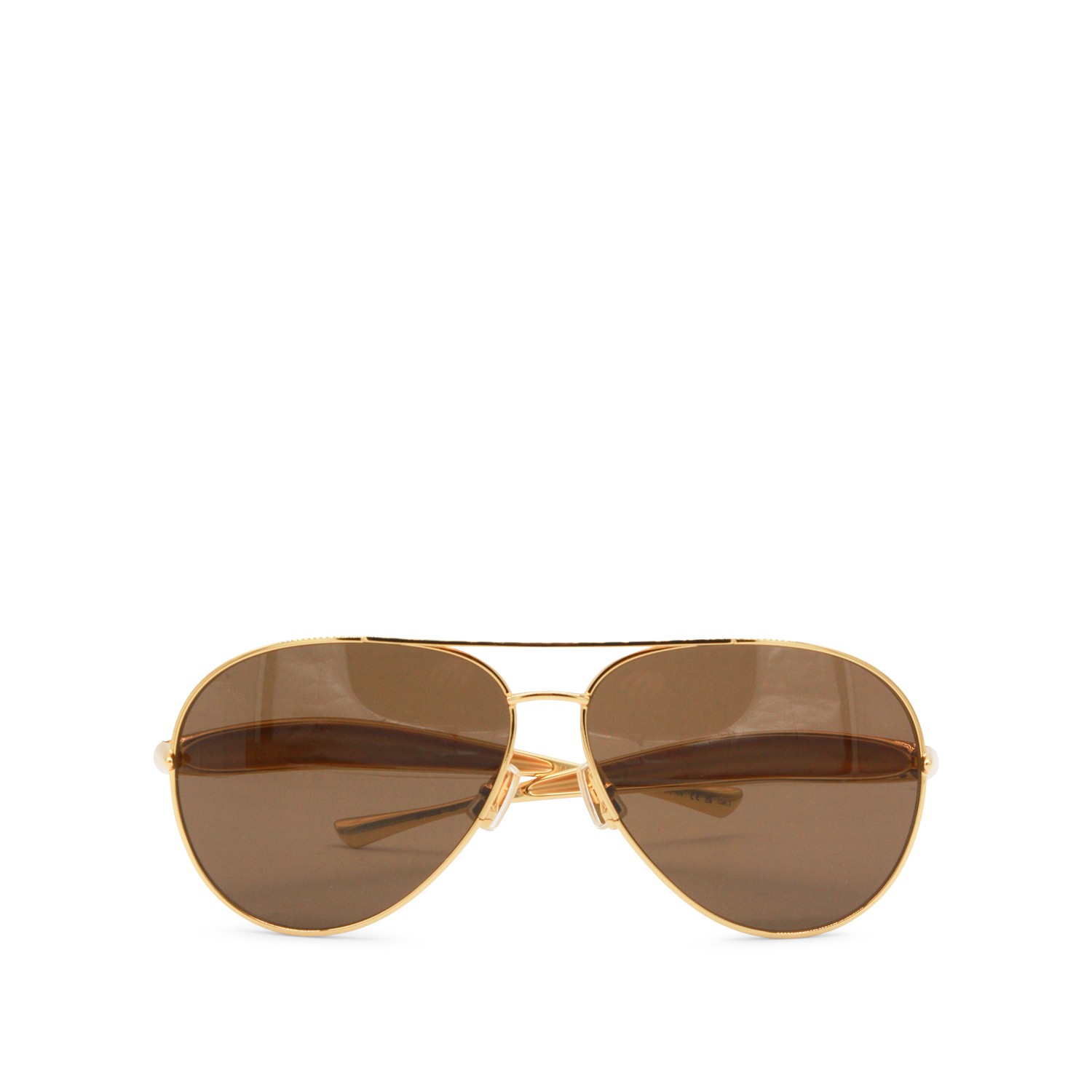 Gold metal sunglass from Bottega Veneta featuring aviator style, sardine shape on temples and brown lenses.