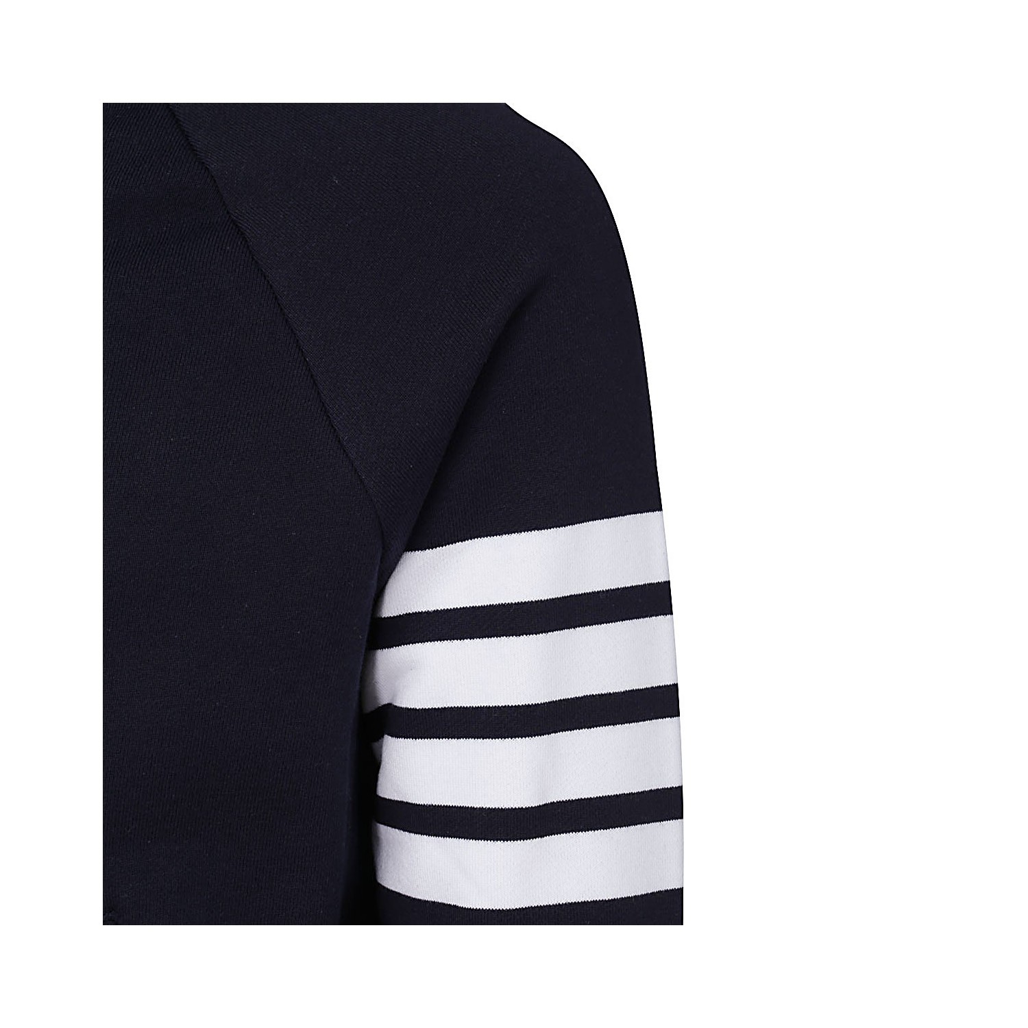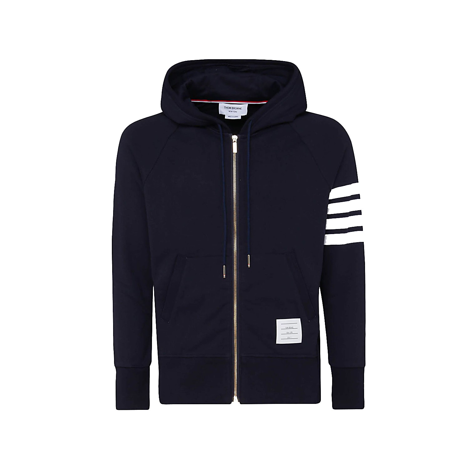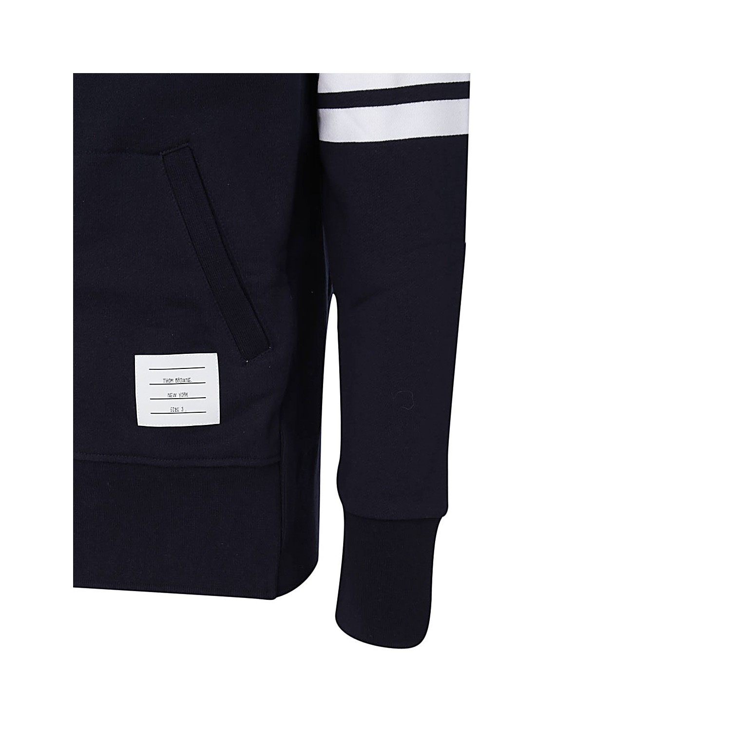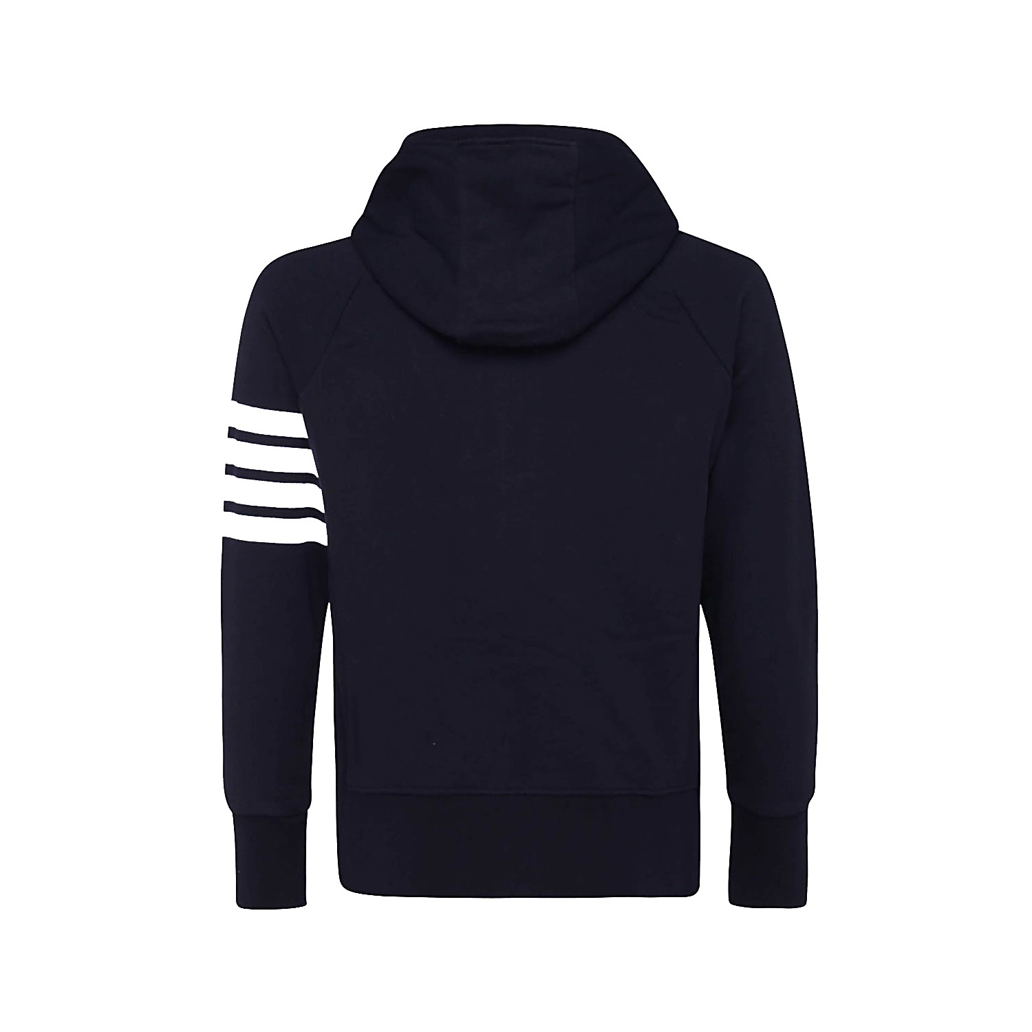 Navy cotton sweatshirt from Thom Browne featuring hood, zip fastening, long sleeves, pockets and regular vestibility.