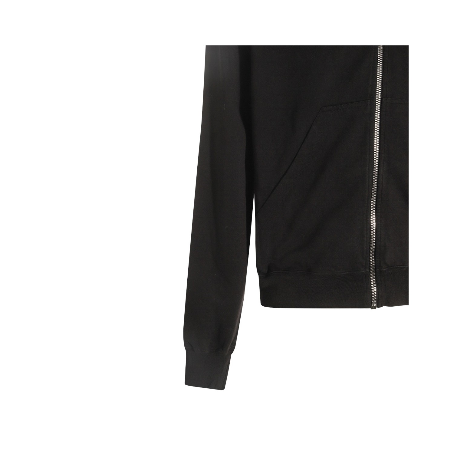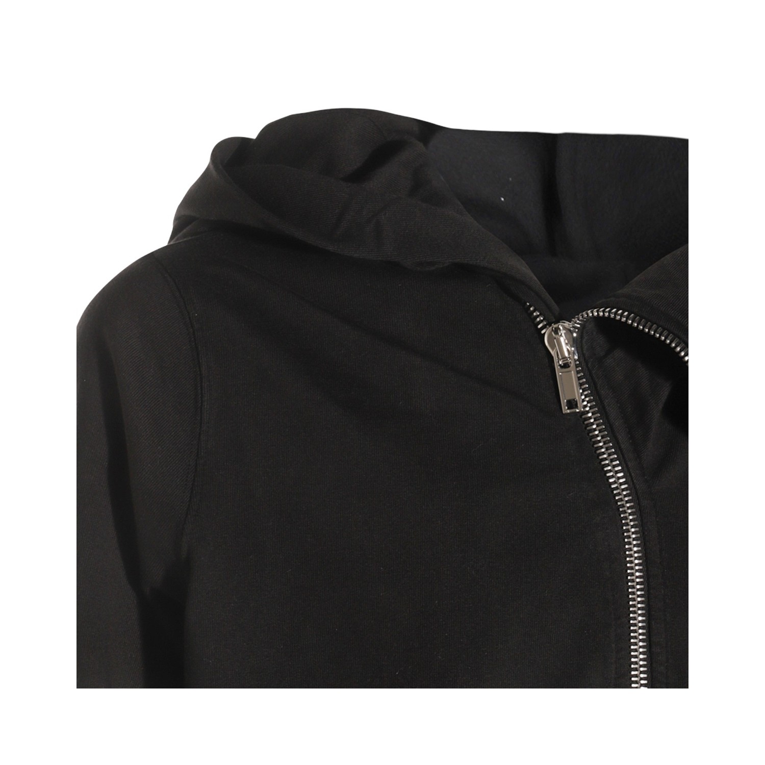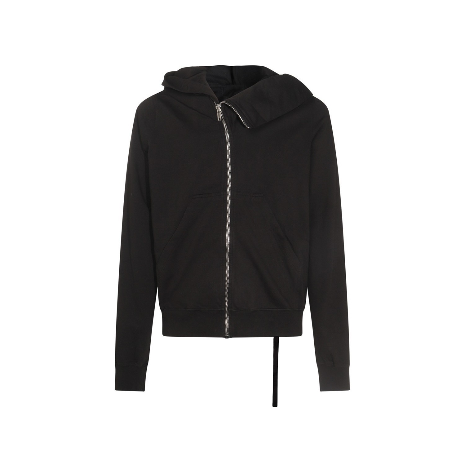 Black cotton mountain hoodie sweatshirt from Rick Owens DRKSHDW featuring long sleeves, silver tone metal hardware, hoodie, asymmetrial zip closure and kangaroo pockets.