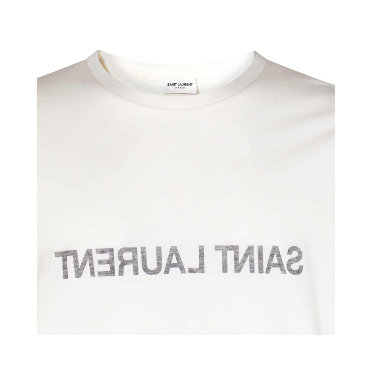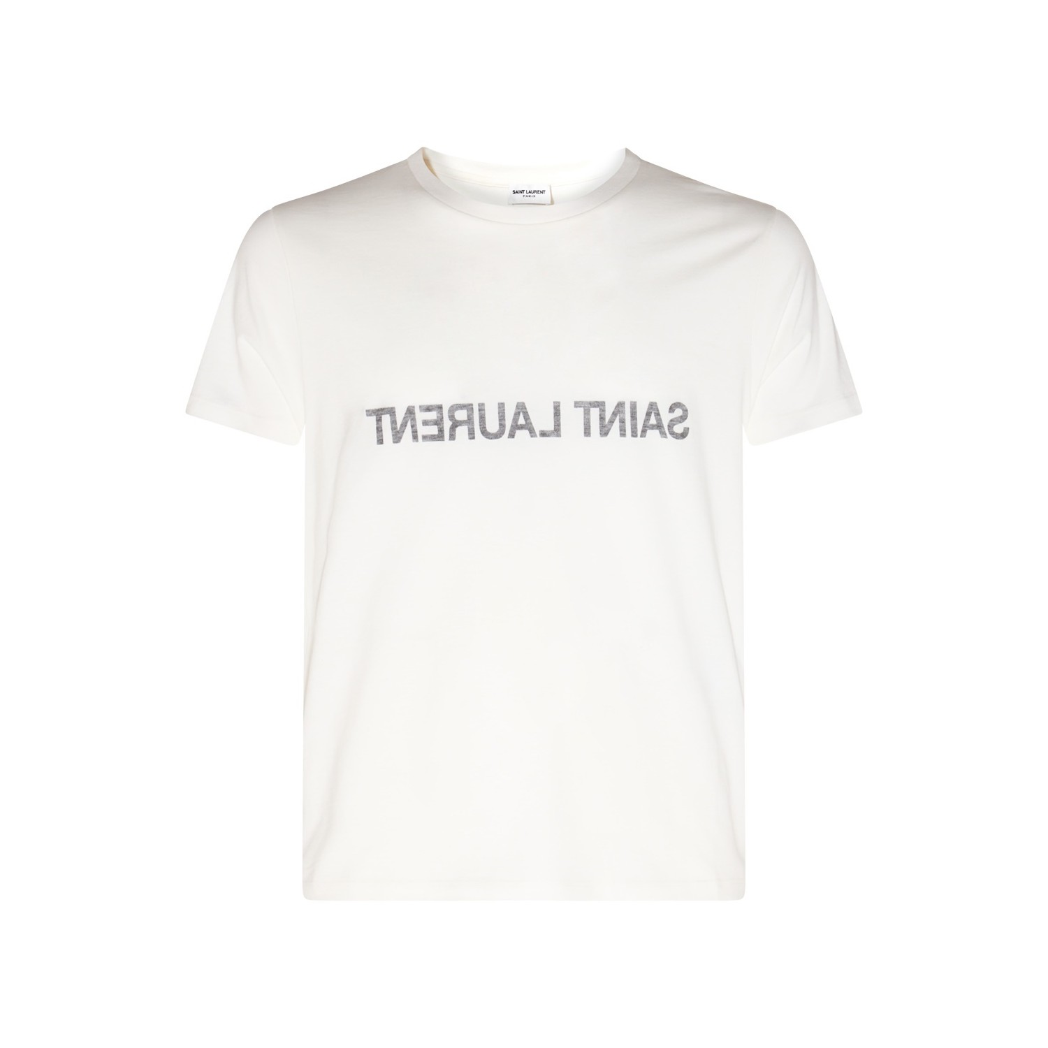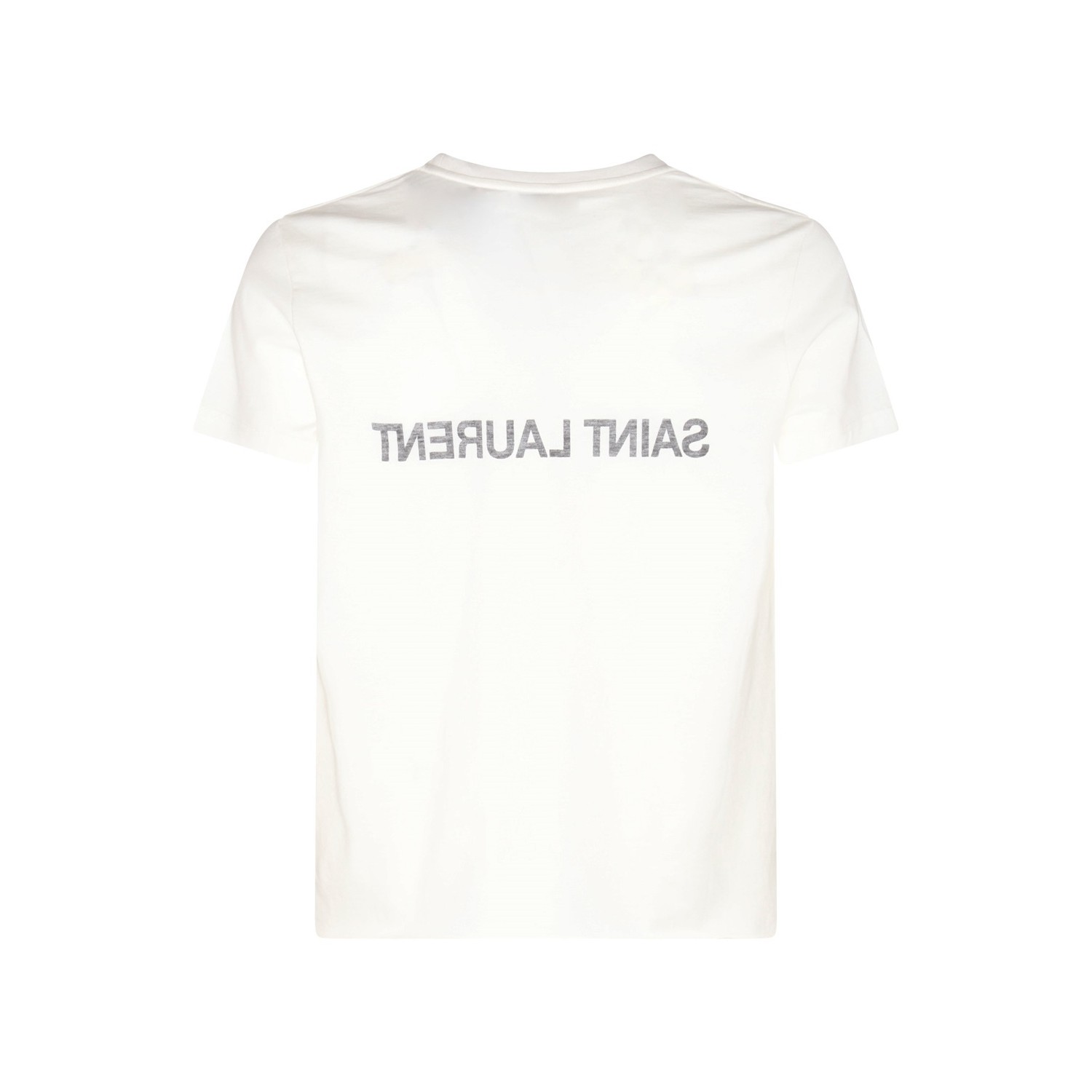 White cotton t-shirt from Saint Laurent featuring short sleeves, round collar, frontal logo print and regular vestibility.