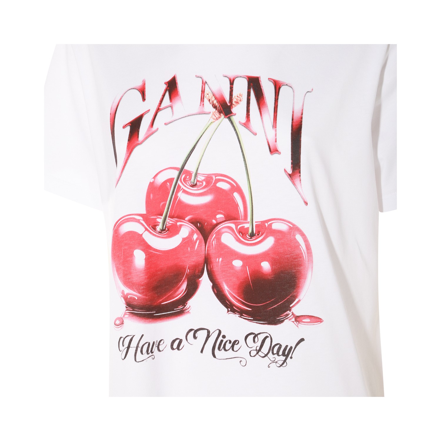 White cotton t-shirt from Ganni featuring round collar, short sleeves and frontal print.