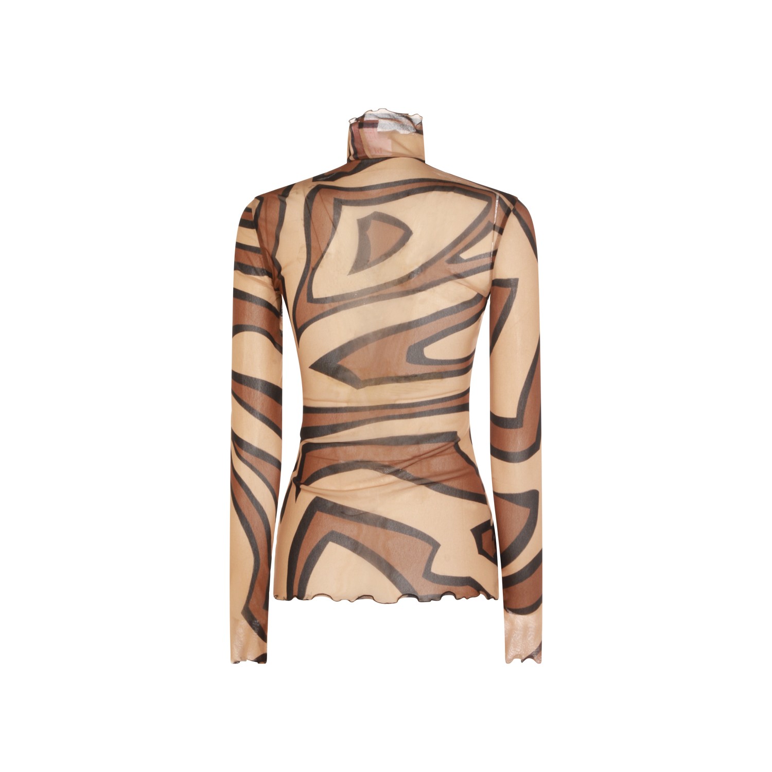 Beige and gold t-shirt from Emilio Pucci featuring long sleeves, high collar and print.